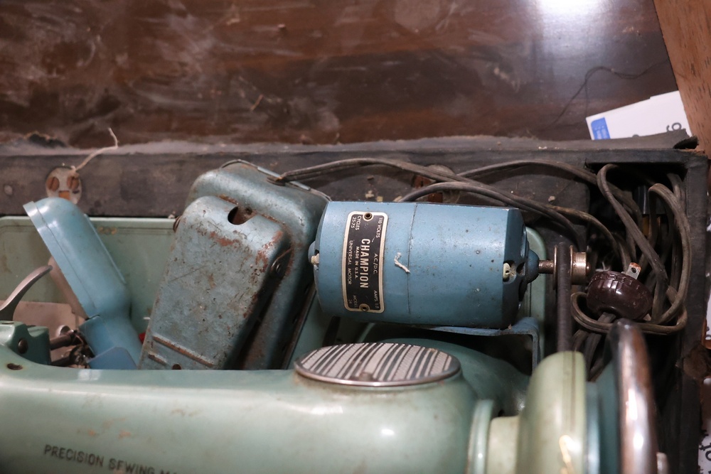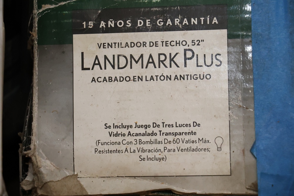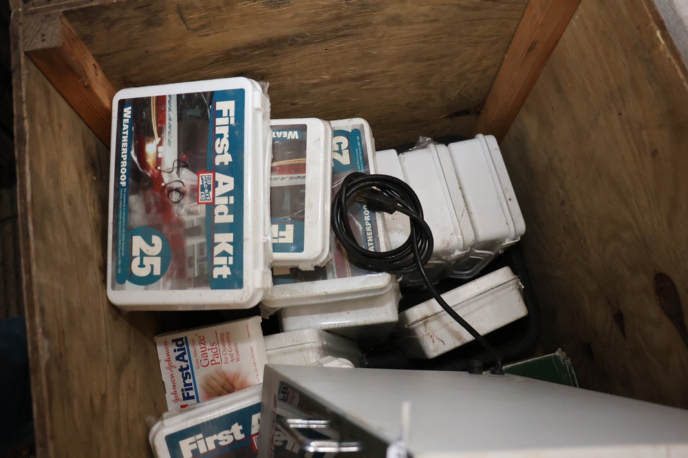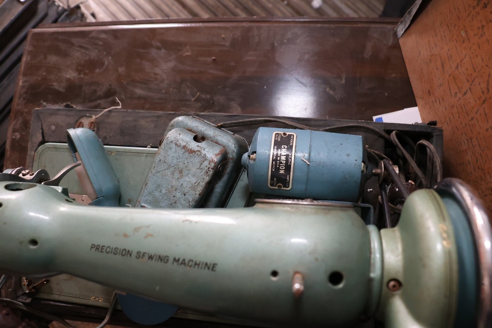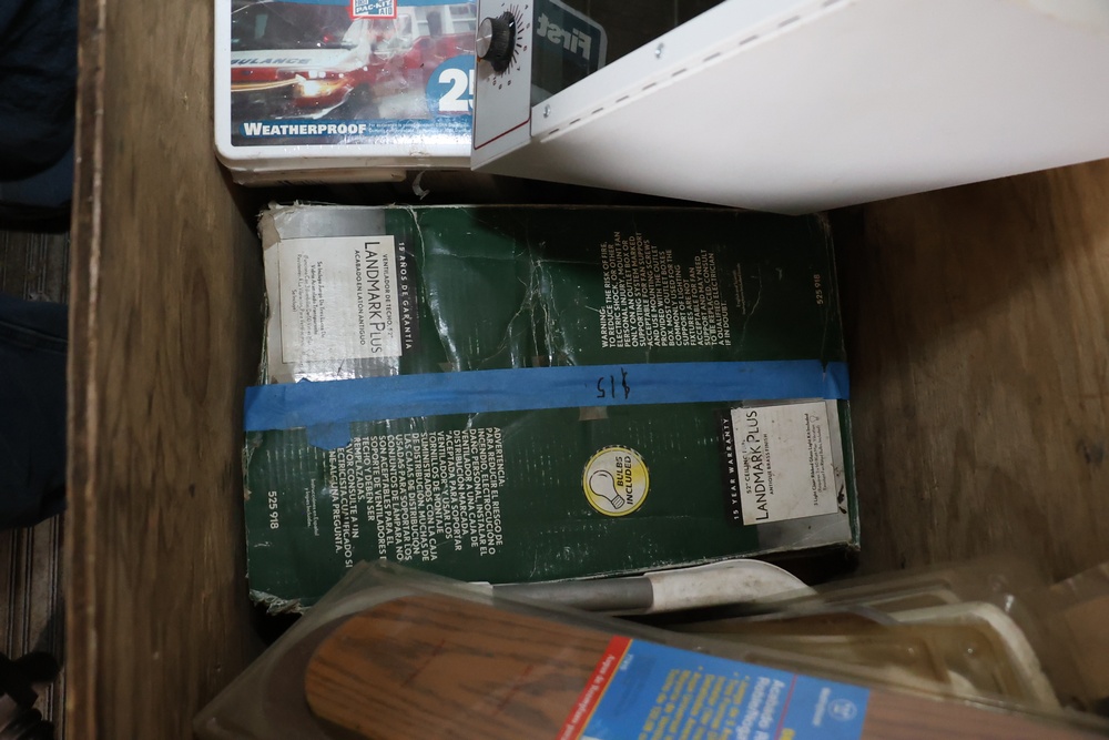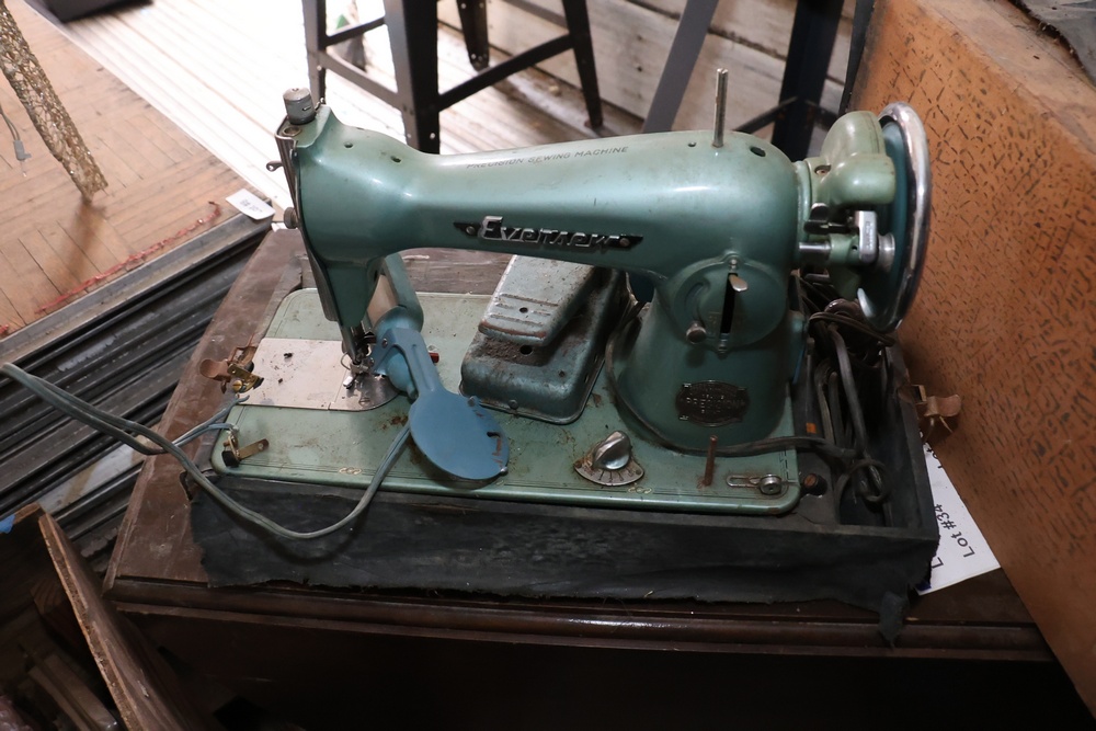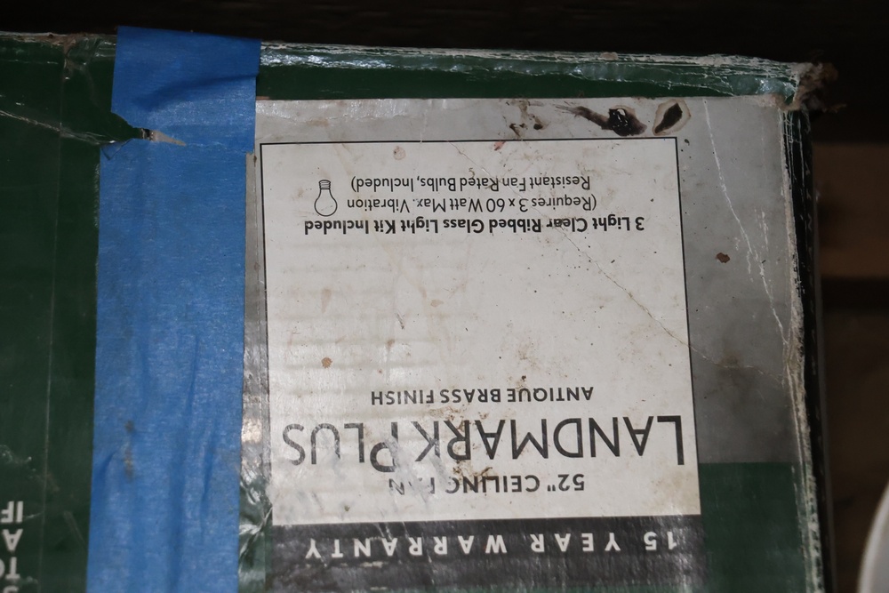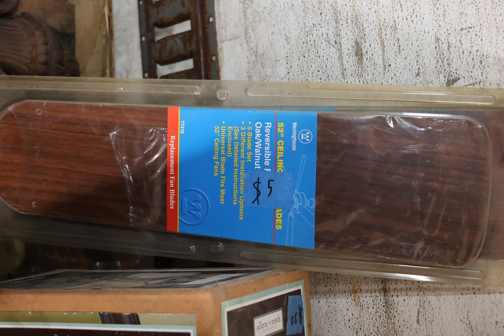 Mixed group of household and hardware items, including a Boekel laboratory oven (Model 139000), assorted waterproof first aid kits, an Allen + Roth wall sconce light fixture, Westinghouse 52" reversible ceiling fan blade set, assorted ceiling fan blade kits, a boxed Landmark Plus antique brass ceiling fan. Also included are various lighting components, decorative hardware, Vintage Sewing Machine Evernice brand With Champion motor, appears complete, Nat Sherman Tobacco Display Case – Glass/wood retail-style cabinet, and a cast metal wall décor piece.