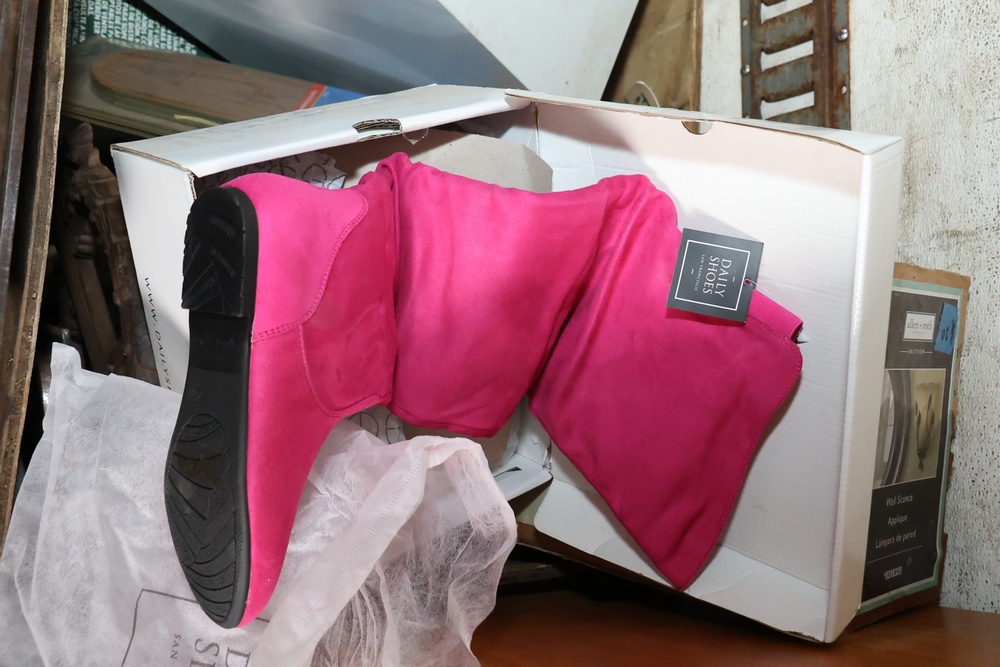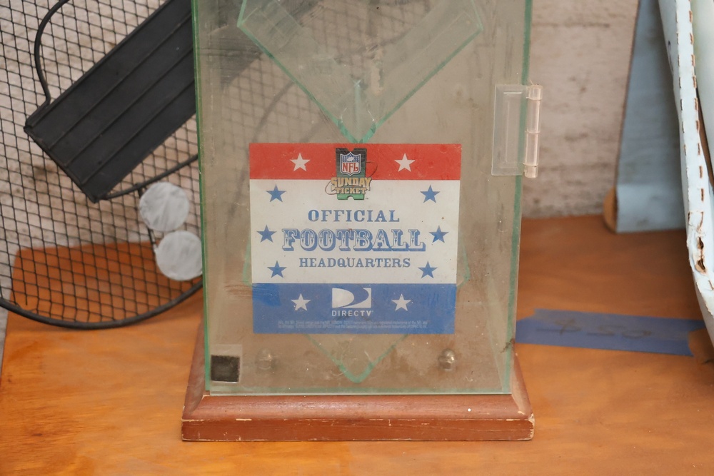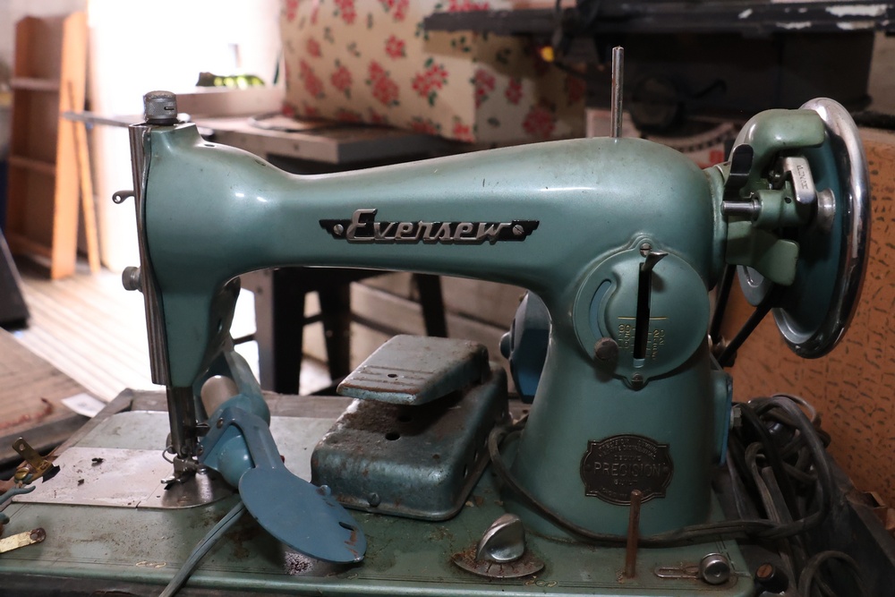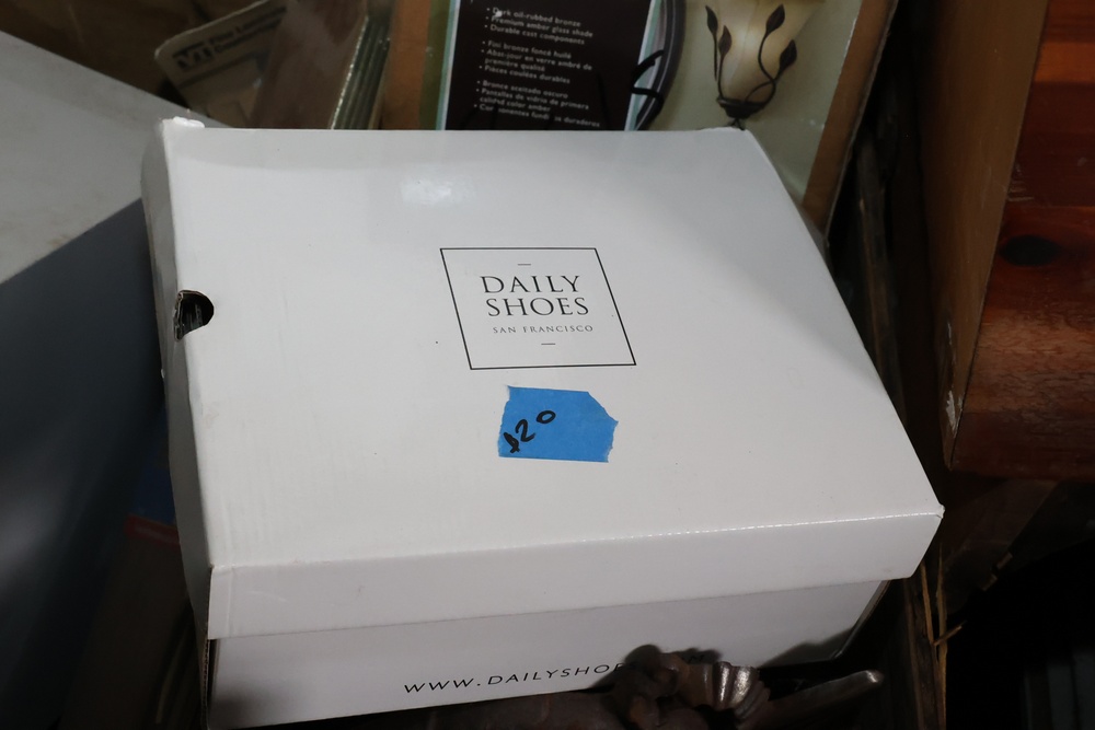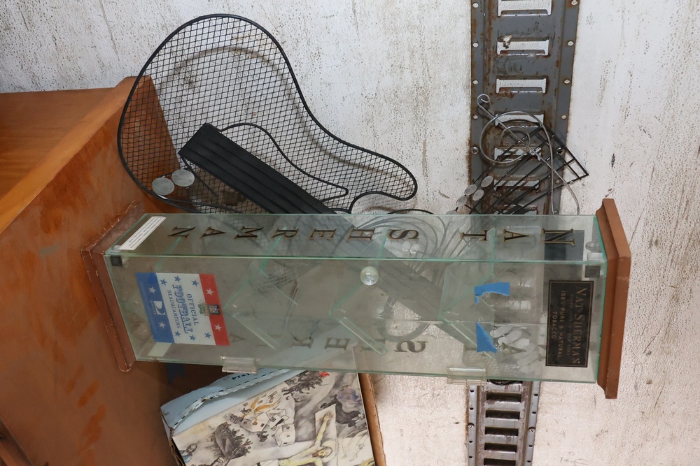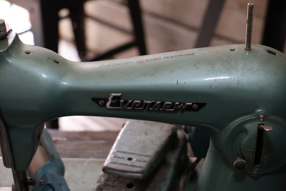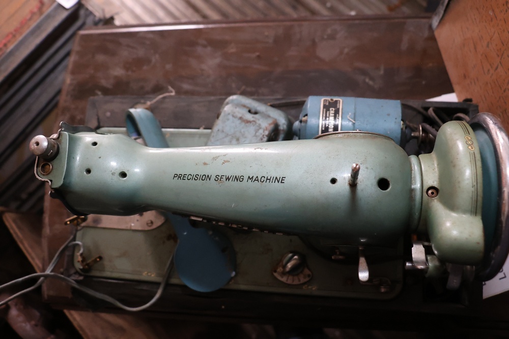 Mixed group of household and hardware items, including a Boekel laboratory oven (Model 139000), assorted waterproof first aid kits, an Allen + Roth wall sconce light fixture, Westinghouse 52" reversible ceiling fan blade set, assorted ceiling fan blade kits, a boxed Landmark Plus antique brass ceiling fan. Also included are various lighting components, decorative hardware, Vintage Sewing Machine Evernice brand With Champion motor, appears complete, Nat Sherman Tobacco Display Case – Glass/wood retail-style cabinet, and a cast metal wall décor piece.