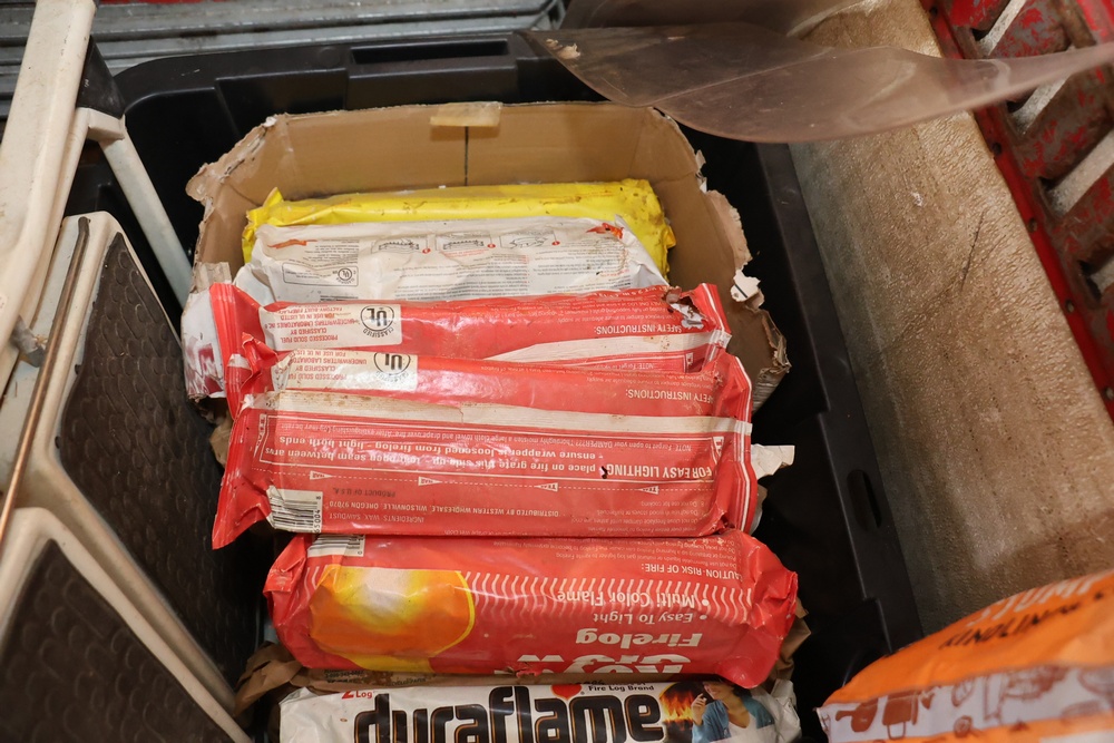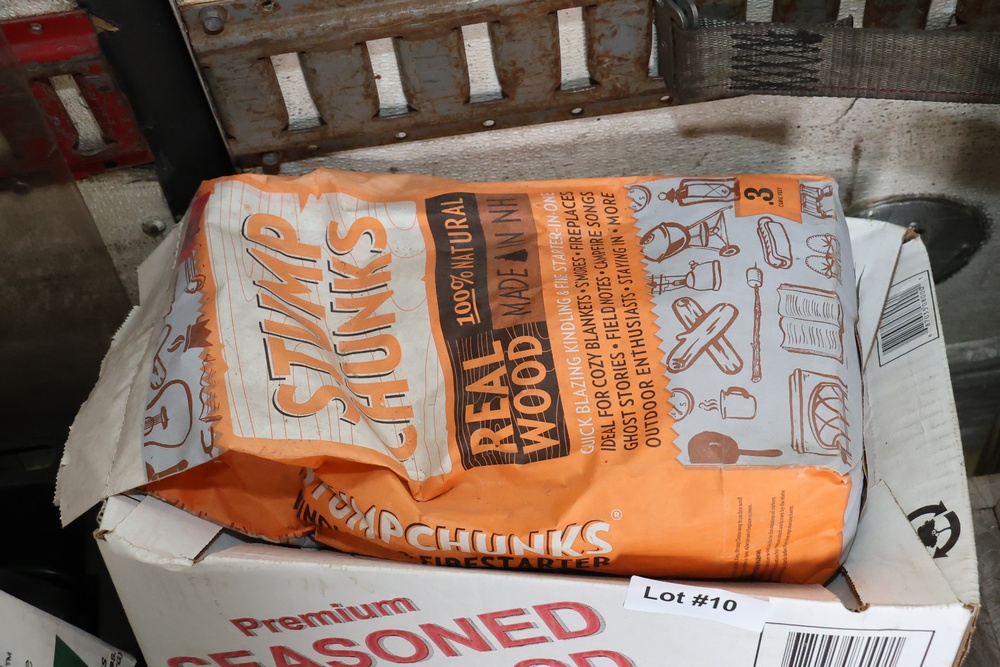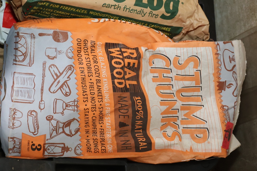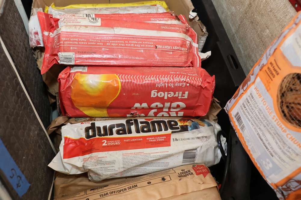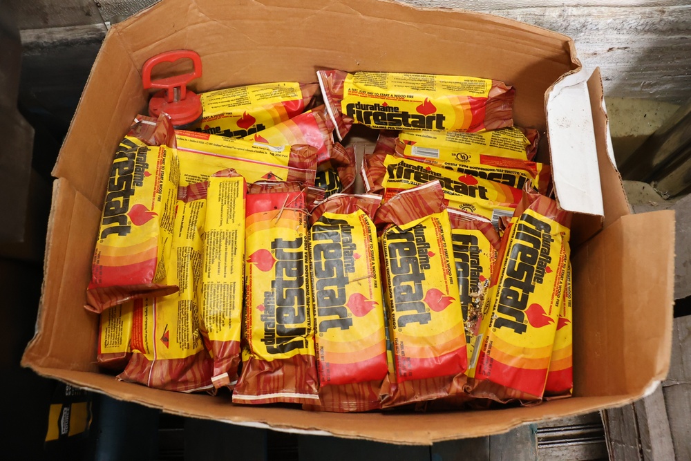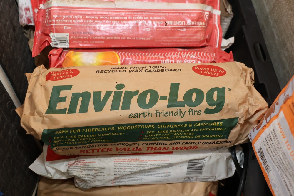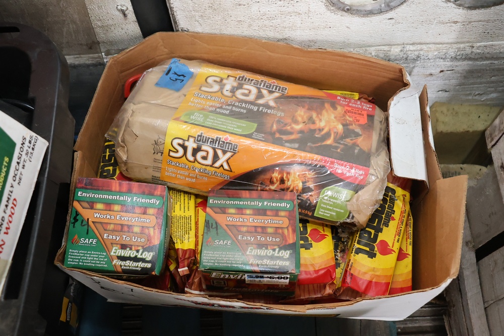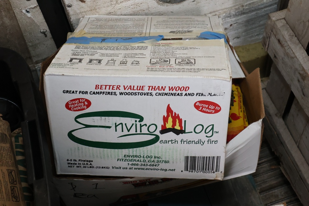 Large assortment of fire-starting supplies including Duraflame Firestart logs, Enviro-Log earth-friendly firelogs, and Stump Chunks natural kindling. Ideal for fireplaces, woodstoves, campfires, and other heating or cooking uses, this collection offers various brands and types of logs and starters to suit different needs.