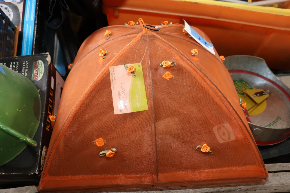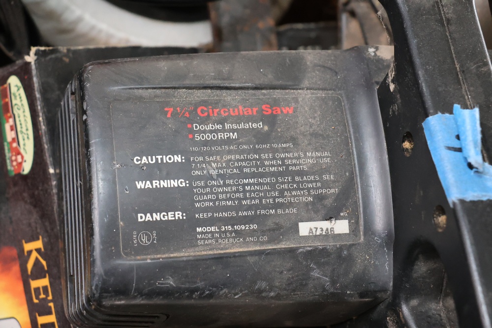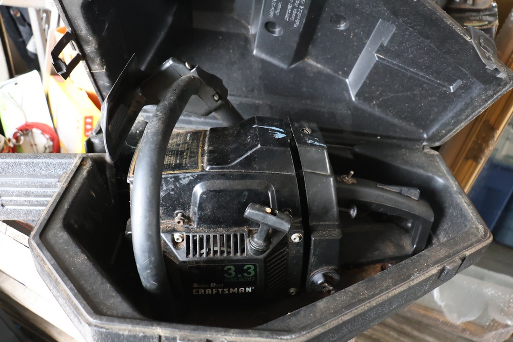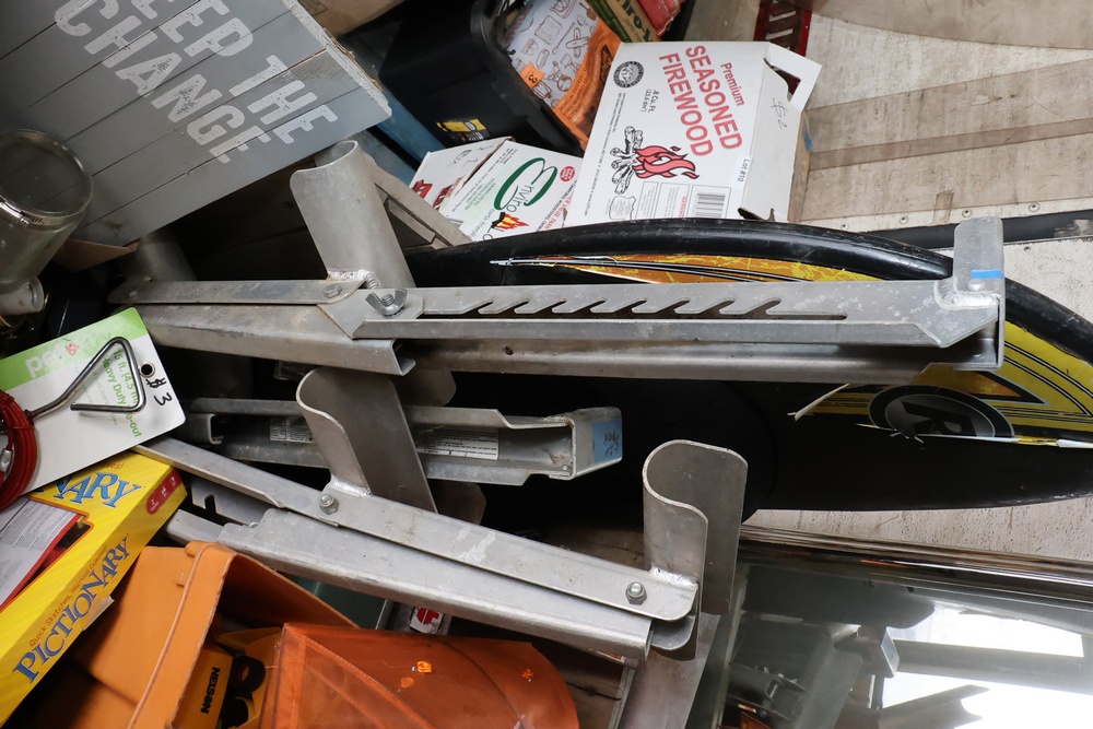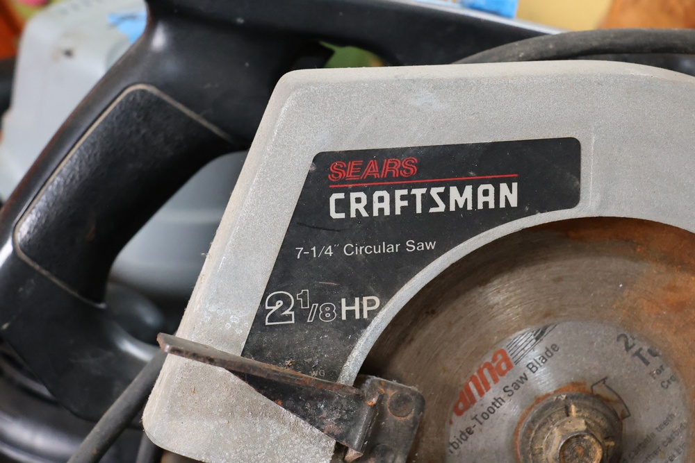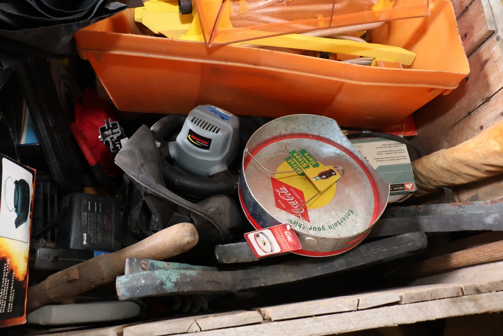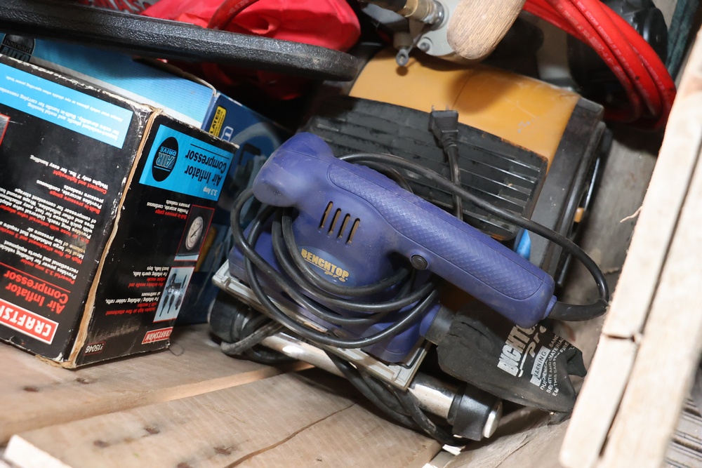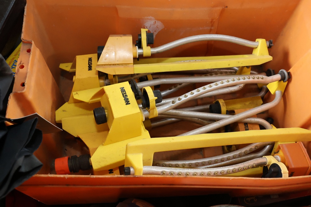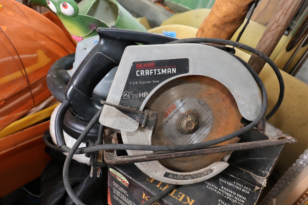Assorted household and garden items, including a 10" polisher/buffer, benchtop pro sander, Sears Craftsman circular saw, chainsaw, ladder jacks, multiple Nelson oscillating sprinklers, and decorative cast iron kettles. Also included are novelty items like a frog watering can, food covers, a Pictionary game, assorted tools, and various hardware and utility accessories.