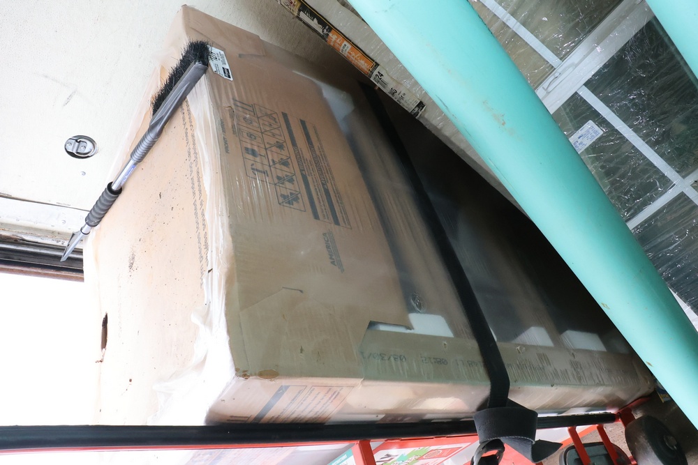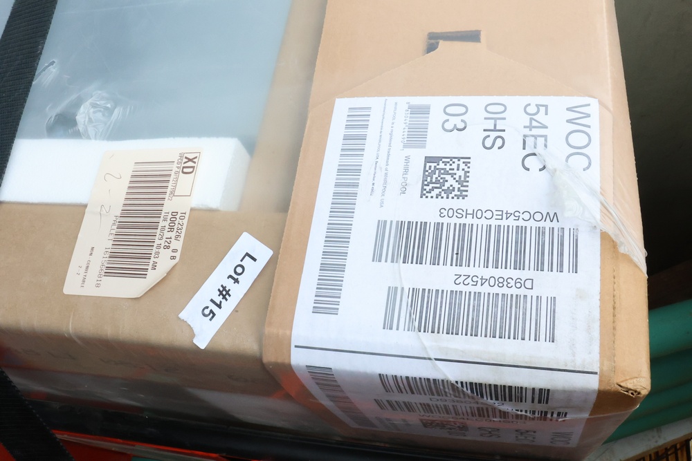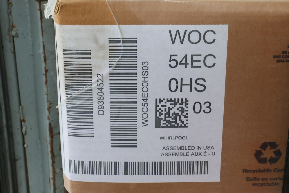 Whirlpool 6.4 cu. ft. Smart Combination Wall Oven with Touchscreen model WOC54EC0HS03, assembled in the USA. The item is securely packaged in its original box with manufacturer and shipping labels intact.