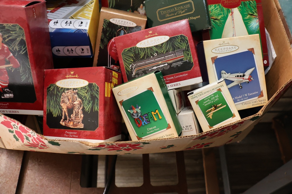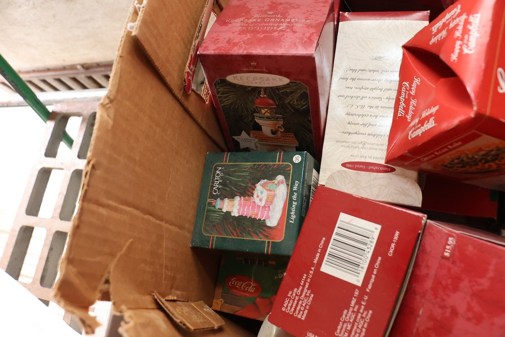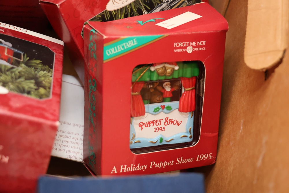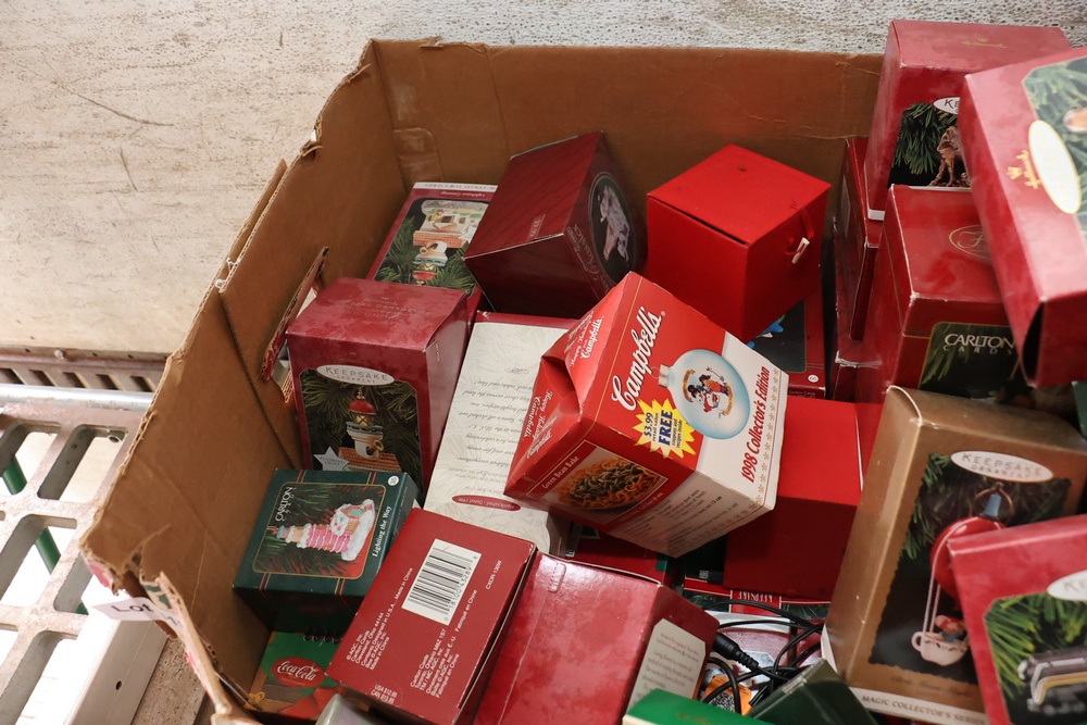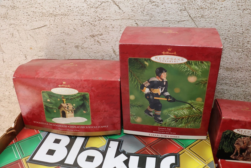 Keepsake ornaments in boxes including Jaromir Jagr Hockey Greats, Woodstock on doghouse, Campbells 1998 collectors edition, A Holiday Puppet Show 1995, etc.