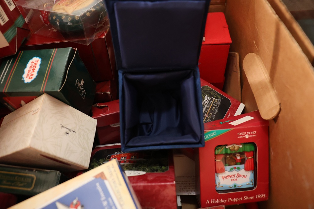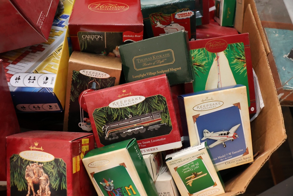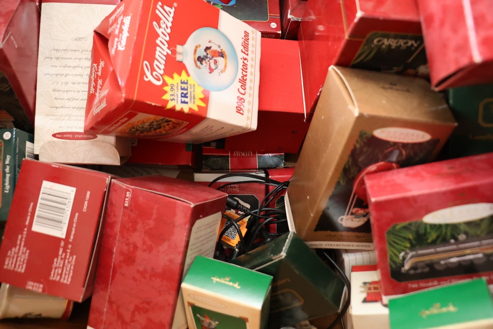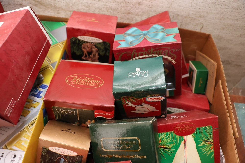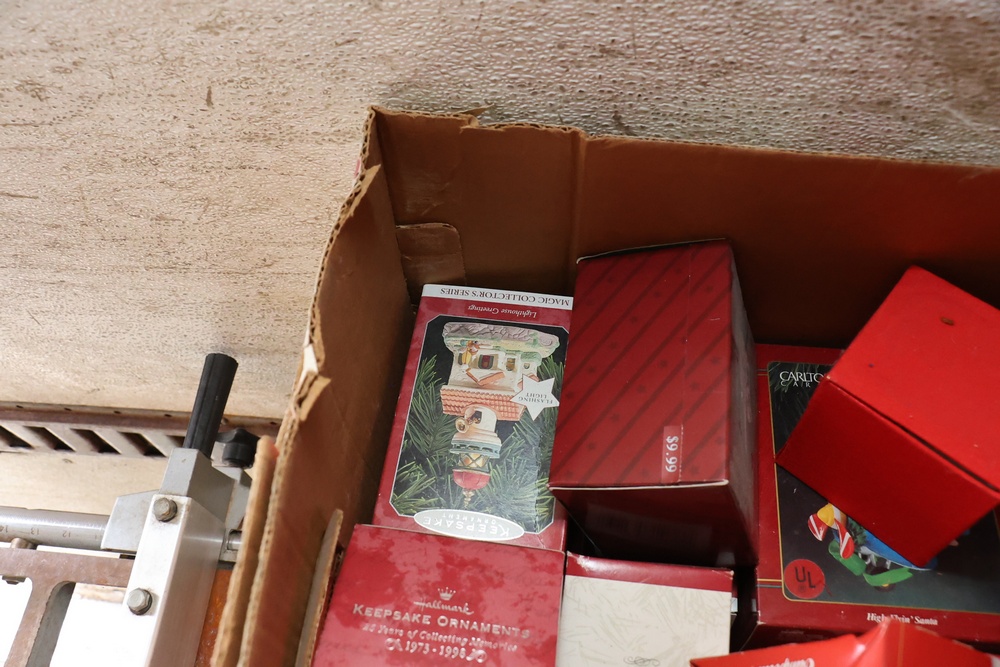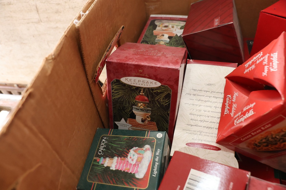 Keepsake ornaments in boxes including Jaromir Jagr Hockey Greats, Woodstock on doghouse, Campbells 1998 collectors edition, A Holiday Puppet Show 1995, etc.
