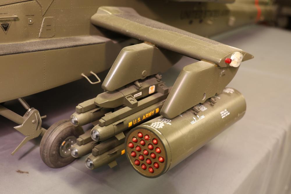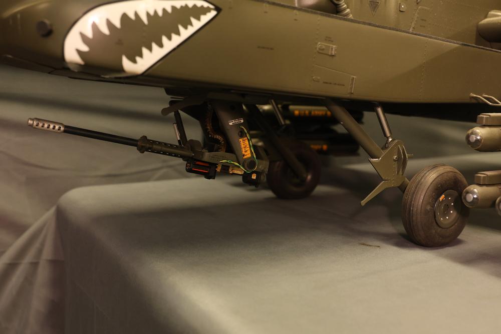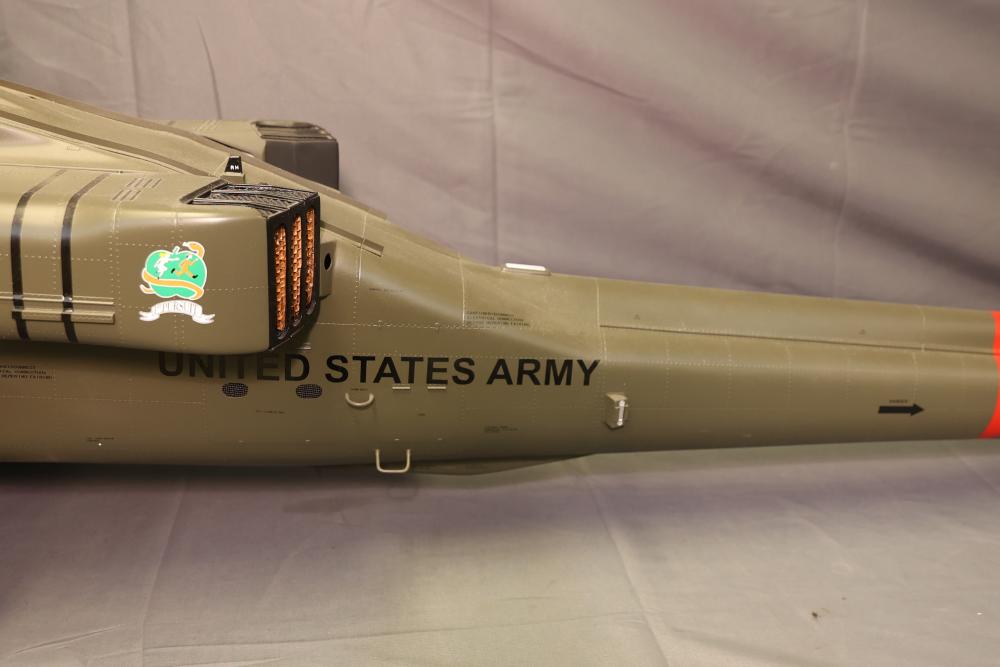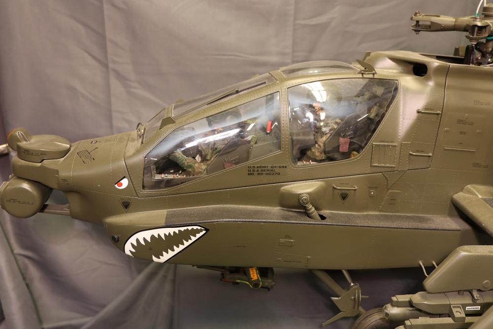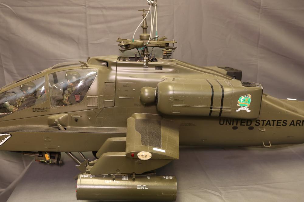 Remote-controlled scale model replica of the U.S. Army AH-64A Apache helicopter featuring intricate detailing. Includes cockpit, mounted weapons, fully operational rotors, and small painted details with accurate decals. Electronics visible within open components. Seller reports "With charged battery and paired with a controller, this will fly". Pickup only.