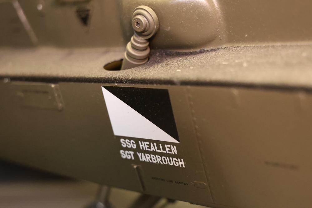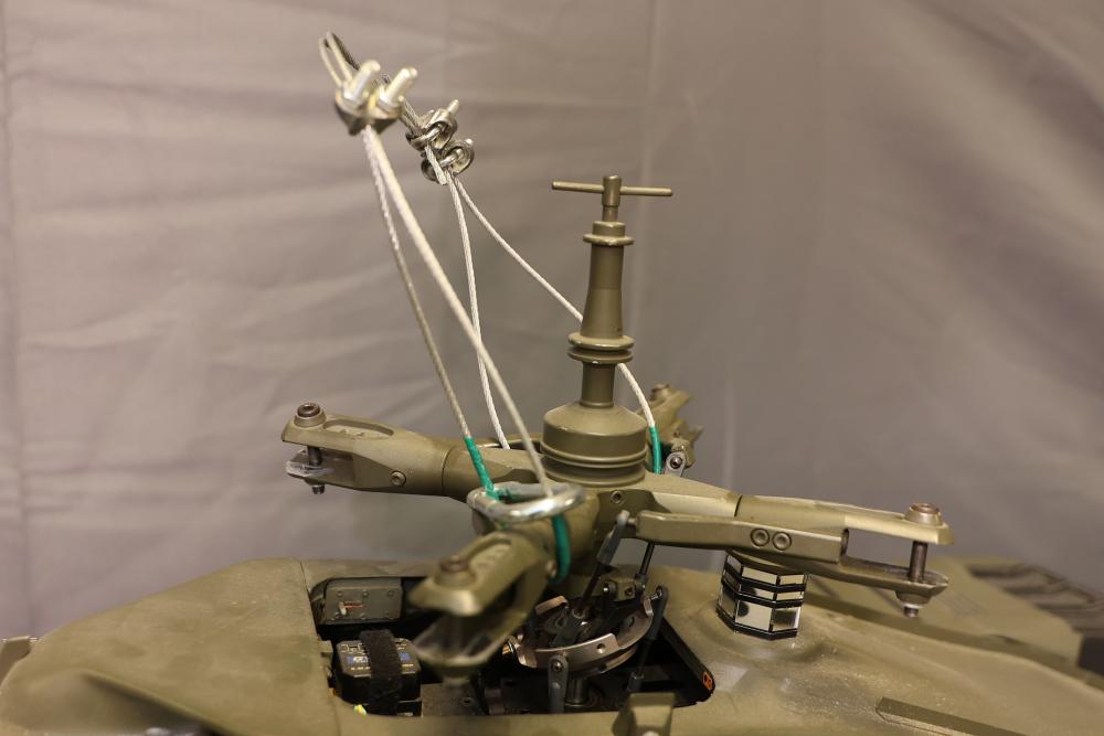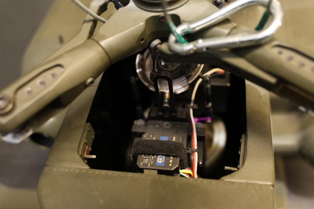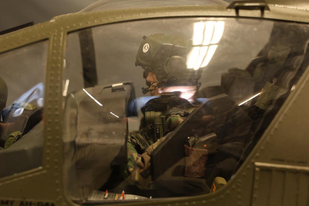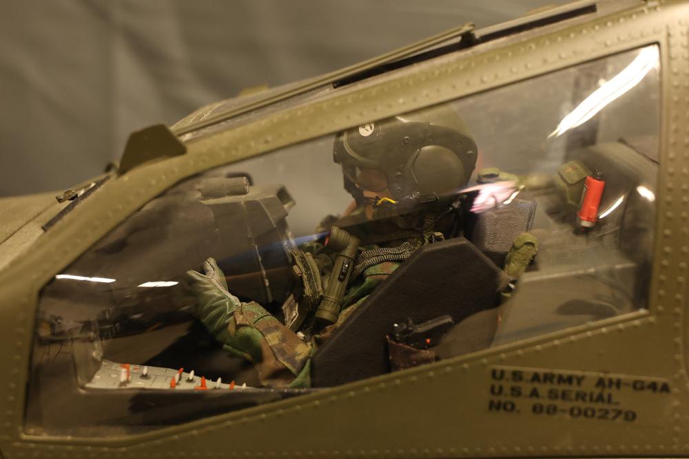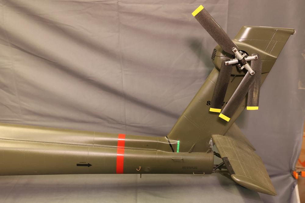 Remote-controlled scale model replica of the U.S. Army AH-64A Apache helicopter featuring intricate detailing. Includes cockpit, mounted weapons, fully operational rotors, and small painted details with accurate decals. Electronics visible within open components. Seller reports "With charged battery and paired with a controller, this will fly". Pickup only.
