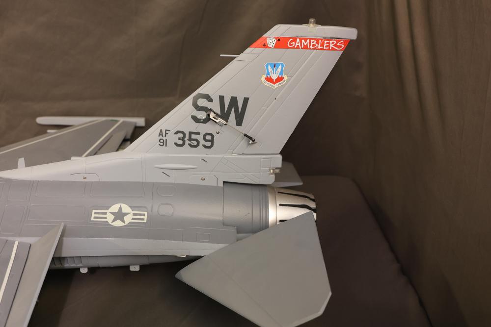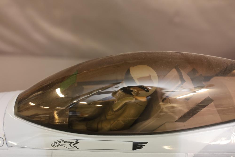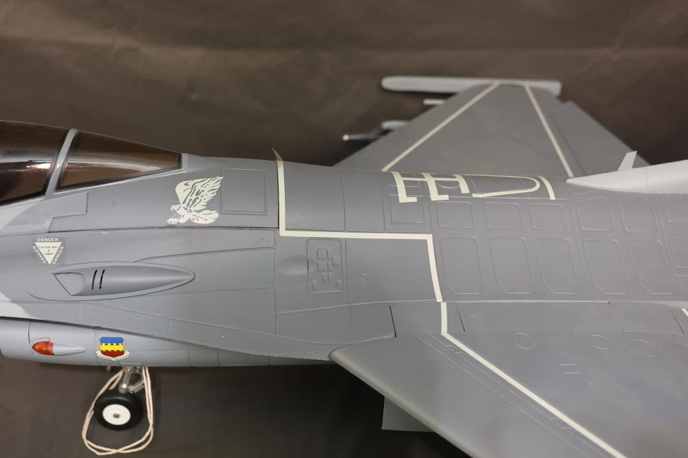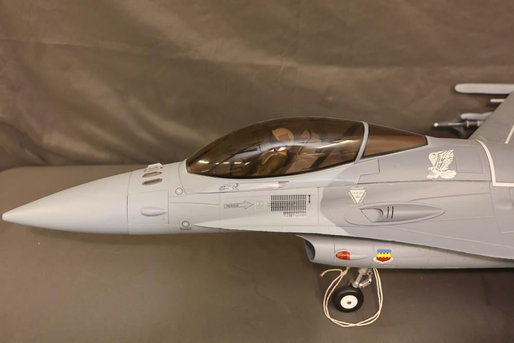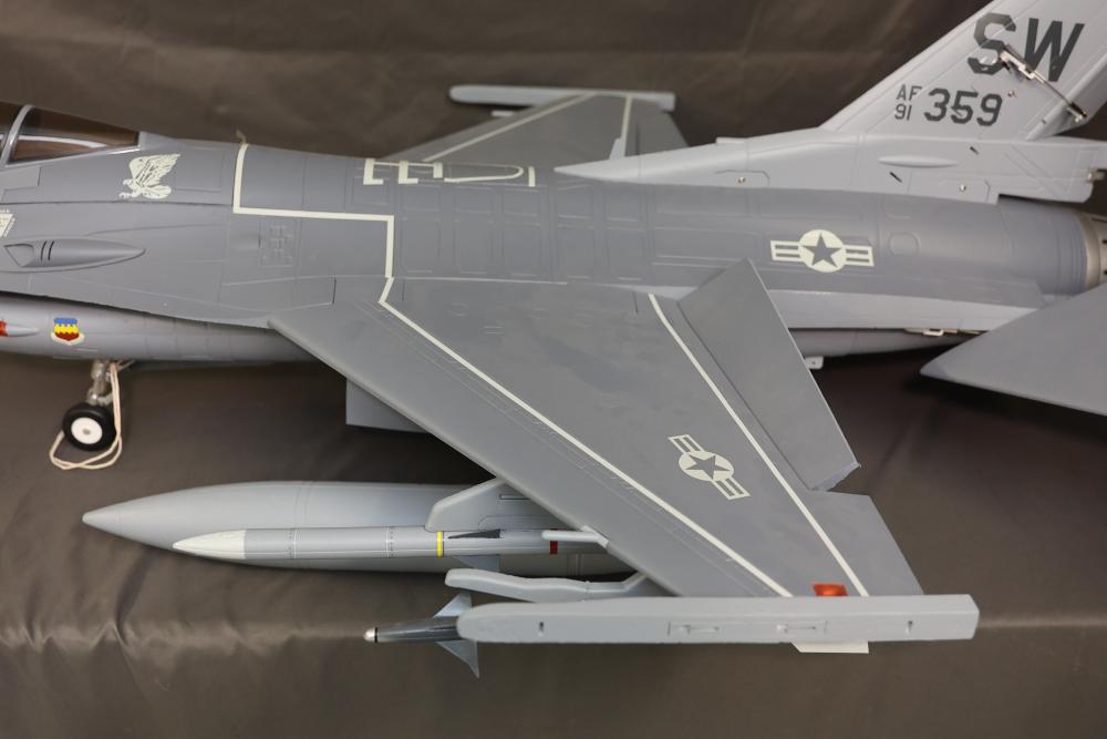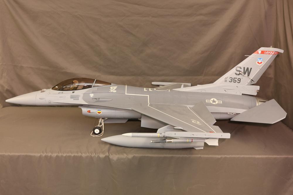 90mm High performance R/C Jet from Freewing F-16 jet Radio Controlled (RC) model featuring detailed landing gear, painted exterior, and weaponry fixtures. Includes a clear cockpit canopy revealing a pilot figure inside. Features internal wiring and structural components visible in several sections. The model is designed with precision and craftsmanship to replicate the iconic F-16 aircraft. Pickup only.