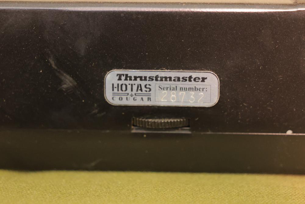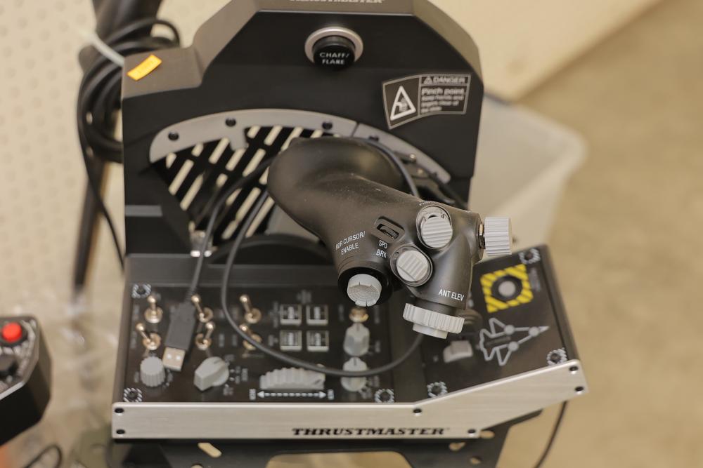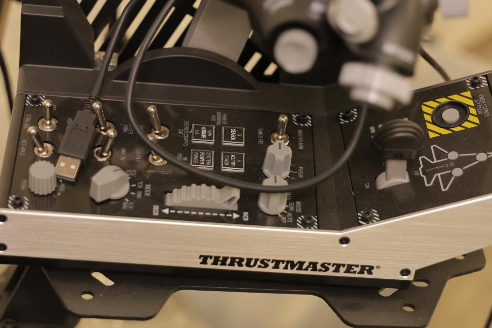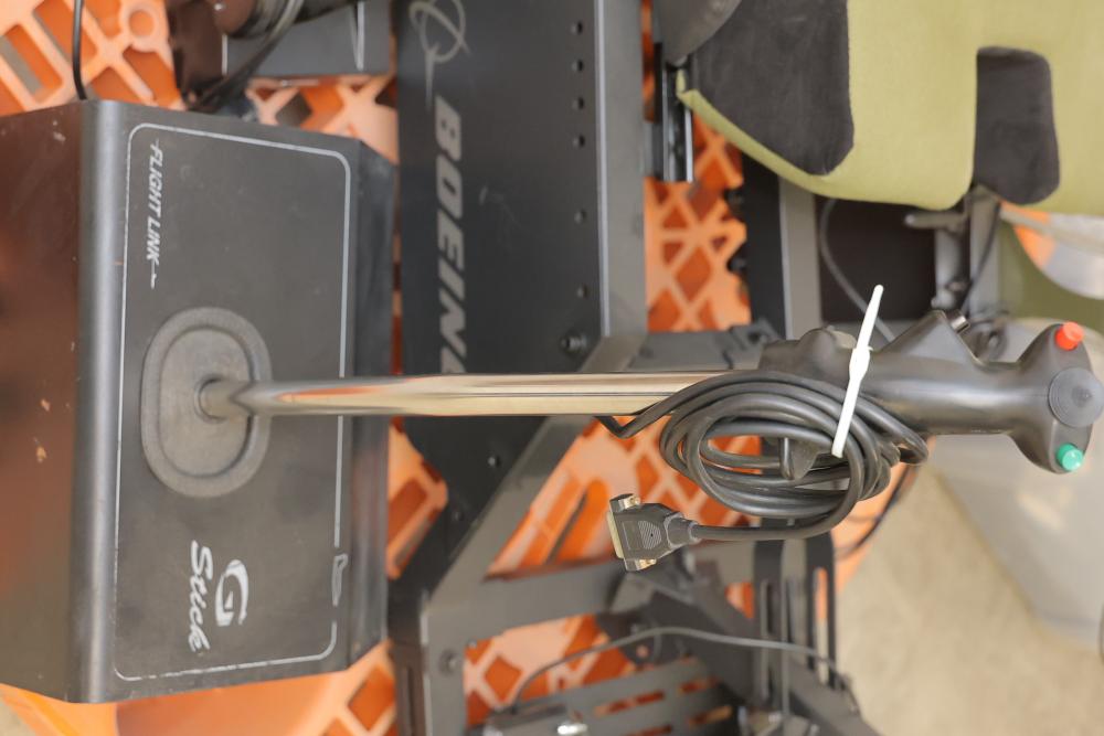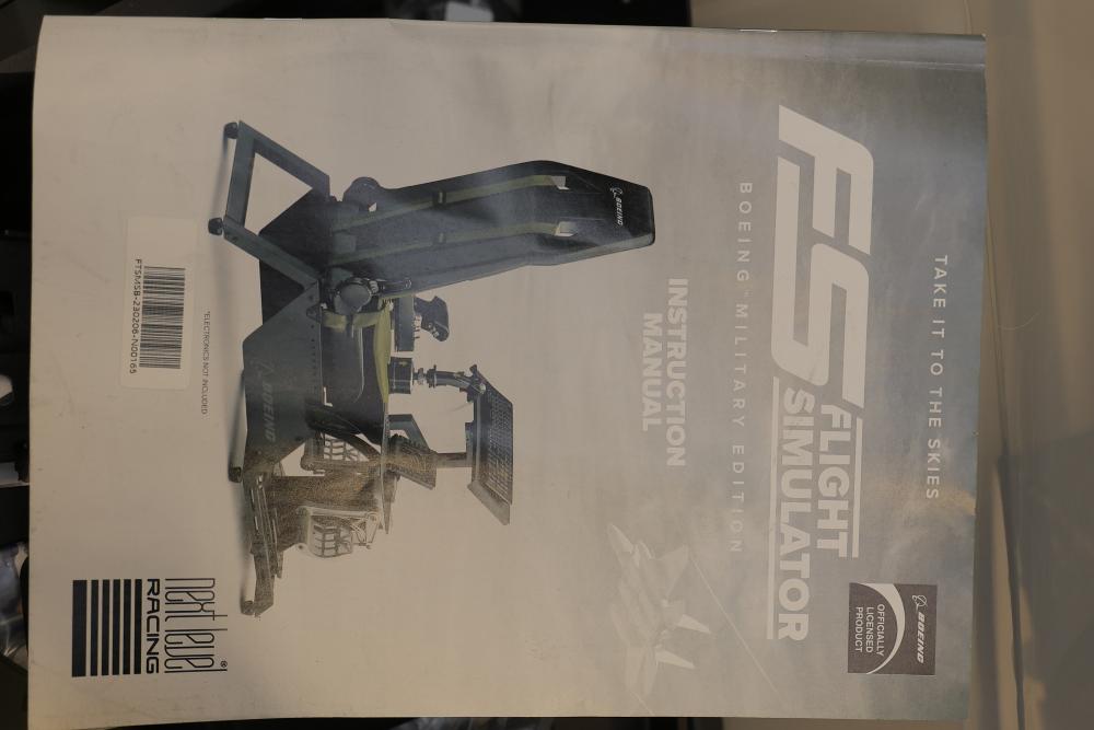 Boeing-themed flight simulator setup includes a detailed cockpit chair, manuals, Saitek rudder pedals, Thrustmaster throttle quadrant, Flight Link G-1 hardware, and Virpil USB joystick for PC. Includes cables, additional manual switches, and accessories for aviation simulation. Condition shows signs of prior use. Pickup only.