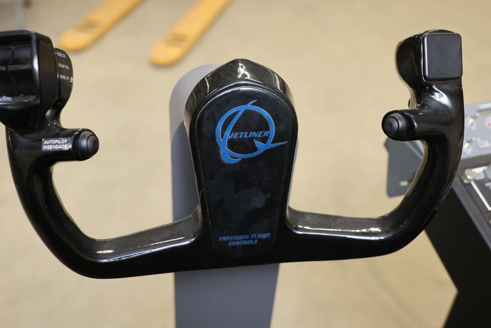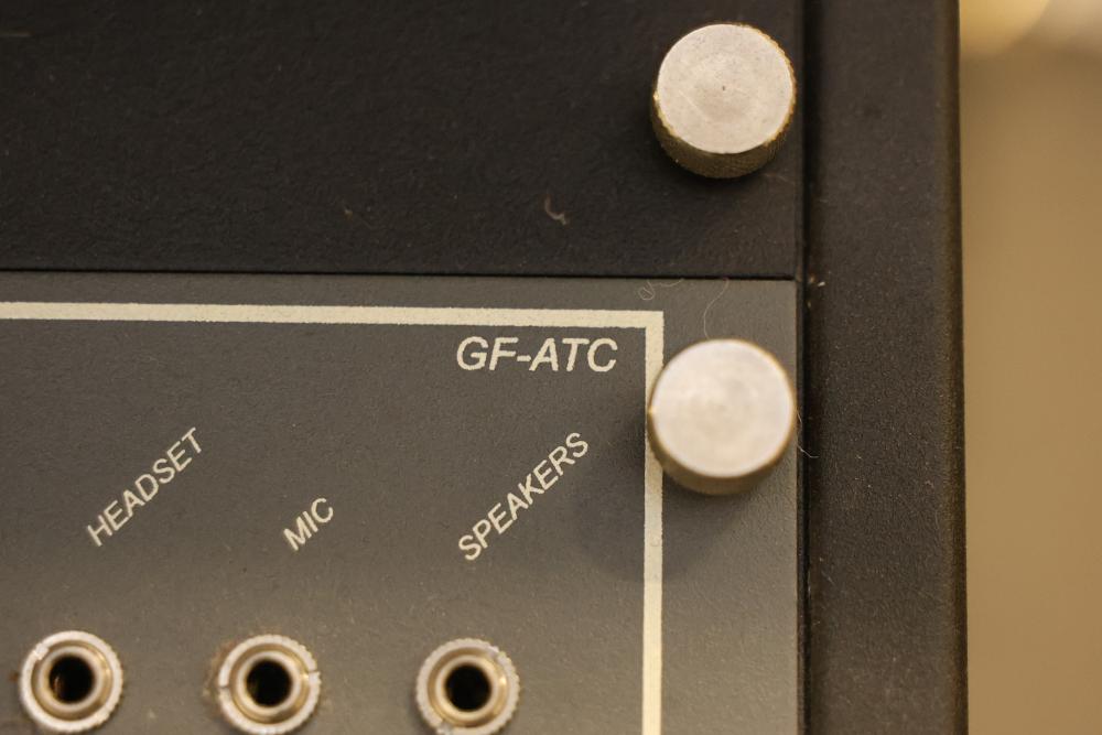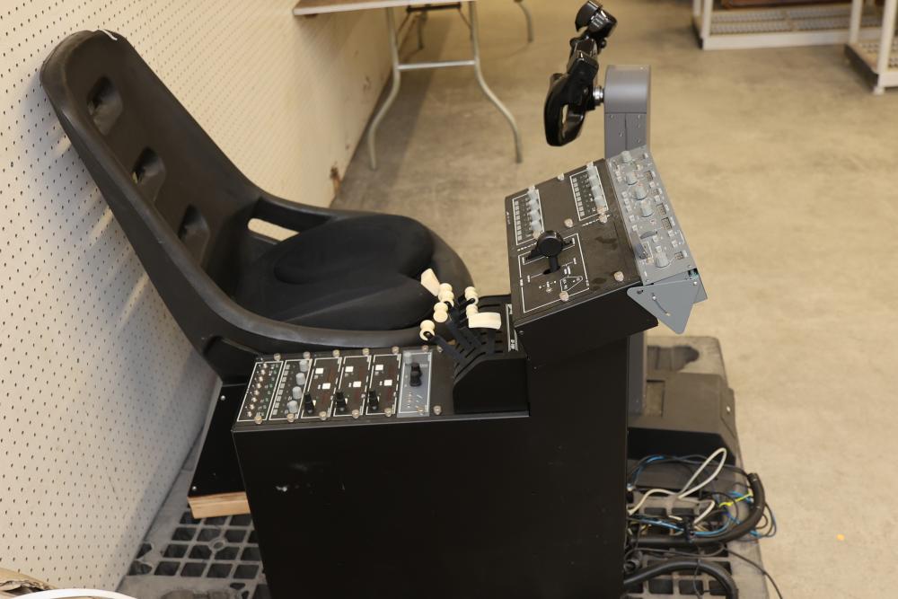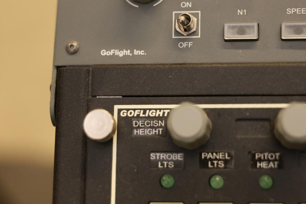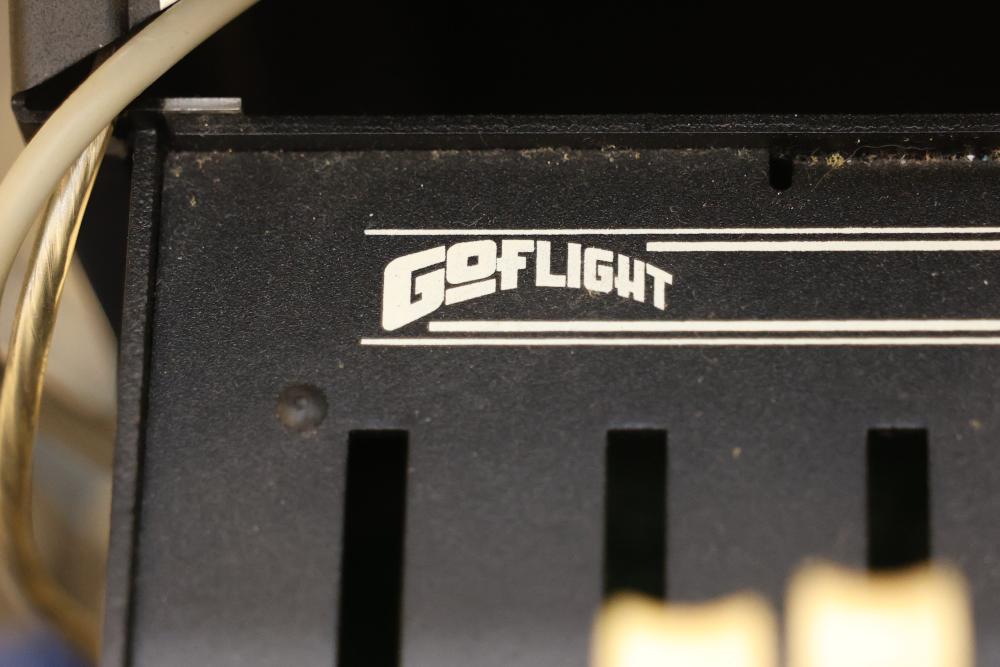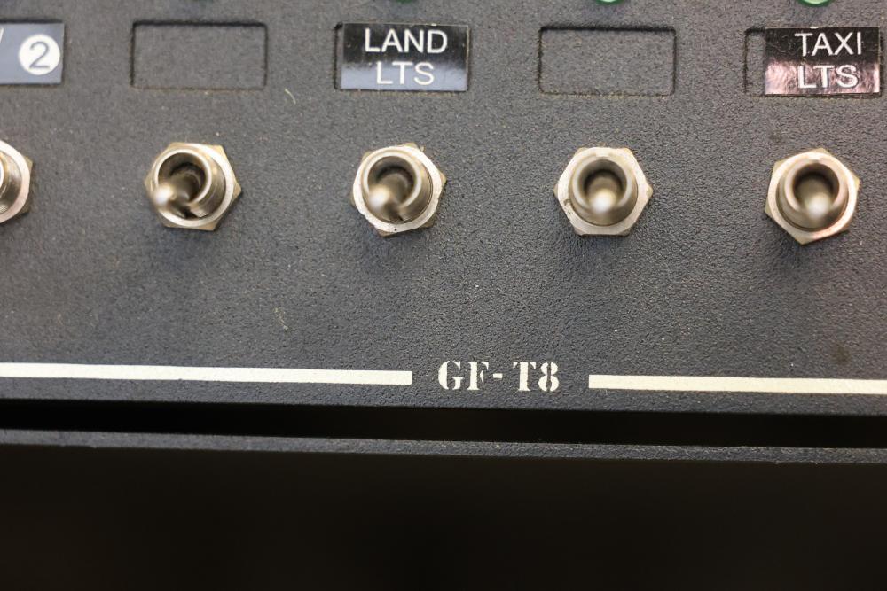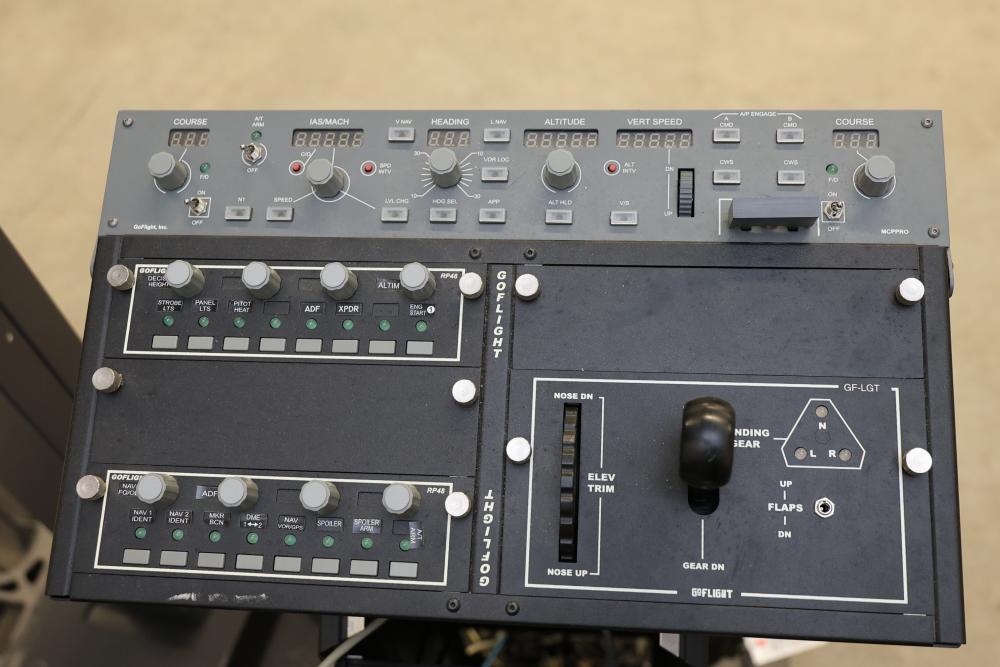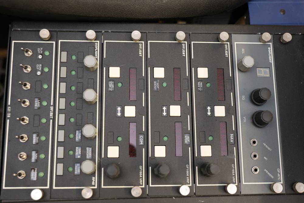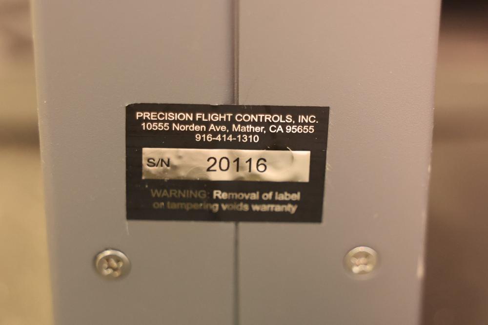 Precision Flight Controls flight simulator system featuring multiple controls, panels, throttle quadrant, yoke, and seat. Includes equipment labeled GF-TQ6, GF-T8, GF-LGT, GF-ATC, GF166A VRP, and other GoFlight components. All cables and wiring are included as shown. Designed for professional or training applications. Pickup only.