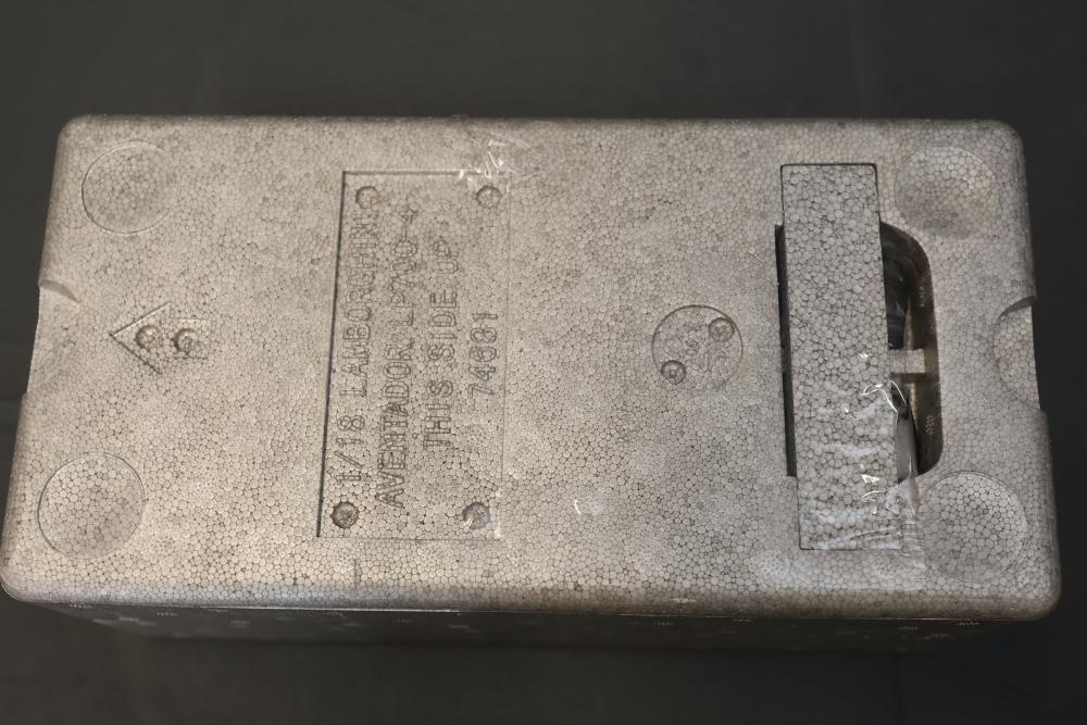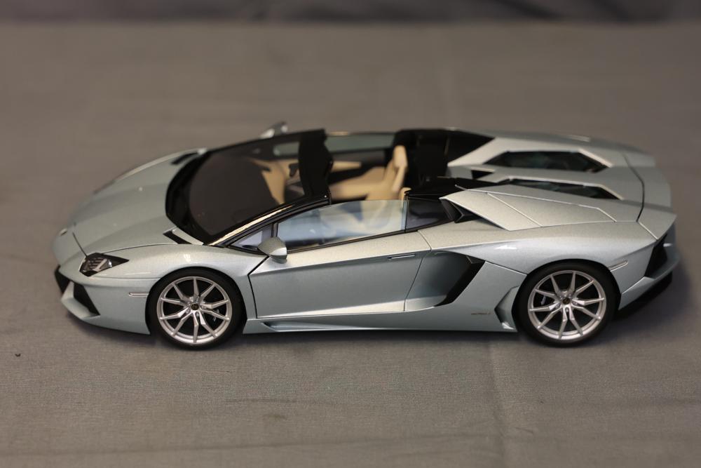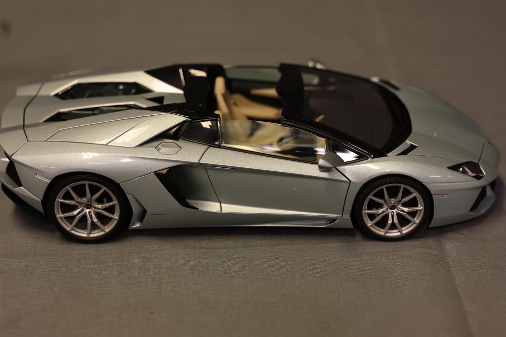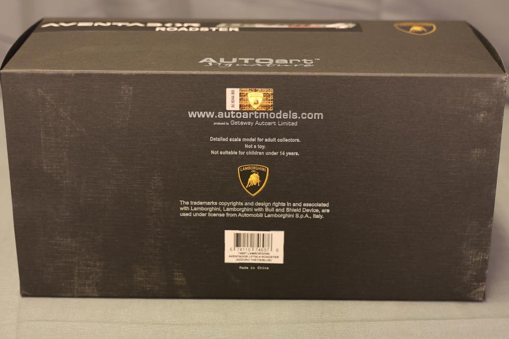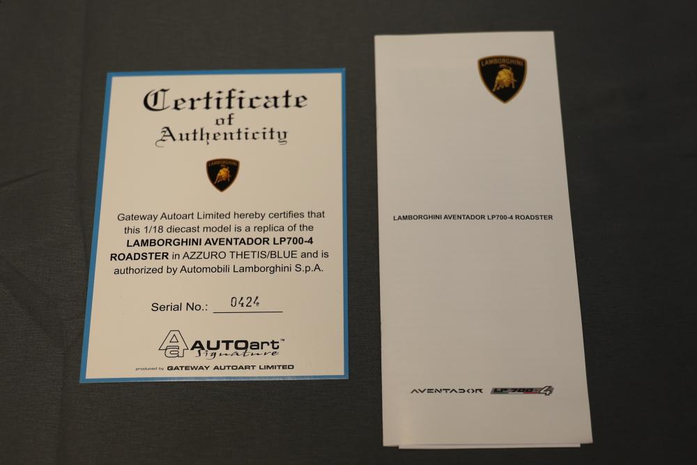 1:18 scale model of the Lamborghini Aventador LP700-4 Roadster in Azzuro Thetis Blue by Autoart, including a Certificate of Authenticity and original packaging. The model is crafted for adult collectors and is not suitable for children under 14 years old. The outer box and protective styrofoam packaging are included. Pickup only.