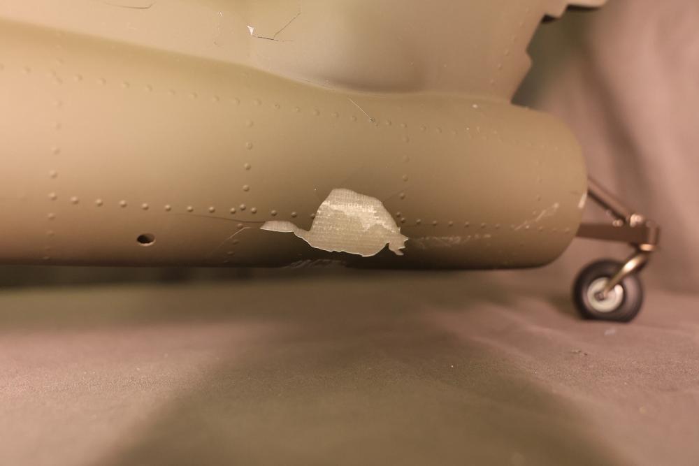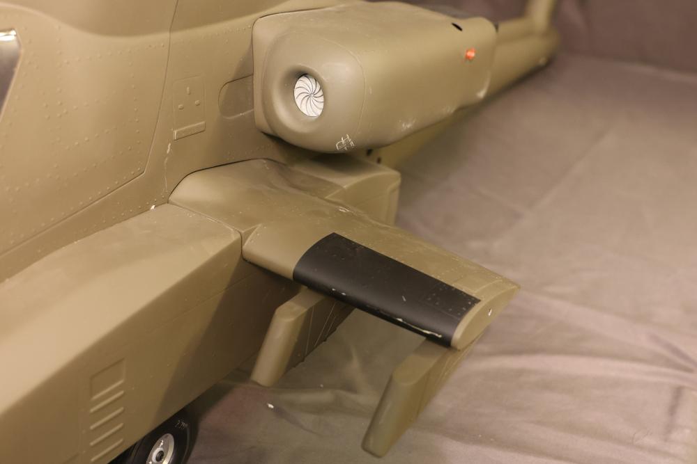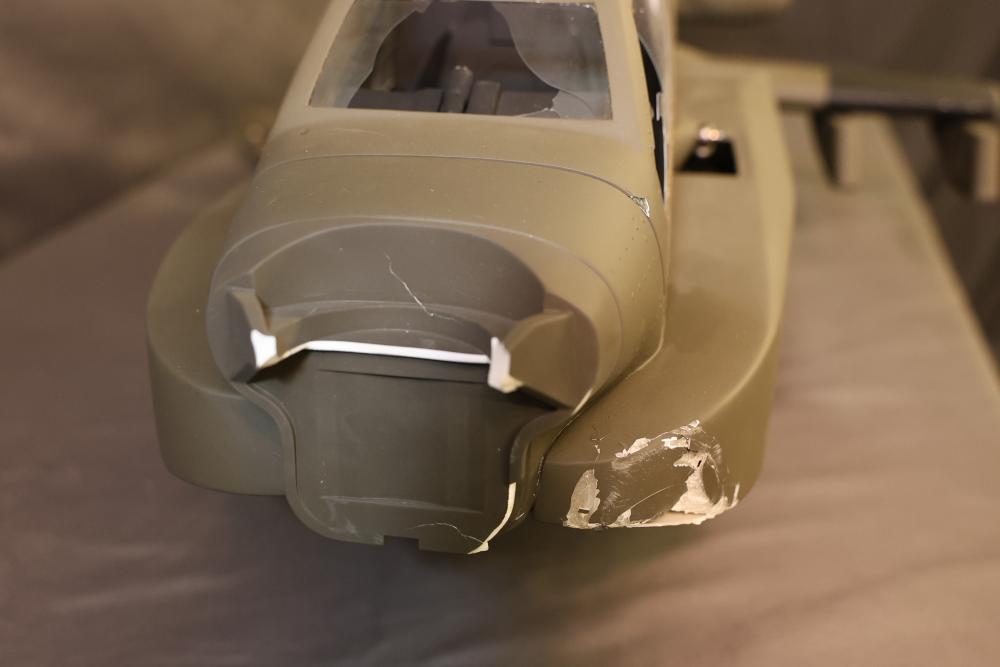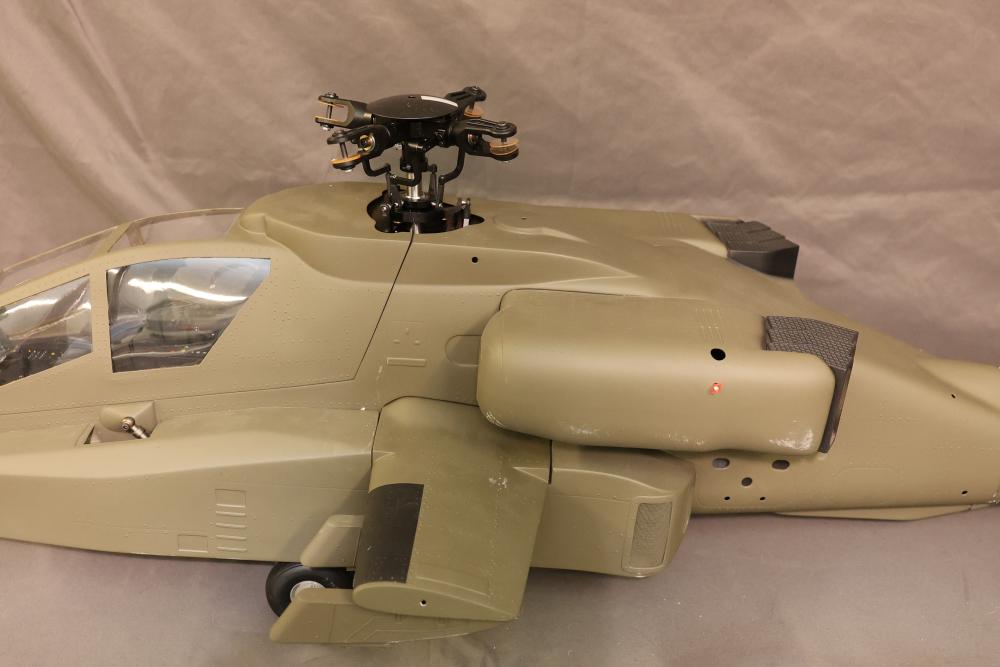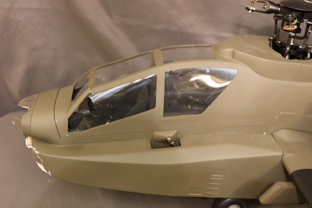 Radio Controlled (RC) Large-scale model of a military-style helicopter in matte olive color. Features include a detailed cockpit, functional wheels, and rotors with a four-blade tail rotor. The left side and rear fuselage display visible damage, including scuffs and paint scratches. Pickup only.