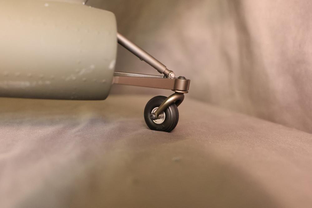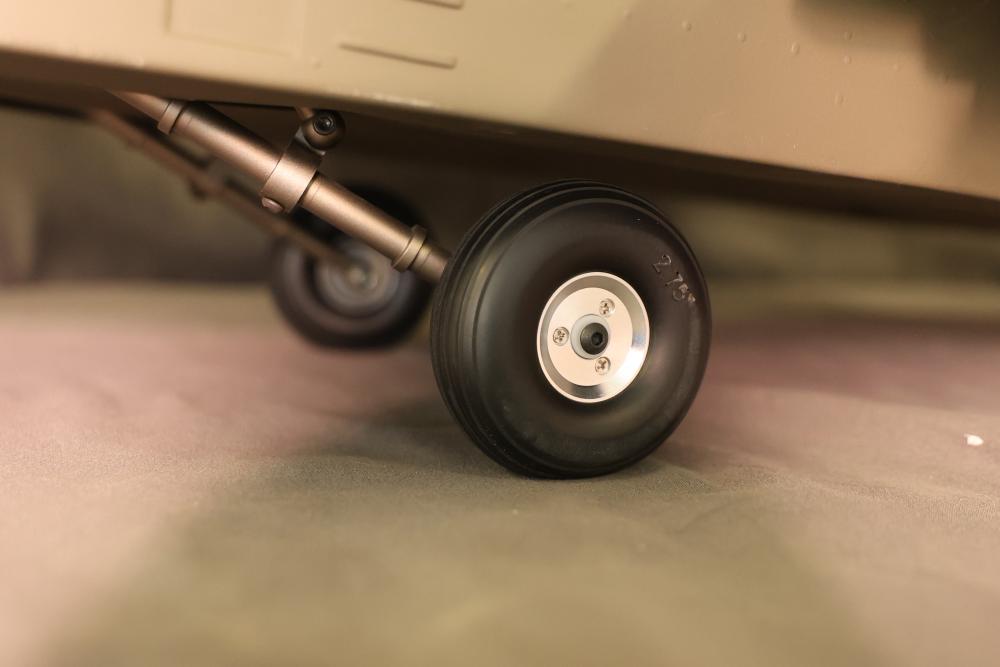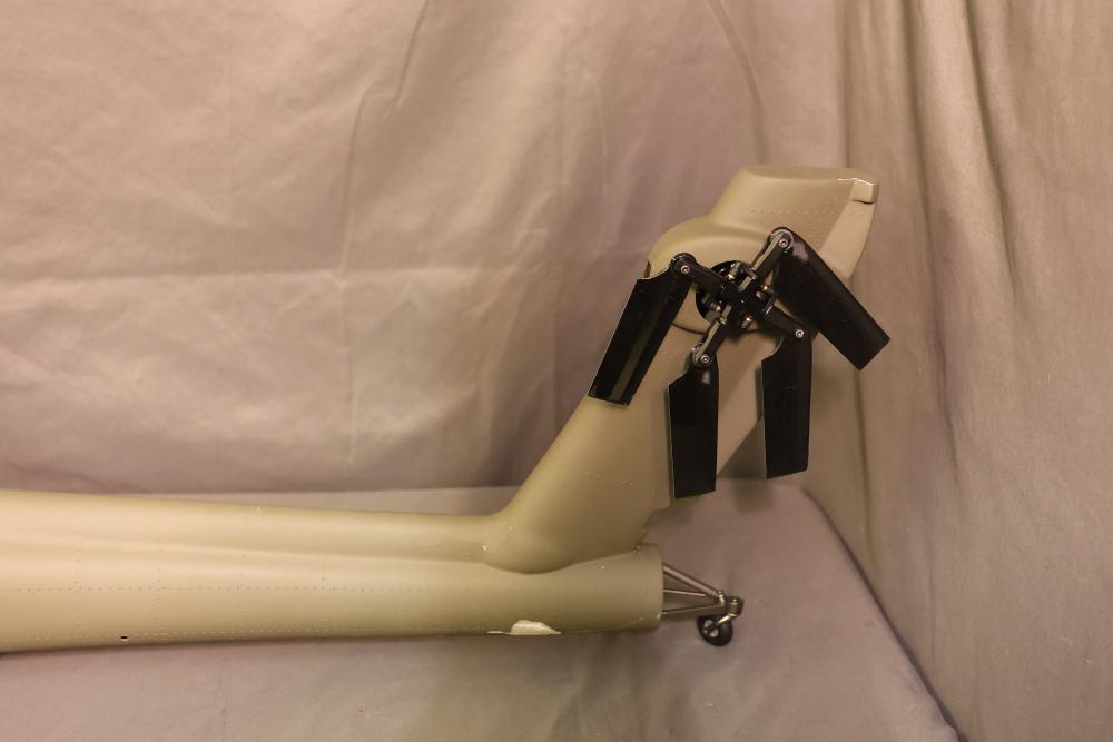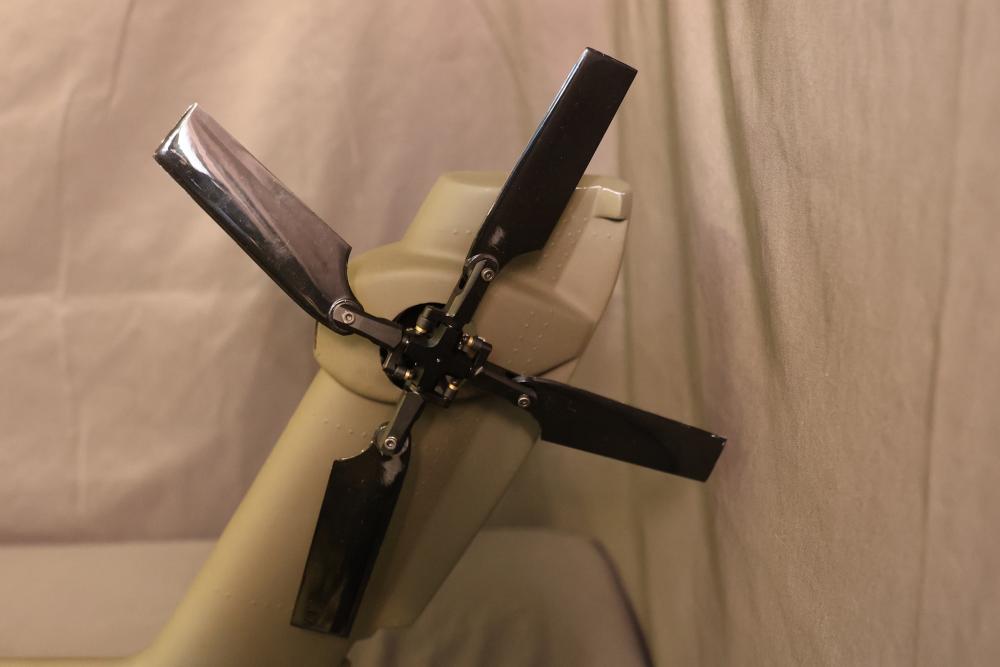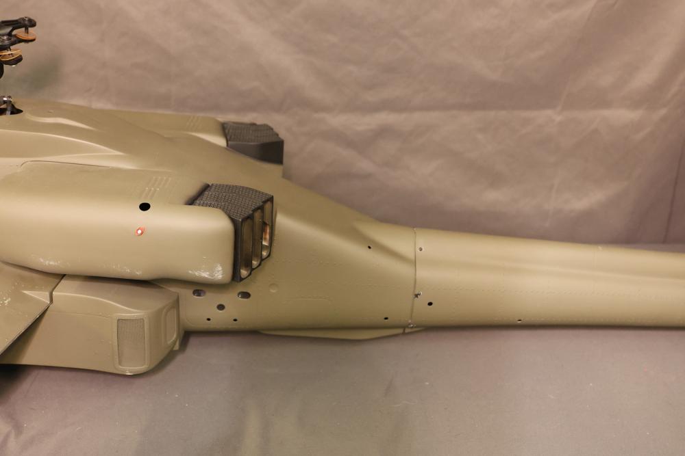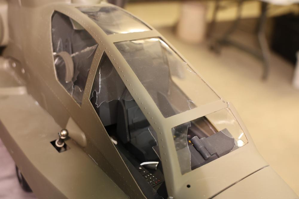 Radio Controlled (RC) Large-scale model of a military-style helicopter in matte olive color. Features include a detailed cockpit, functional wheels, and rotors with a four-blade tail rotor. The left side and rear fuselage display visible damage, including scuffs and paint scratches. Pickup only.