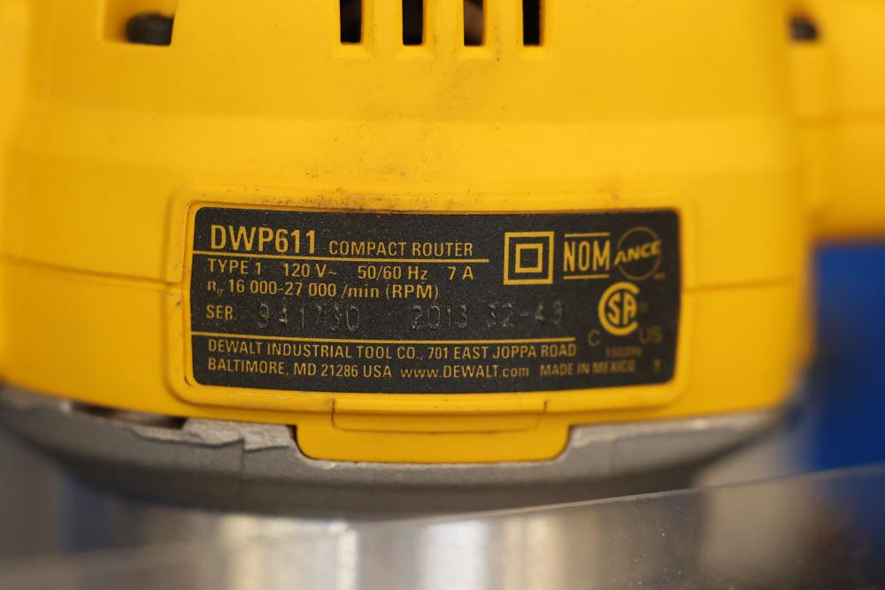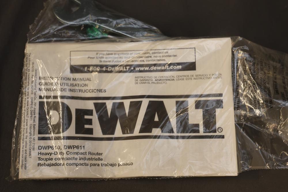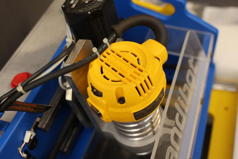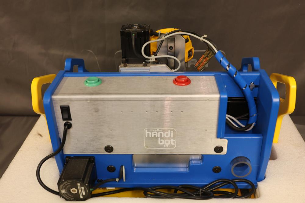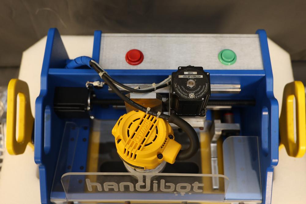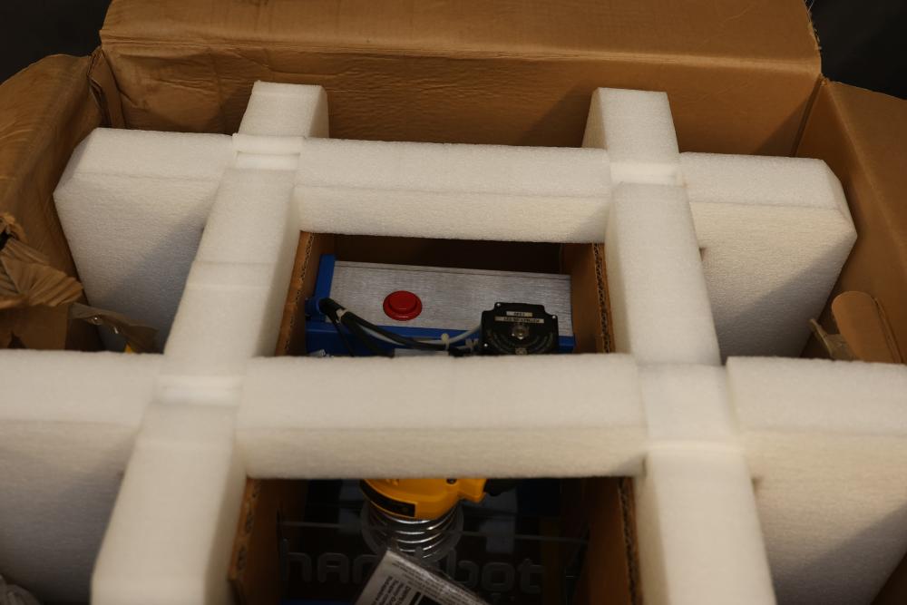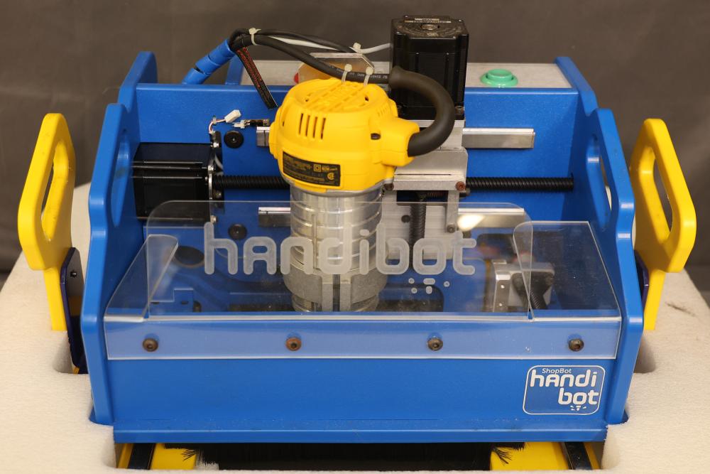 Handibot Smart Power Tool featuring a built-in DeWalt DWP611 compact router with a 120V, 7A motor and variable speed (16,000-27,000 RPM). Includes a Makeblock robot turntable, Monoprice cable, and additional accessories. The unit comes in its original packaging with foam padding for secure transport.