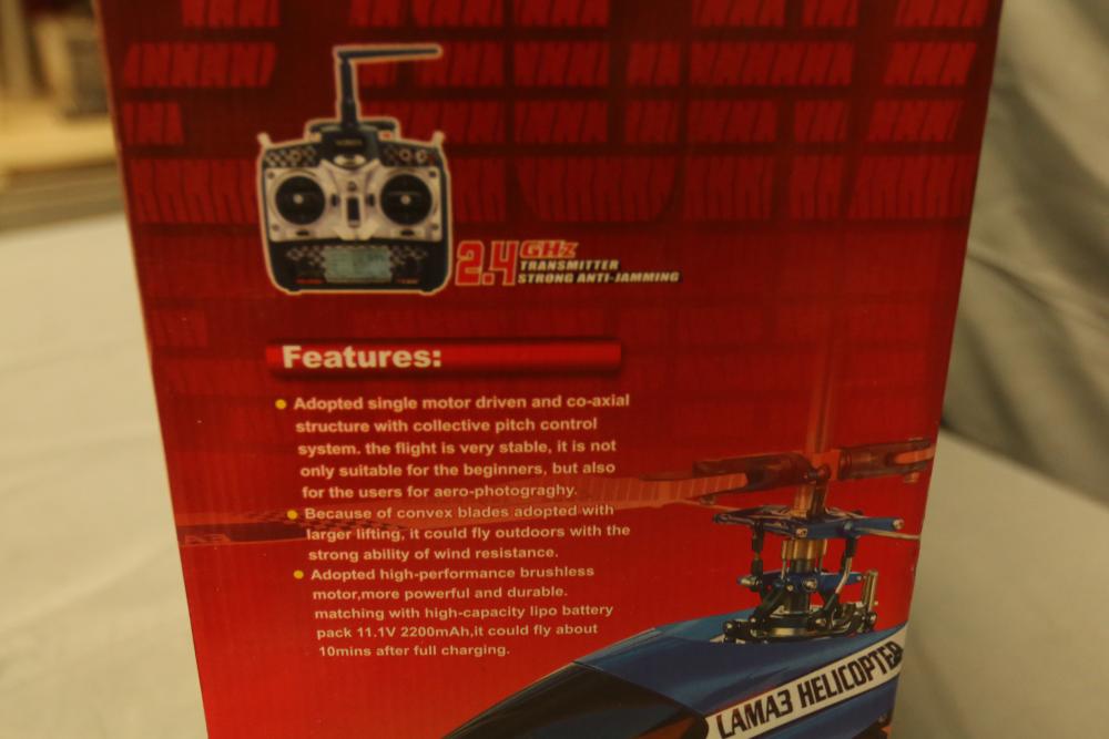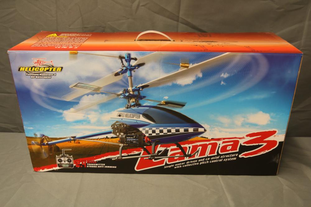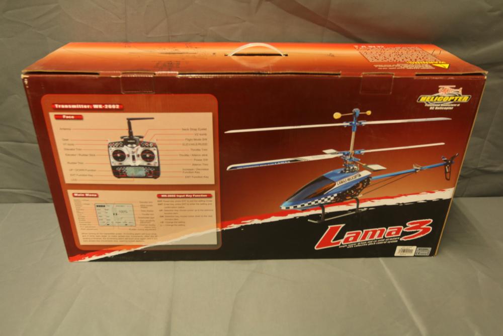Lama 3 single-motor driven and co-axial helicopter with a 2.4GHz WK-2602 transmitter. Features include advanced control system, high-capacity lithium battery, and a stable flight system. Includes original packaging and detailed instructions.