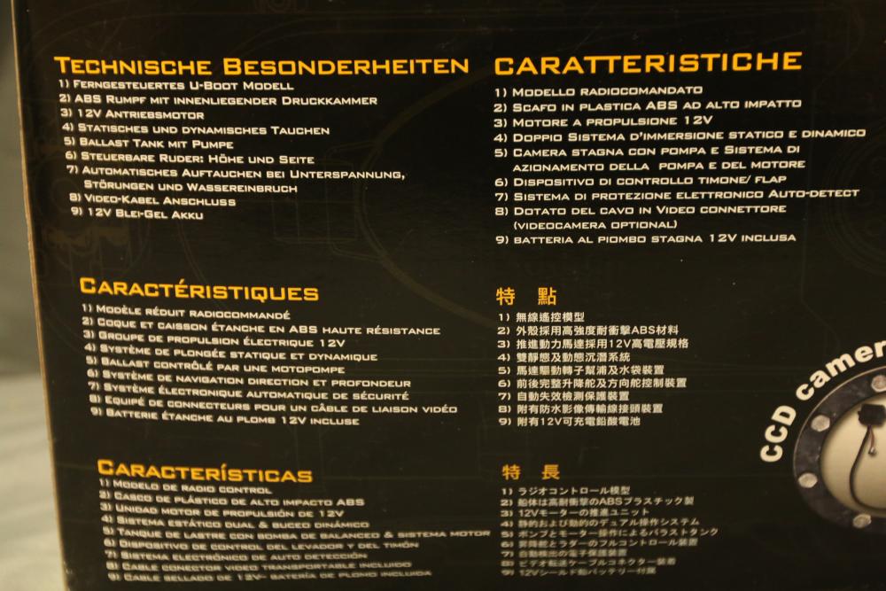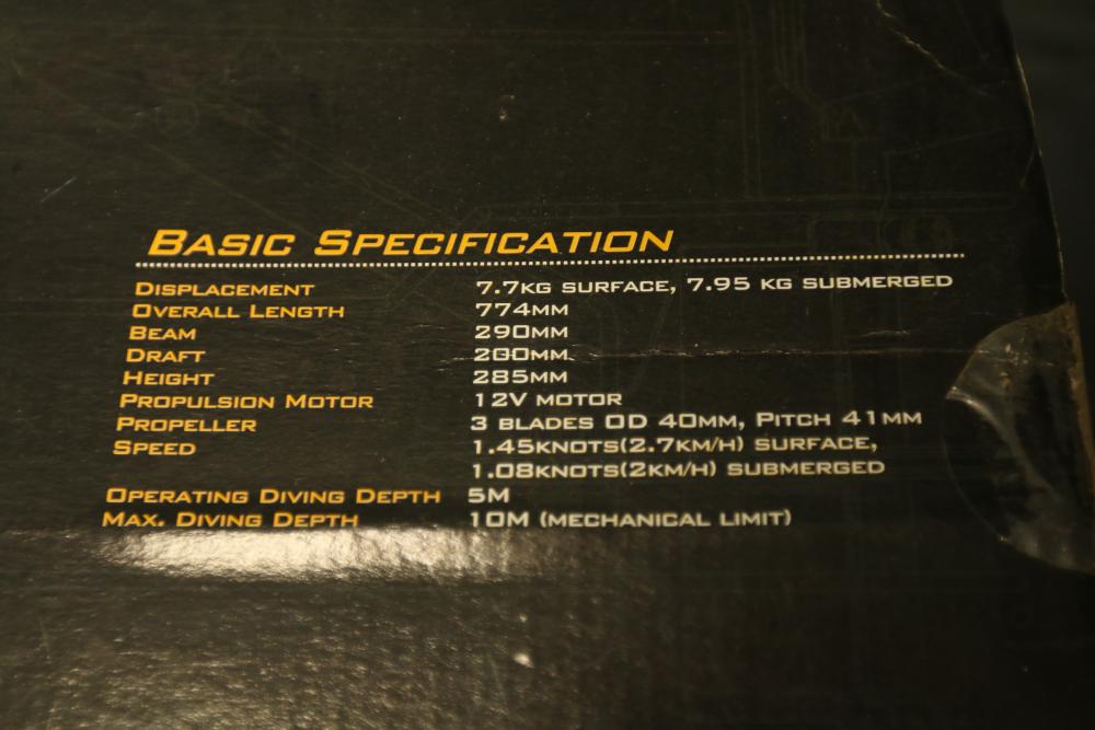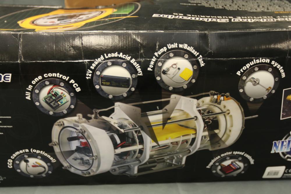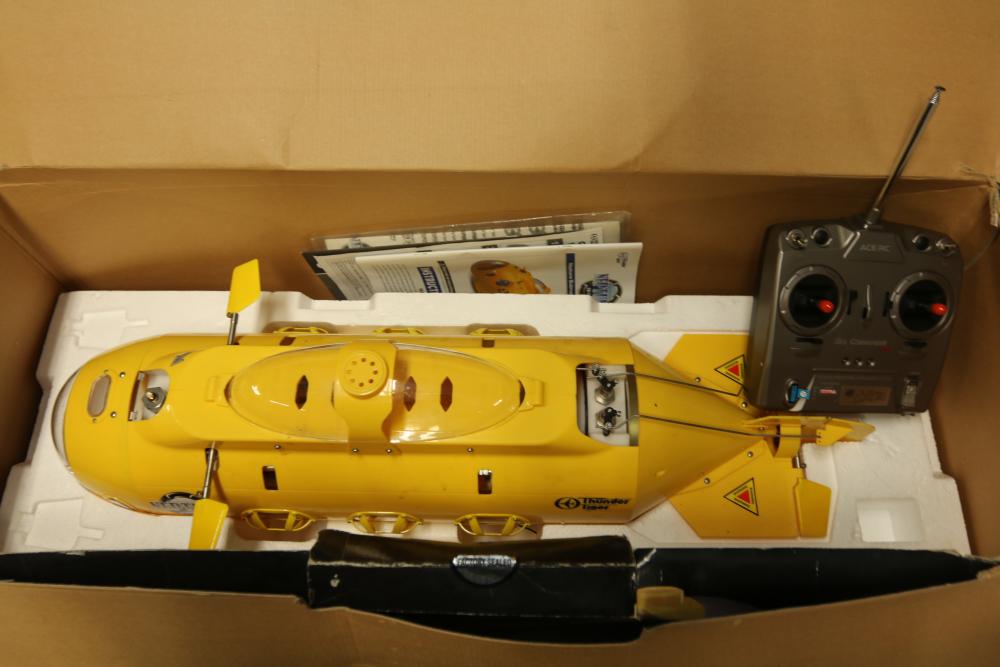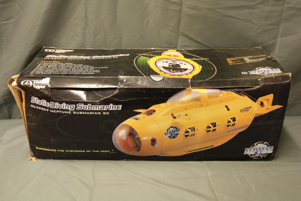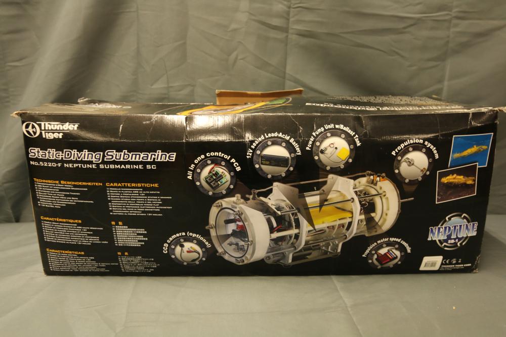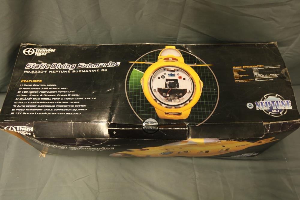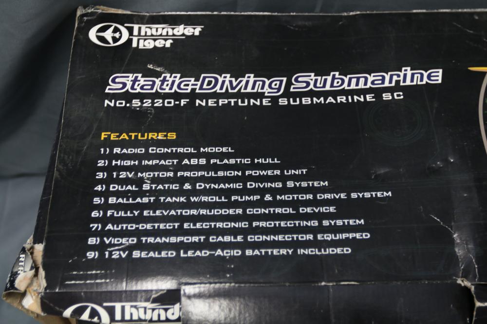 Radio Controlled (RC) Thunder Tiger Neptune SC Static-Diving Submarine with ABS plastic hull and 12V motor propulsion system. Features include dual static and dynamic diving systems, ballast tank, fully elevator/rudder propulsion setup, and an auto-detect electronic protection system. Includes radio controller and accessories as shown.