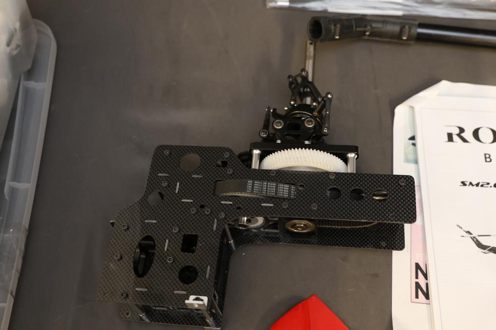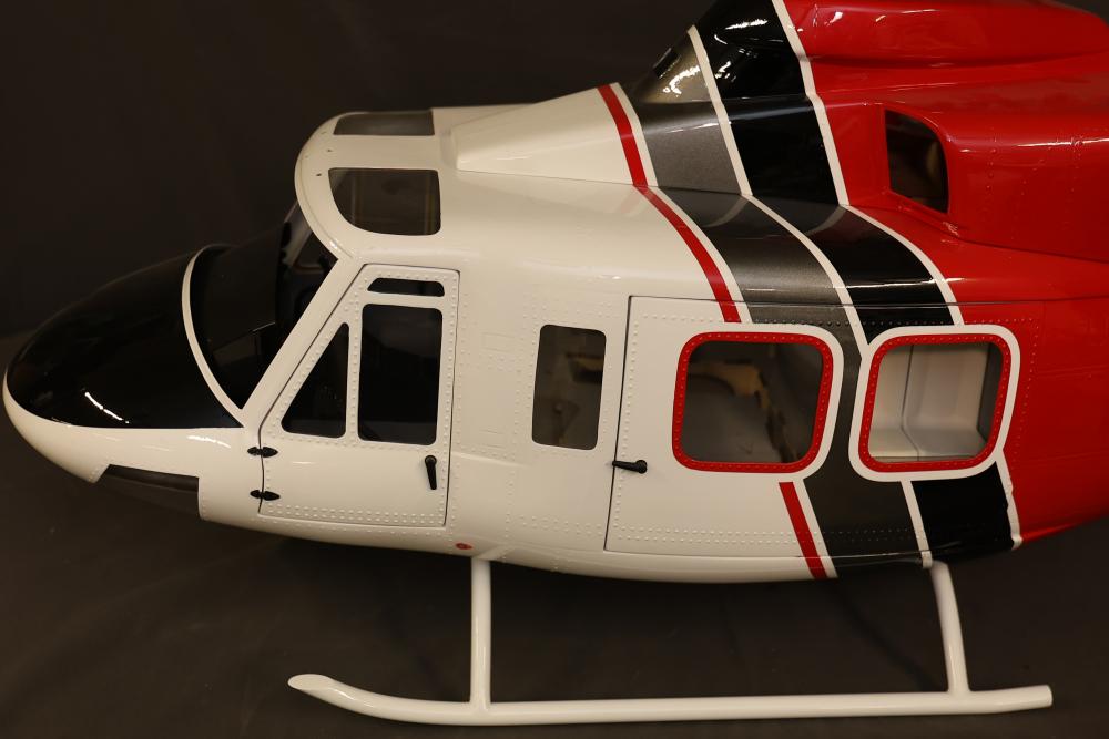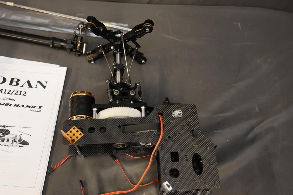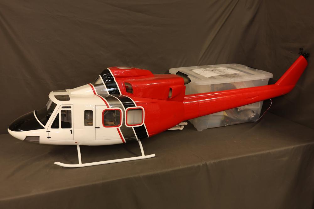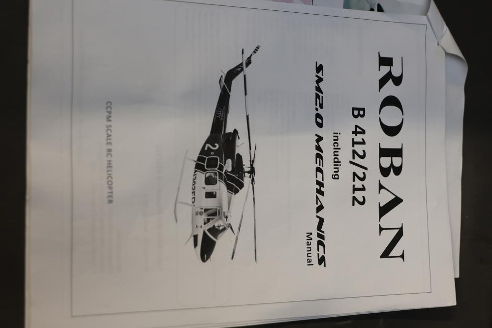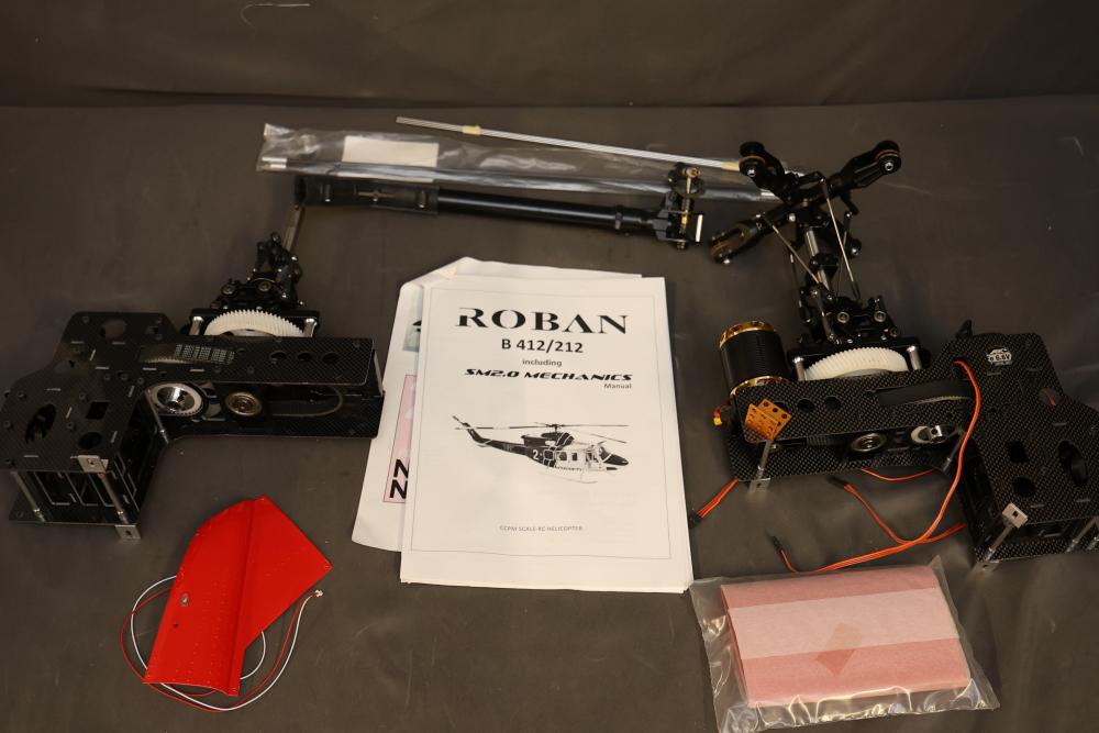 Roban B 412/212 Radio Controlled (RC) helicopter fuselage and associated components, including main rotor blades, tail rotor blades, mechanical assemblies, and wiring. The fuselage features a red, black, and white color scheme with openings for mechanics. Included are manuals, carbon fiber components, and various accessories suitable for assembly. Some pieces show wear, such as a crack on a rotor blade. Pickup only.