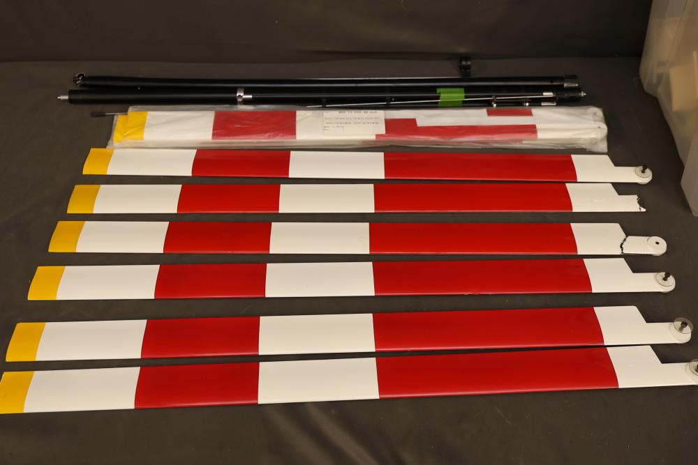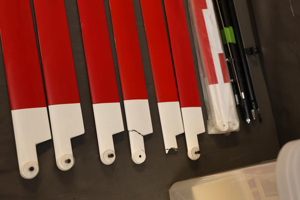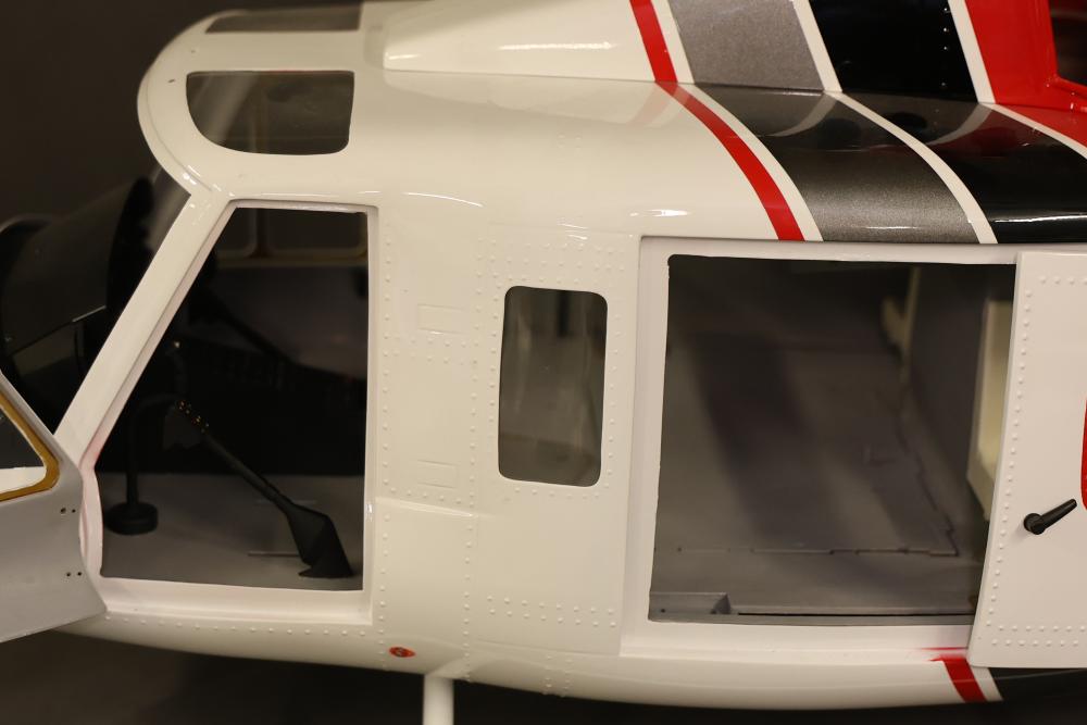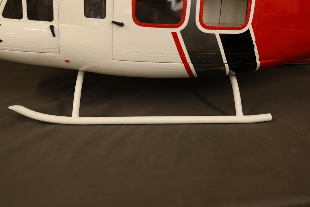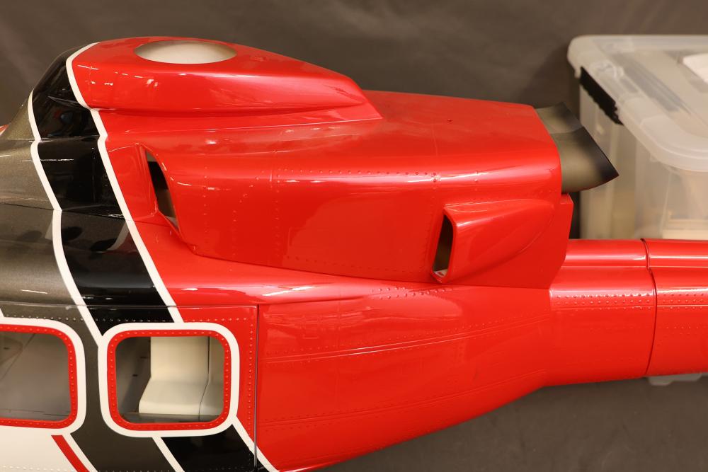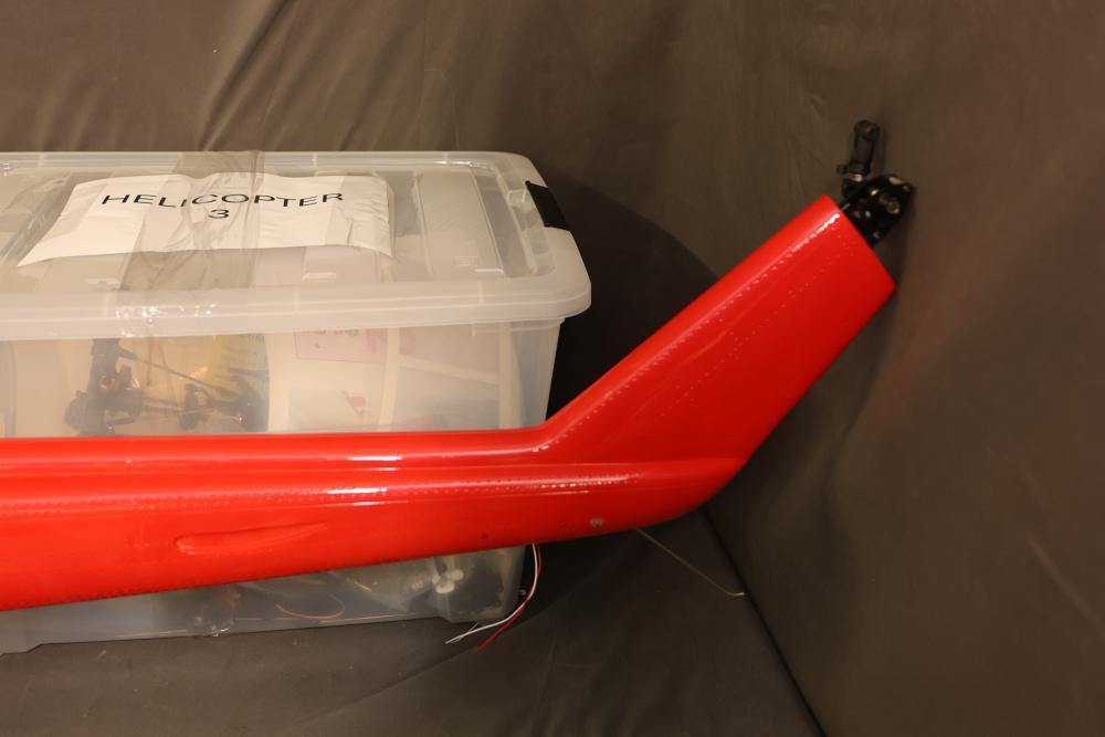 Roban B 412/212 Radio Controlled (RC) helicopter fuselage and associated components, including main rotor blades, tail rotor blades, mechanical assemblies, and wiring. The fuselage features a red, black, and white color scheme with openings for mechanics. Included are manuals, carbon fiber components, and various accessories suitable for assembly. Some pieces show wear, such as a crack on a rotor blade. Pickup only.
