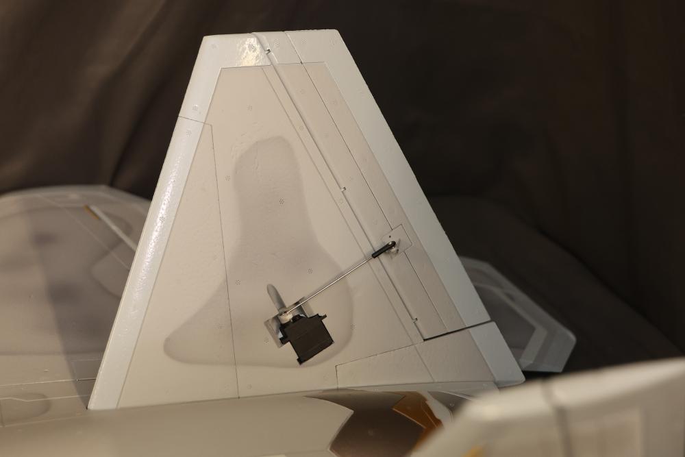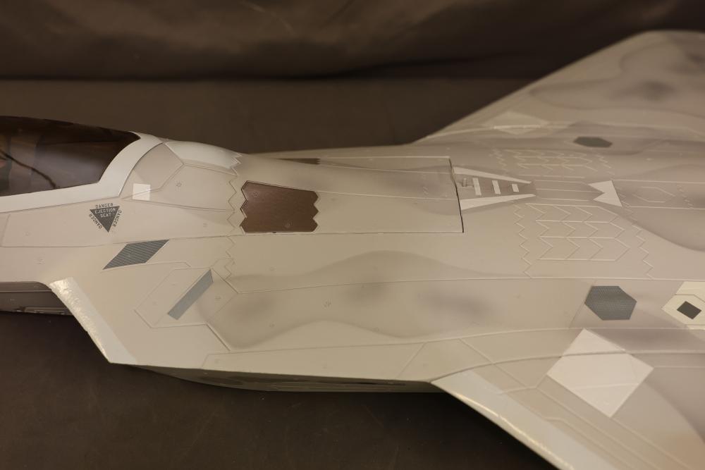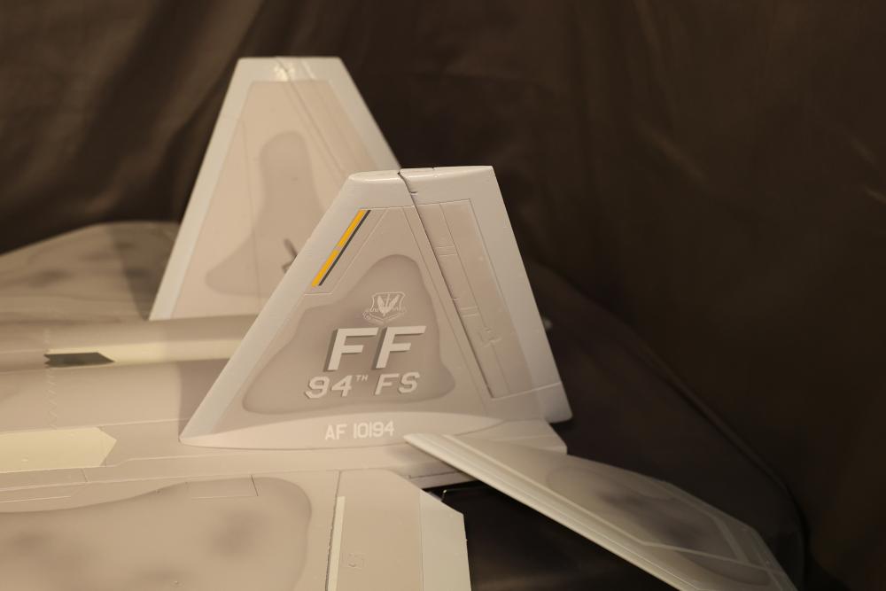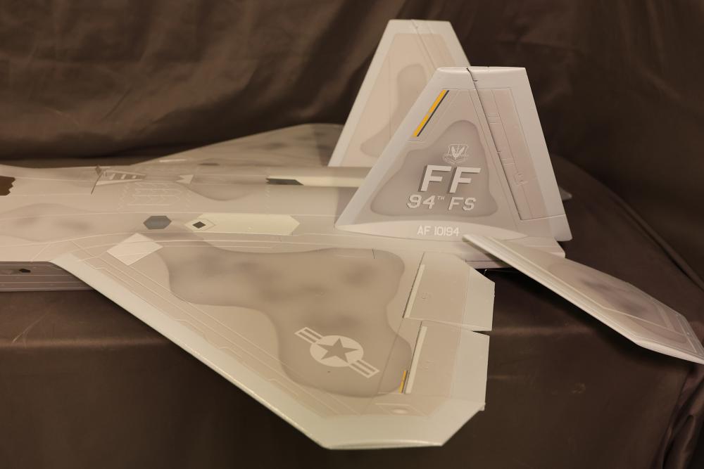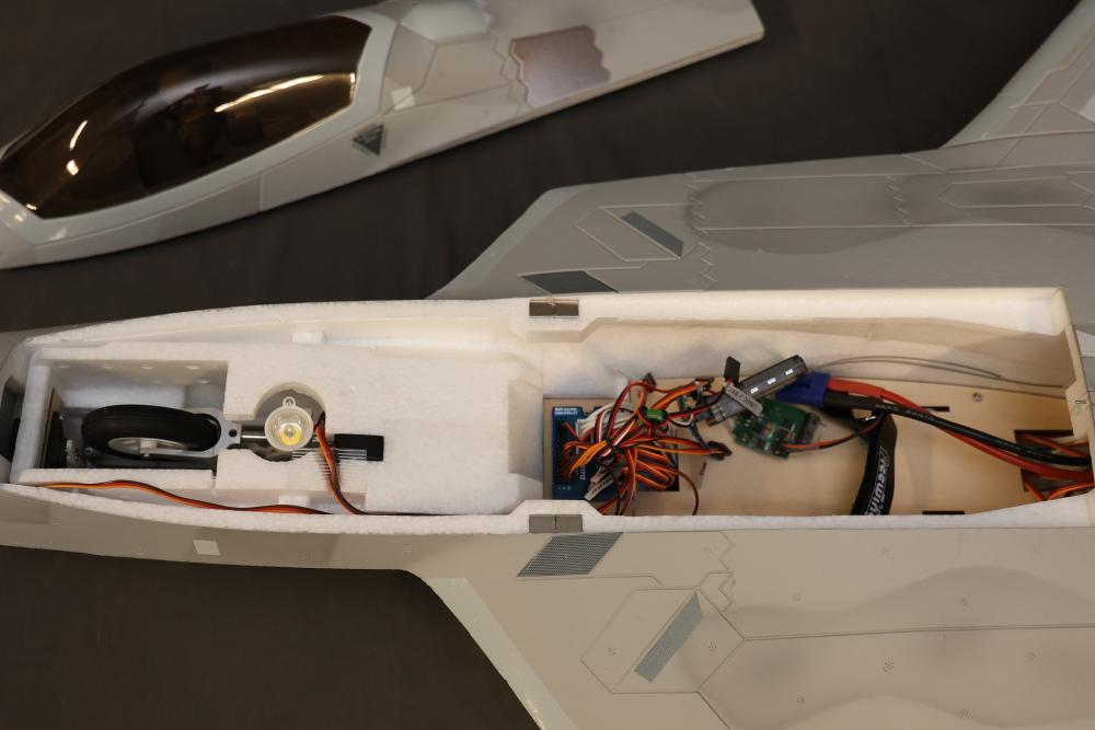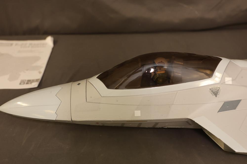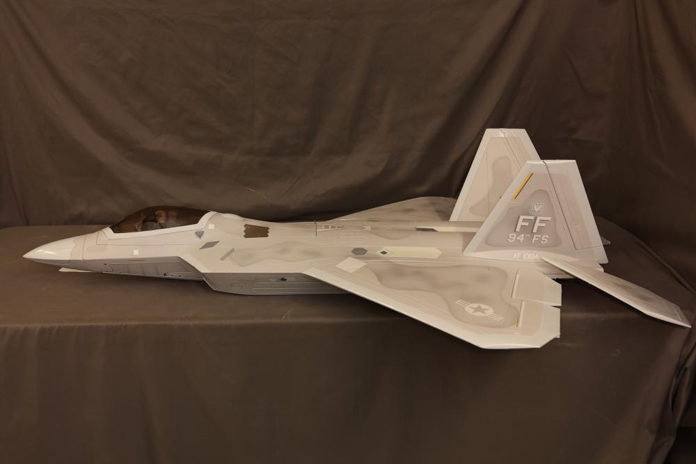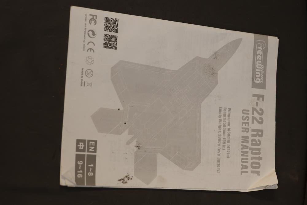 Radio Controlled (RC) F-22 Raptor Freewing Ultra Performance R/C 90mm Aircraft with manual, 59.05" in length and has a wingspan of 41.73", Inrunner Brushless Motor, retractable landing gear and steerable nose gear and all servos. The aircraft features detailed exterior design, including accurate markings, and an accessible internal compartment showing wiring and components. Comes with a user manual for the model, red stand with foam-padded supports. Pickup only.