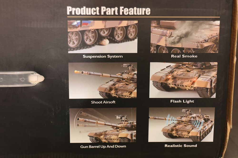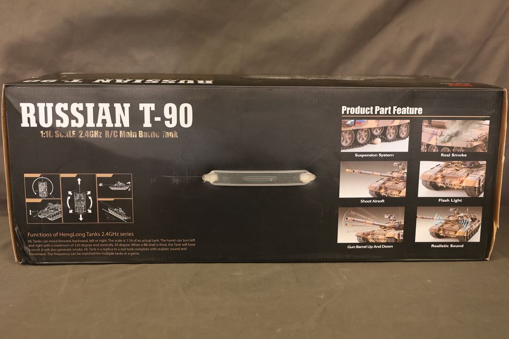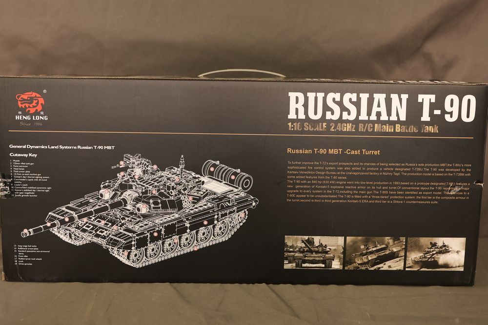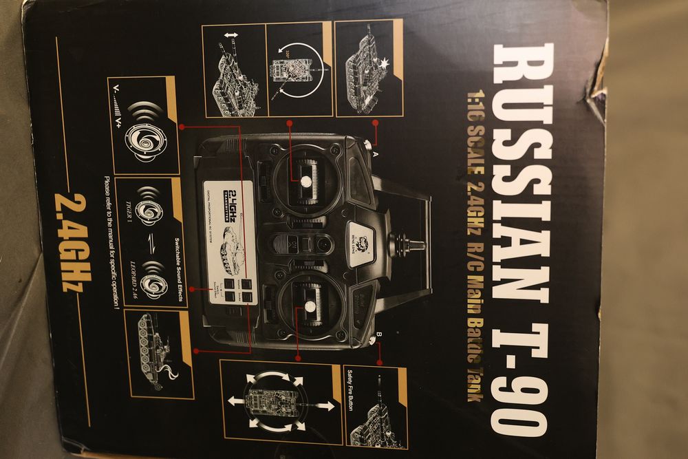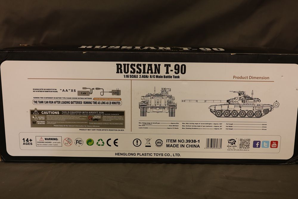 1:16 scale remote-controlled Russian T-90 main battle tank featuring 2.4GHz control system. Includes advanced features such as realistic sound, smoke effects, suspension system, flashing light, and gun barrel motion. Designed for ages 14 and above. Powered by AA batteries, with a running time of up to 25 minutes after charging. Pickup only.