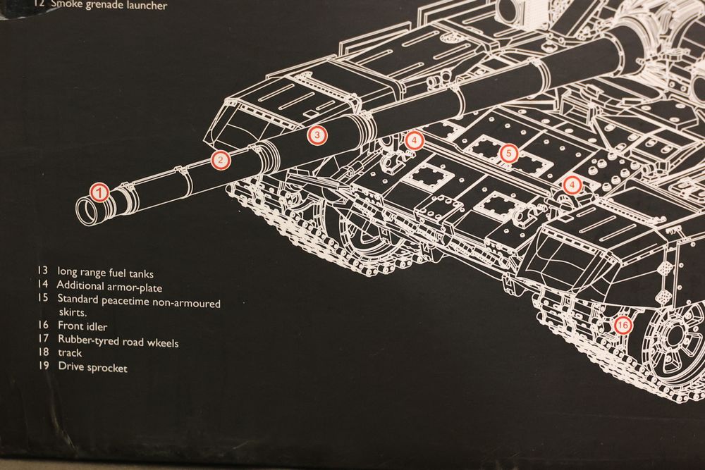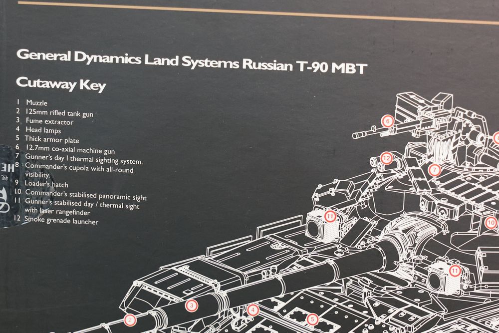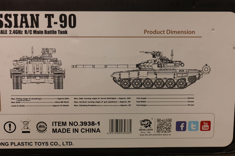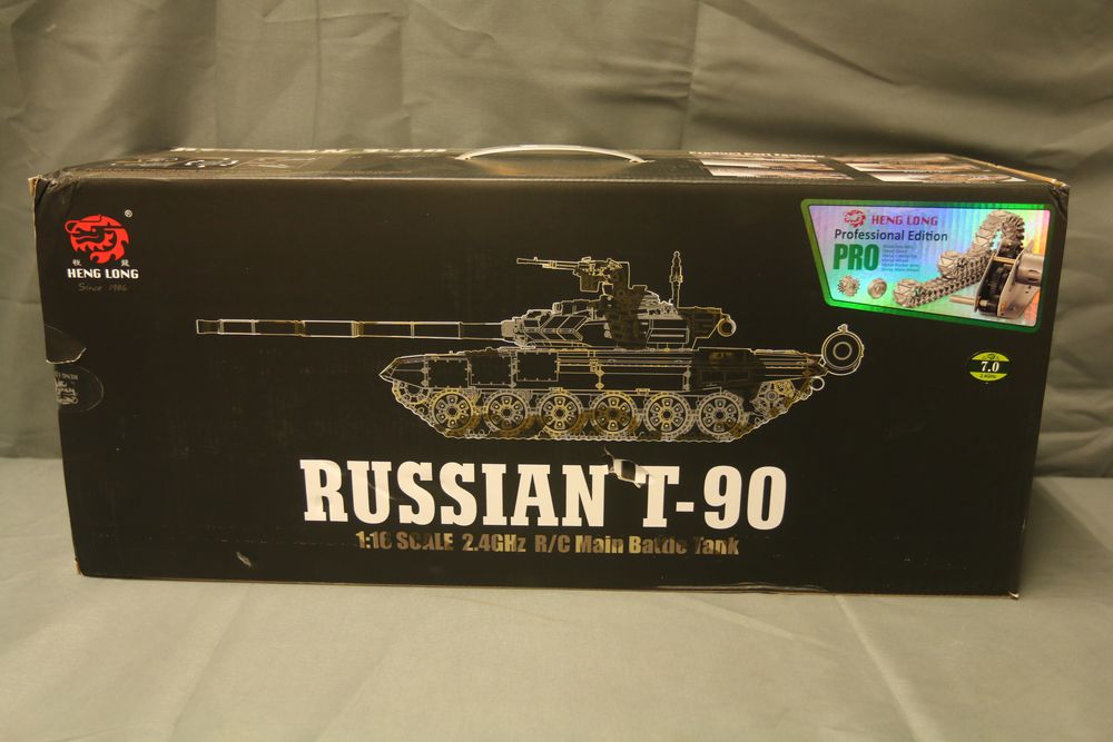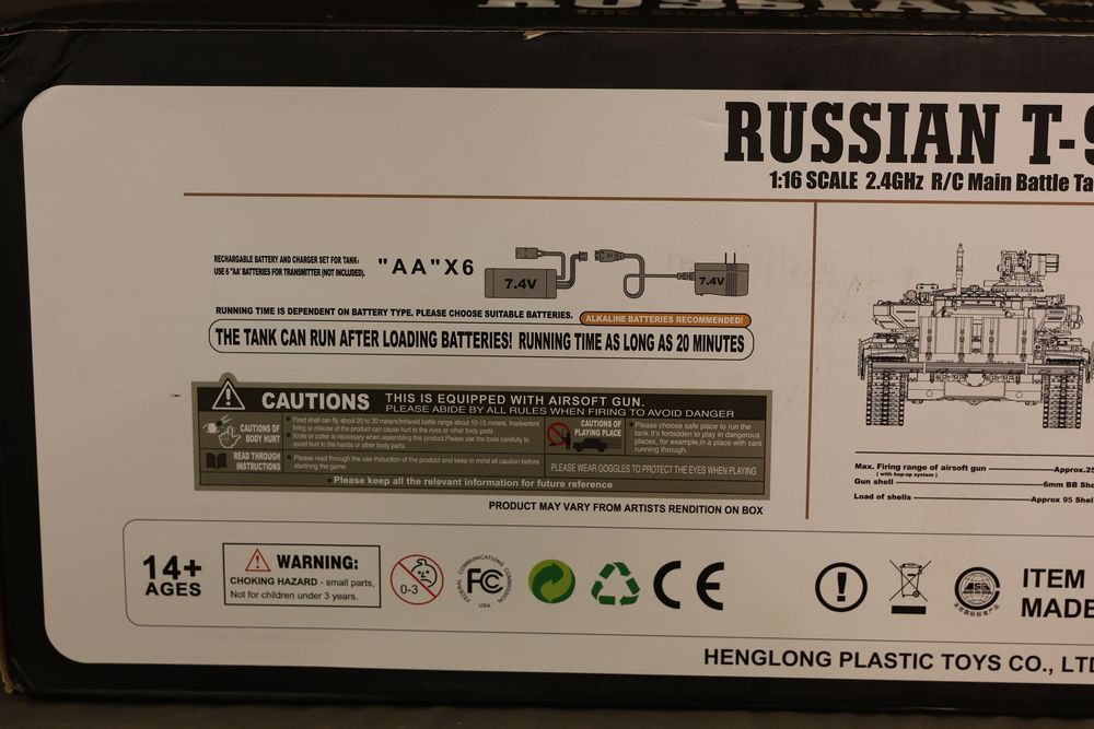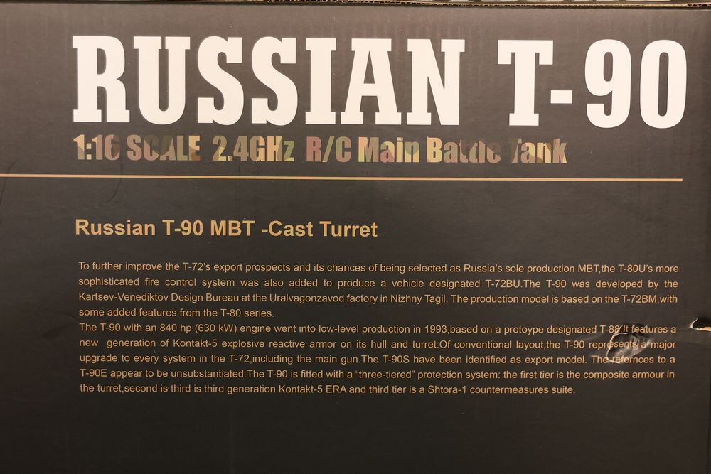 1:16 scale remote-controlled Russian T-90 main battle tank featuring 2.4GHz control system. Includes advanced features such as realistic sound, smoke effects, suspension system, flashing light, and gun barrel motion. Designed for ages 14 and above. Powered by AA batteries, with a running time of up to 25 minutes after charging. Pickup only.