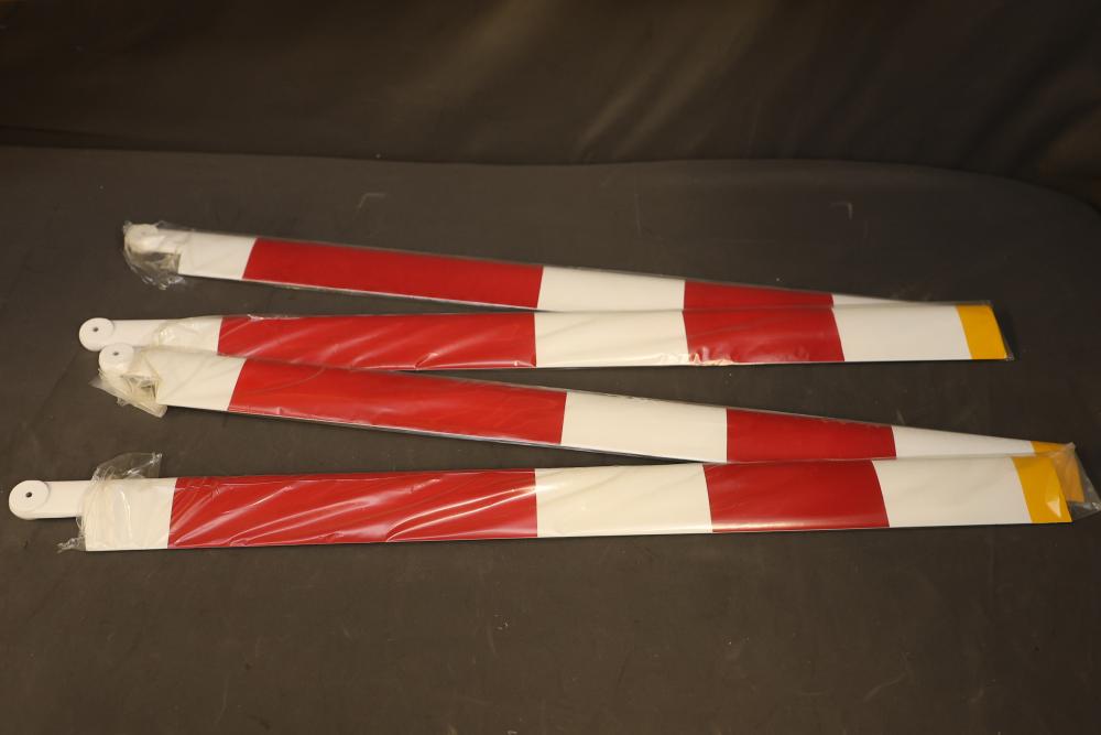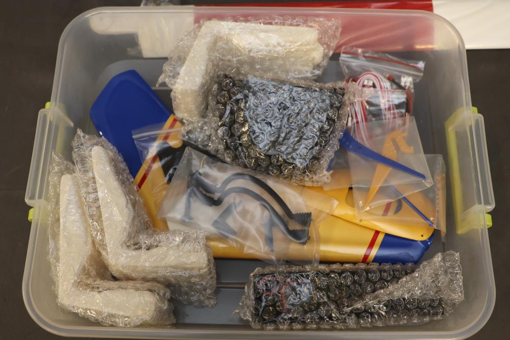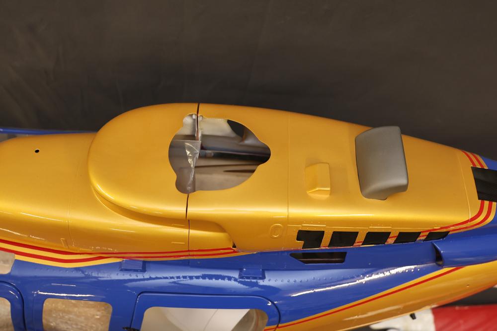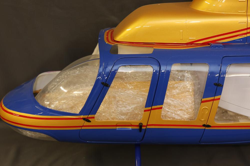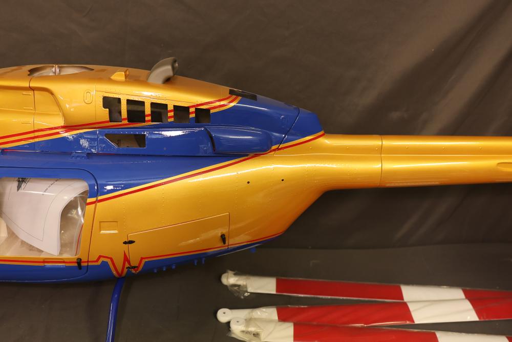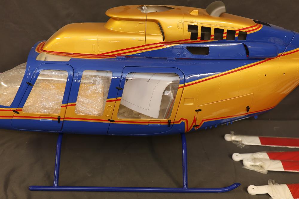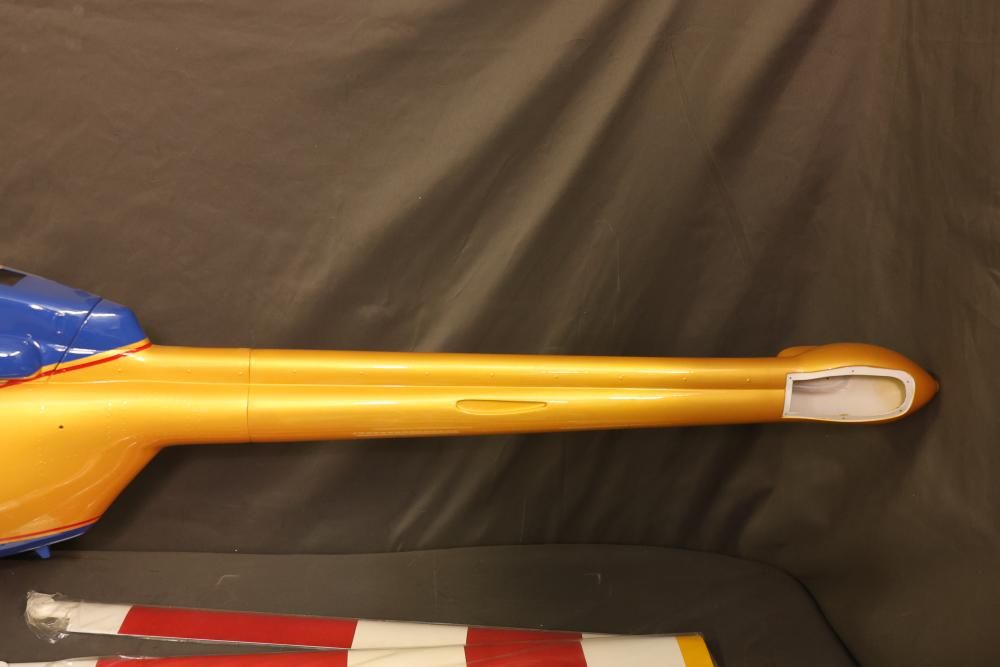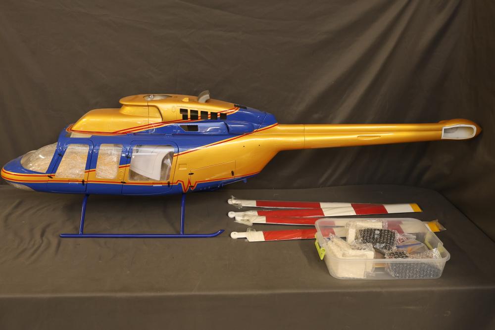 Large-scale Radio Controlled (RC) helicopter featuring a blue and gold paint scheme with detailed markings and transparent windows. Includes rotors, various components, and accessories packaged in a storage container. Suitable for assembly or display. Pickup only.