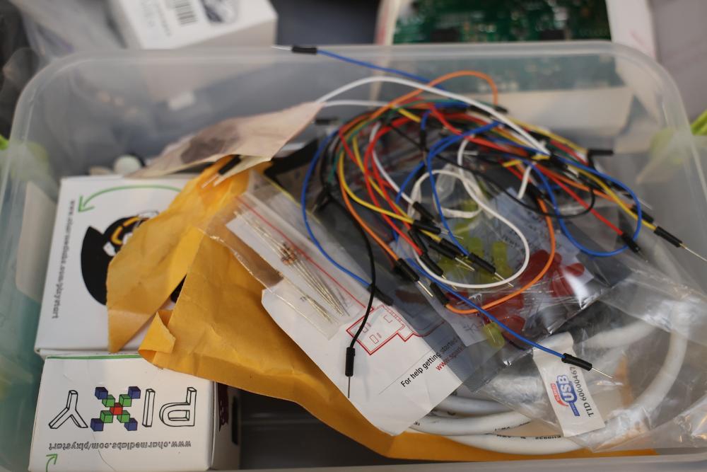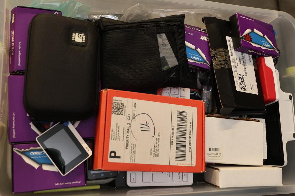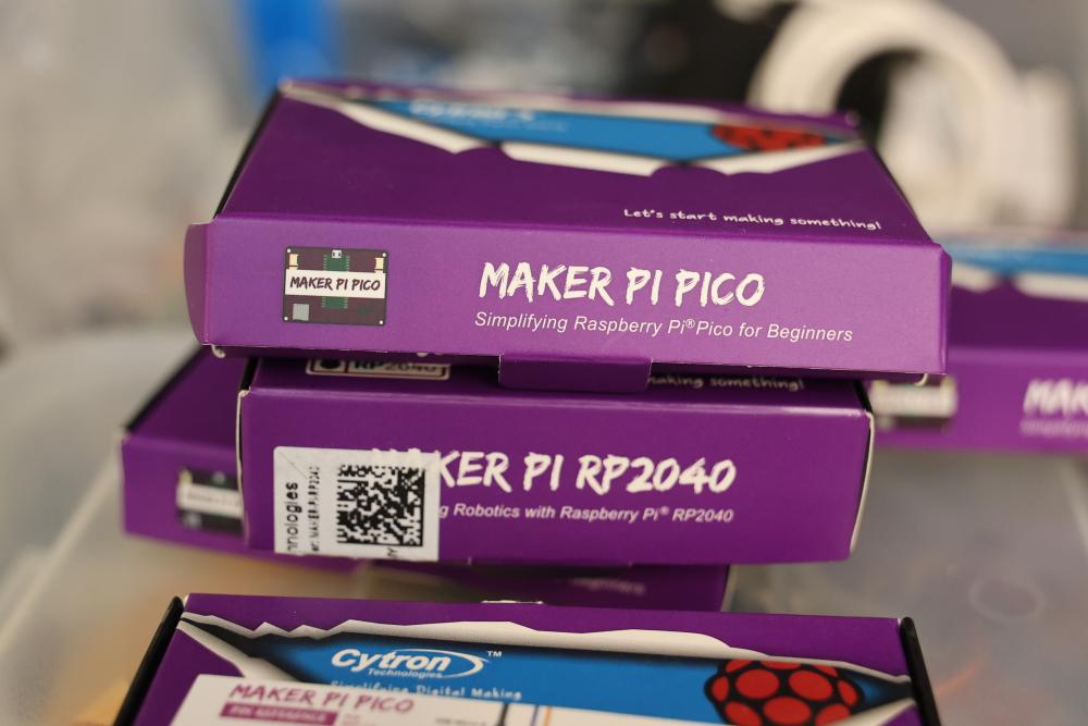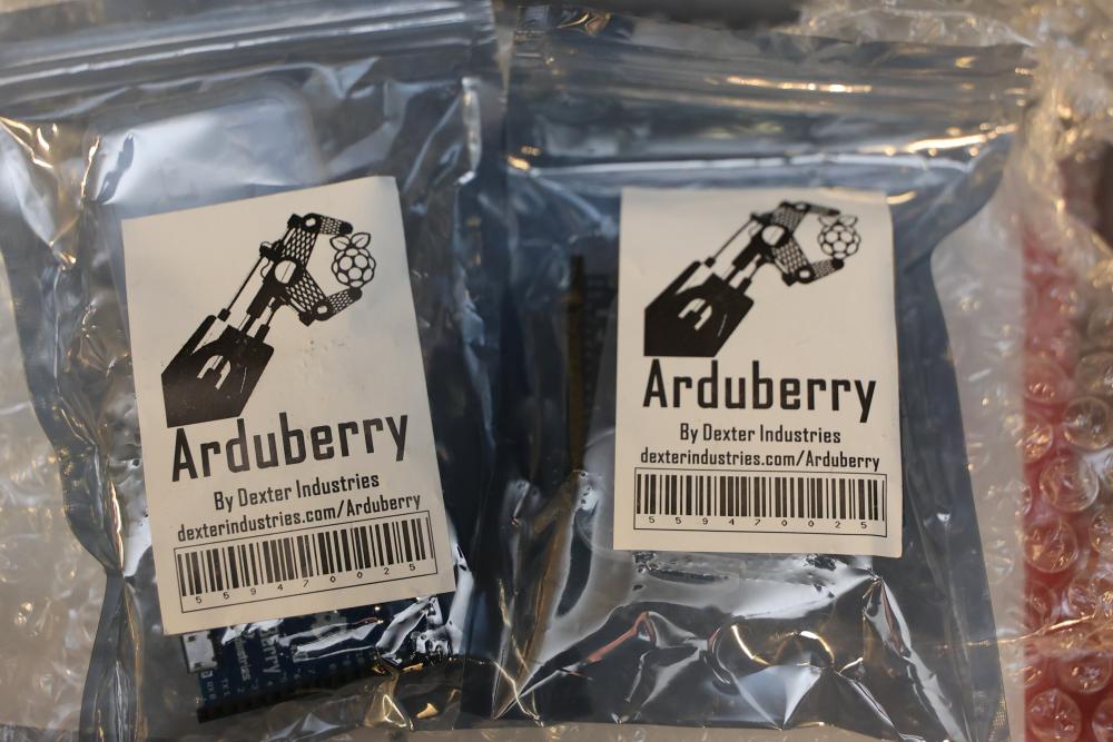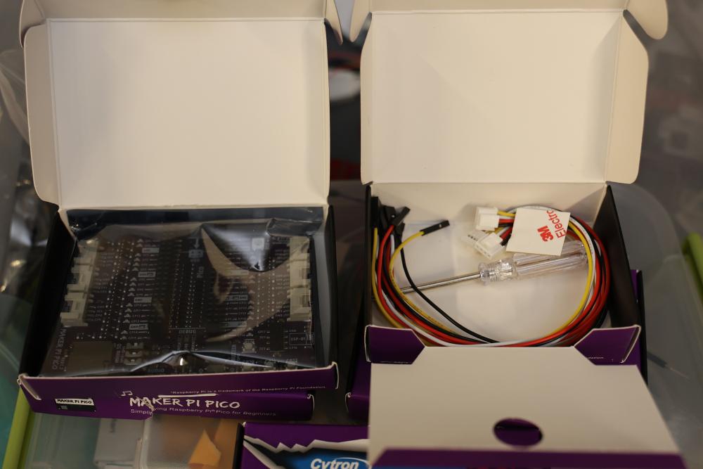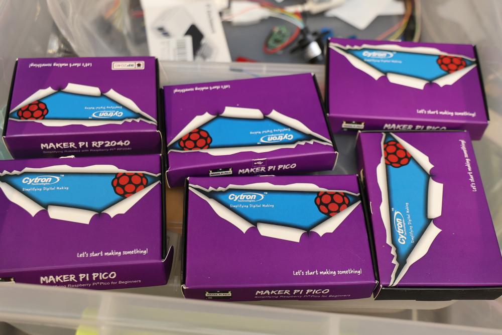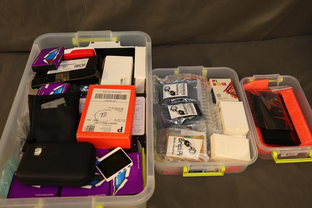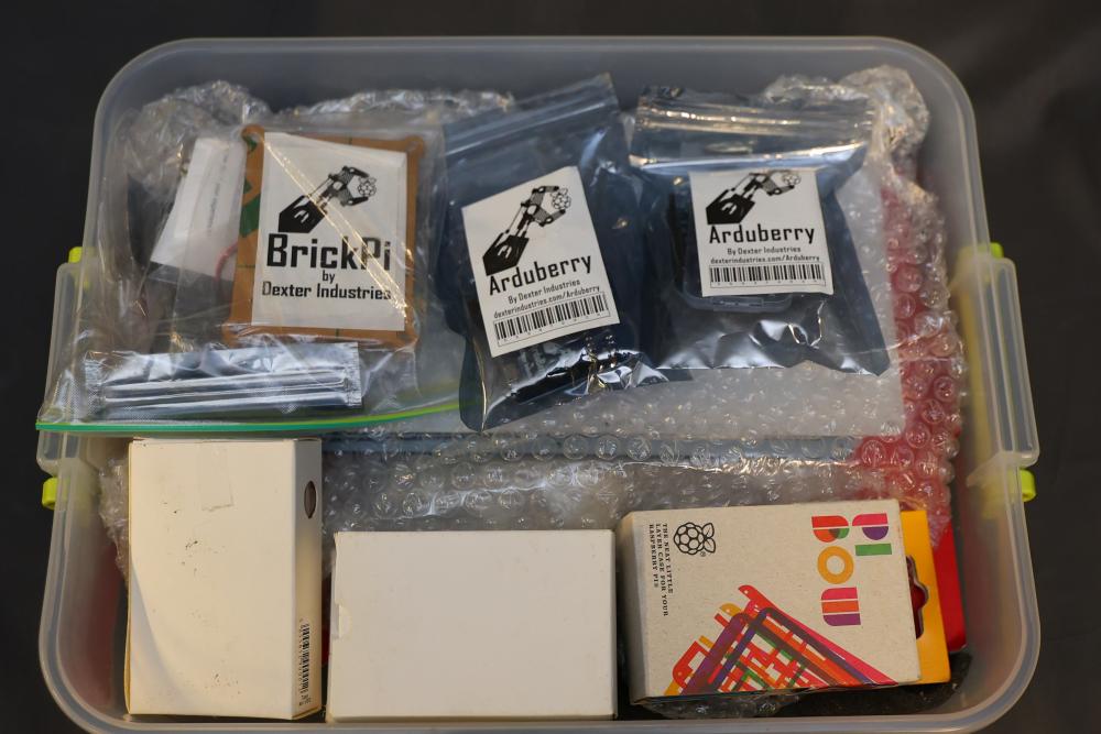 Raspberry Pi hardware and accessories, including Maker Pi RP2040 boards, Arduberry modules, BrickPi hardware, PiBow case, HDMI controller board, Seeed Studio Wio Terminal, touchscreen display, Raspberry Pi 400, cables, and Pi enclosure. Items are in various conditions, with some in original packaging.