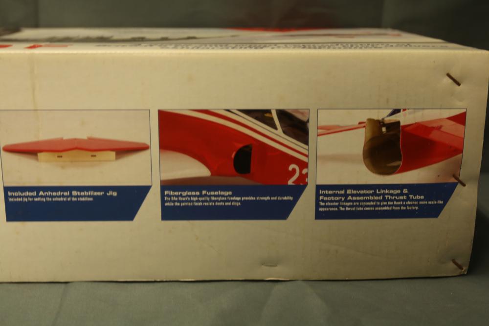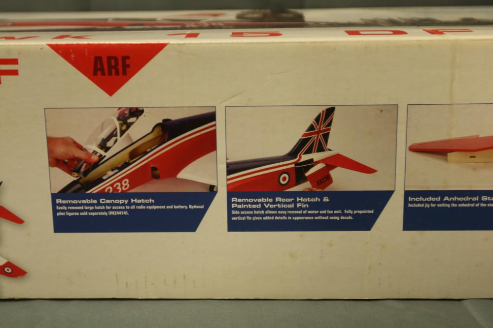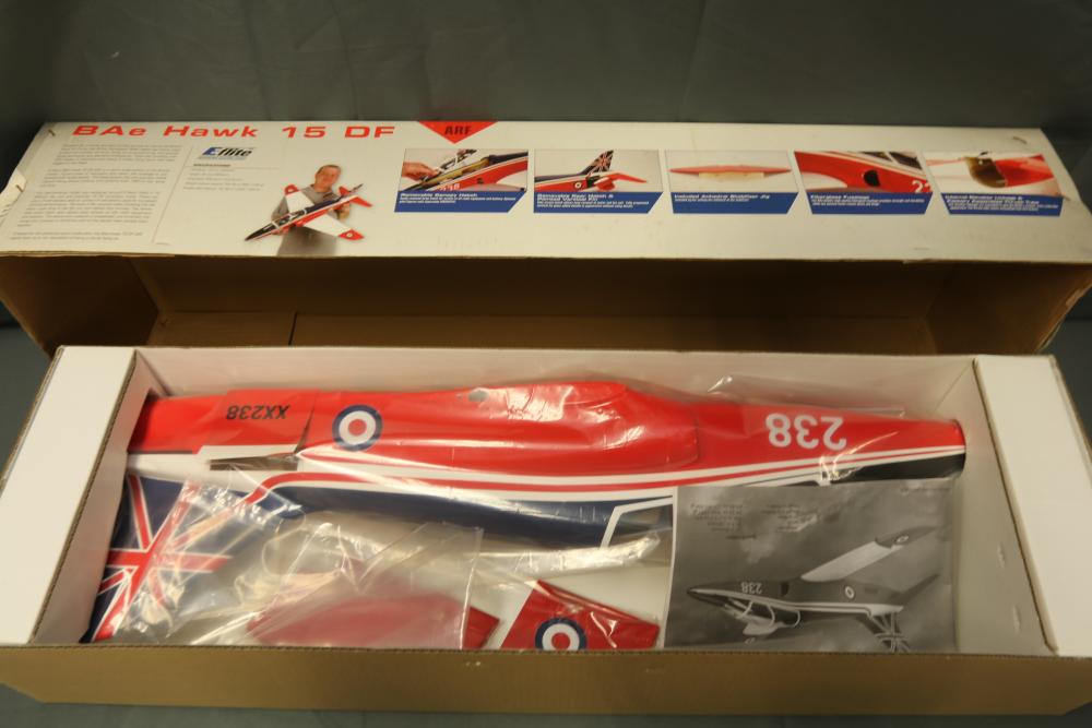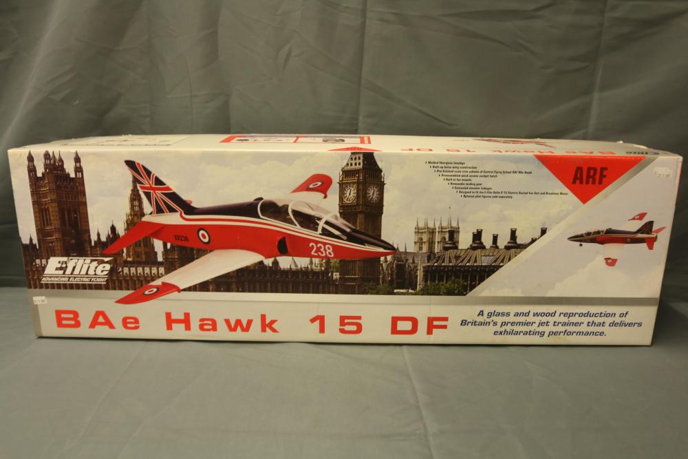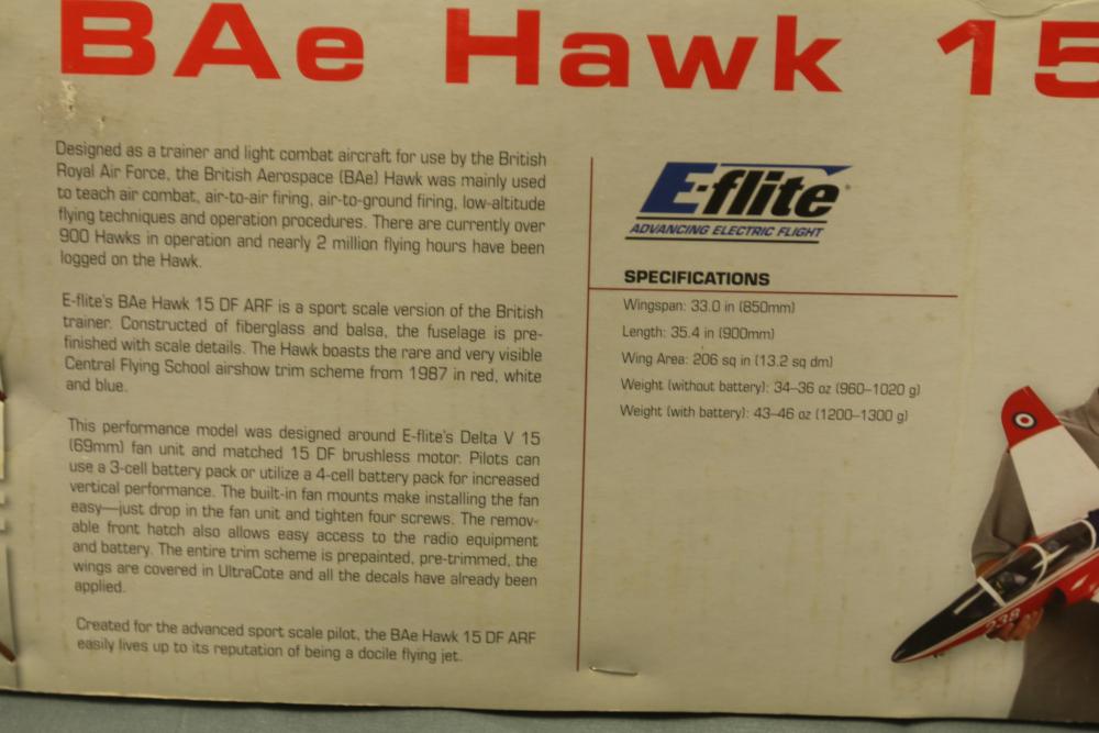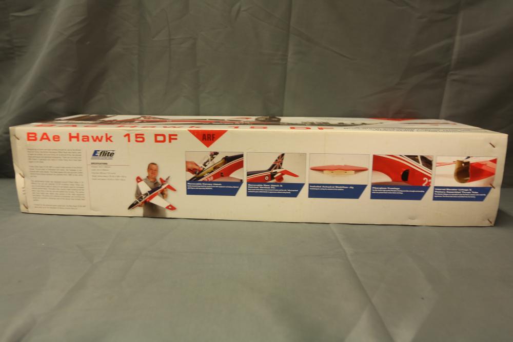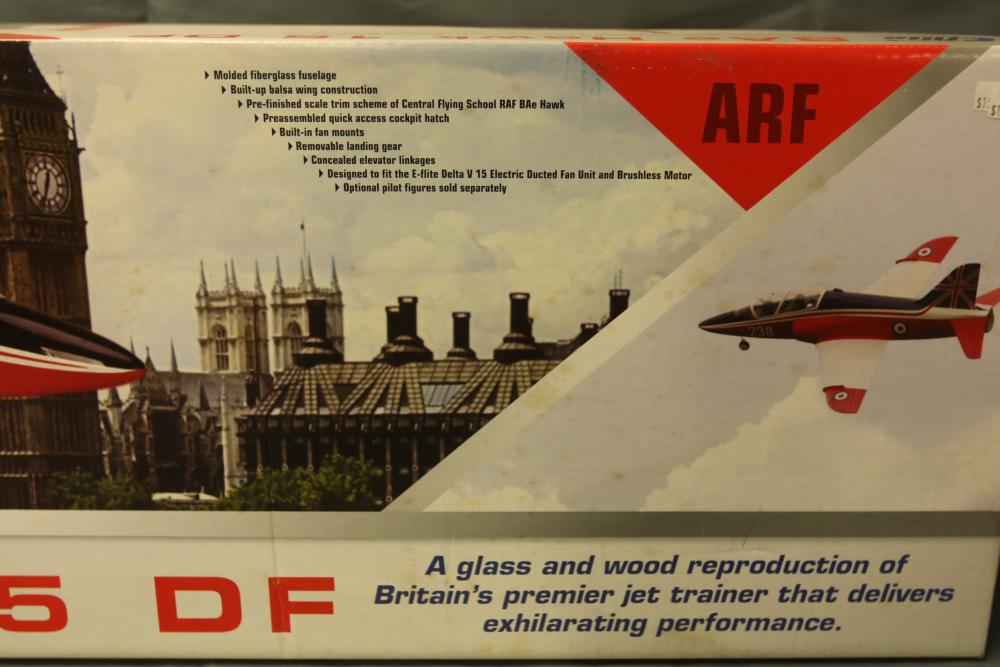 E-flite BAe Hawk 15 DF ARF remote control model featuring a fiberglass fuselage and balsa and plywood wing construction. This pre-assembled scale jet has a wingspan of 30.7 inches and a fuselage length of 32.9 inches. It requires additional components to complete, as outlined in the specifications. Packaged in original box.