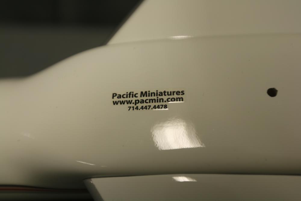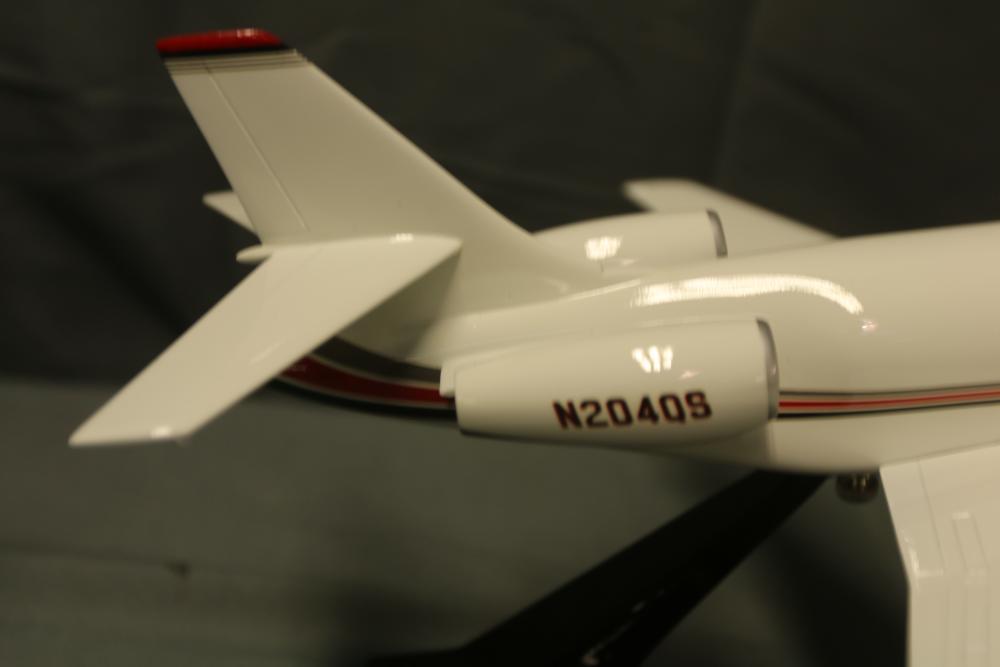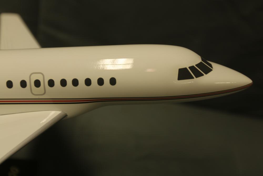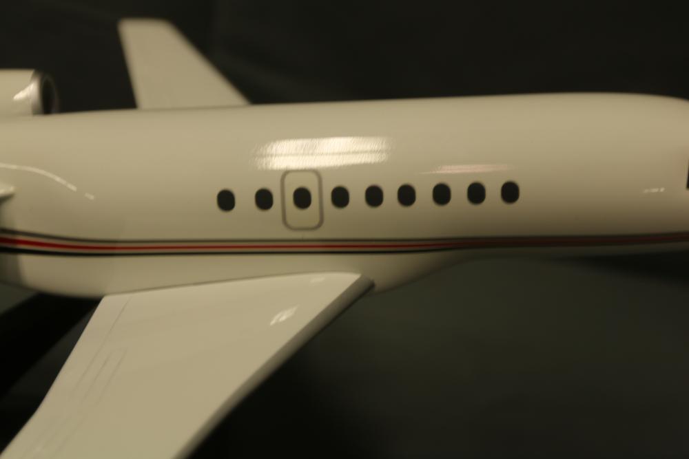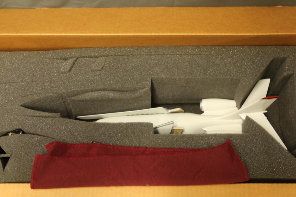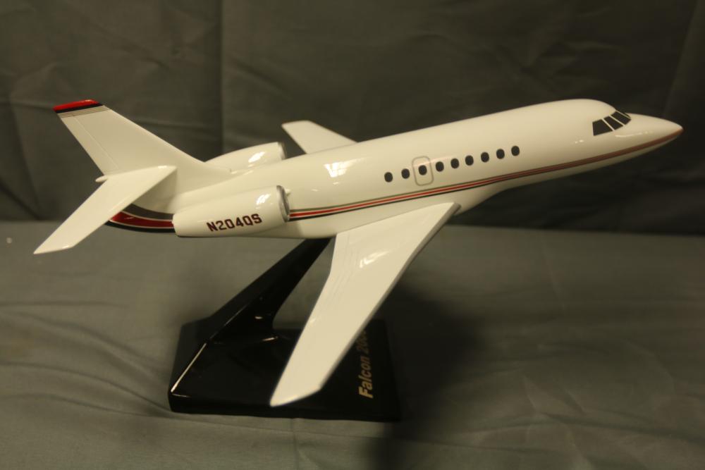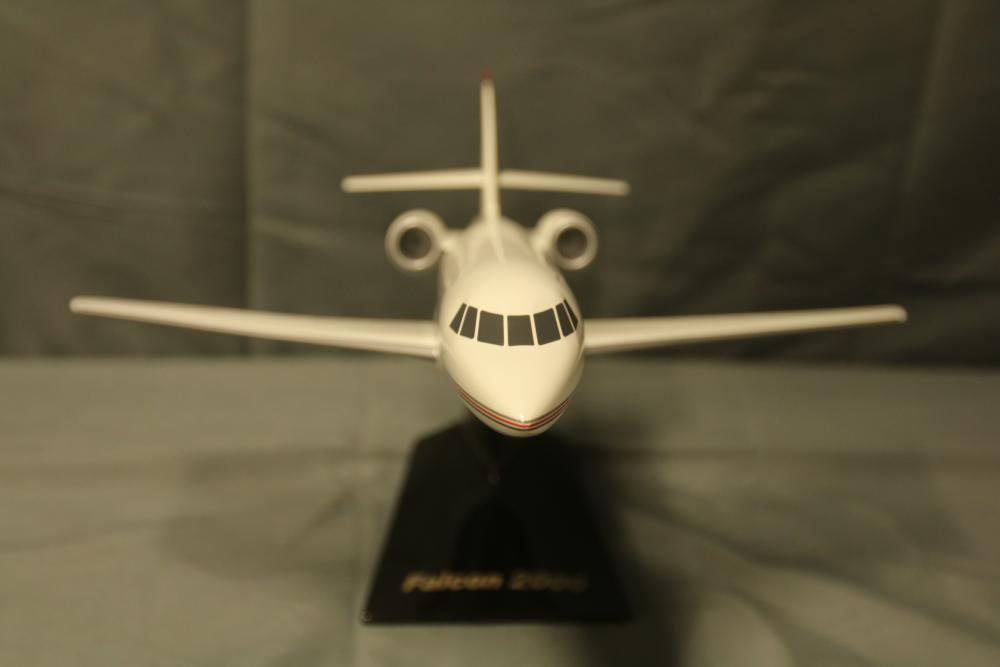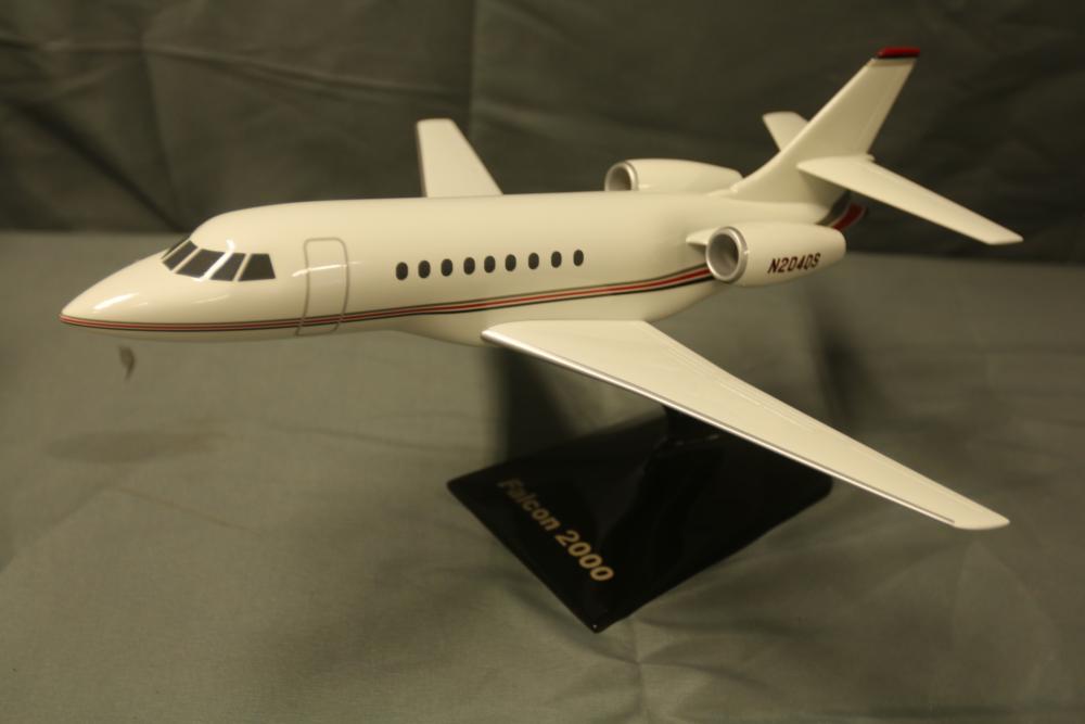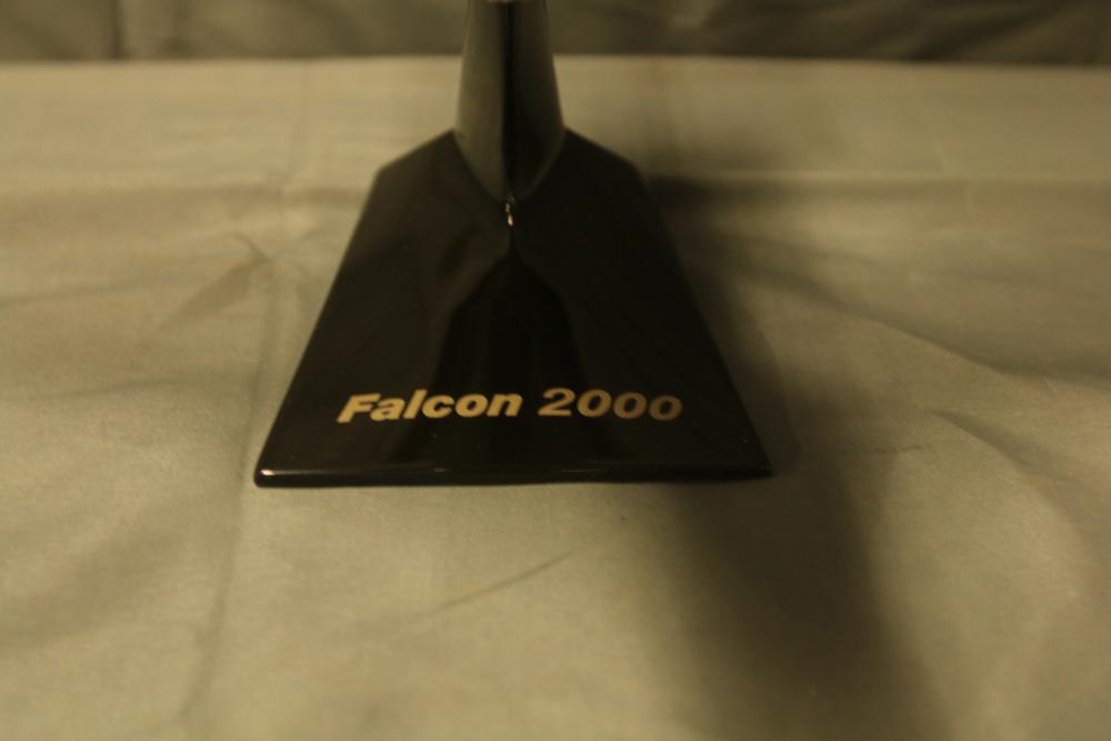 PacMin Falcon 2000 desktop model featuring detailed craftsmanship. Includes custom stand with 'Falcon 2000' inscribed. The model measures approximately the scale of a standard desktop display. Comes packaged in its original foam-lined box for storage or transportation.