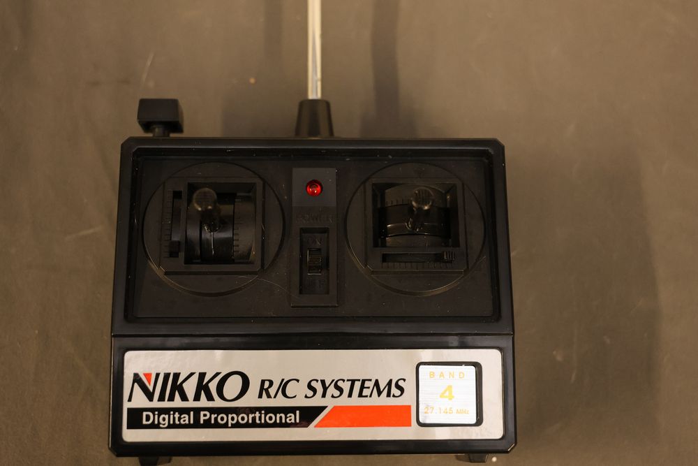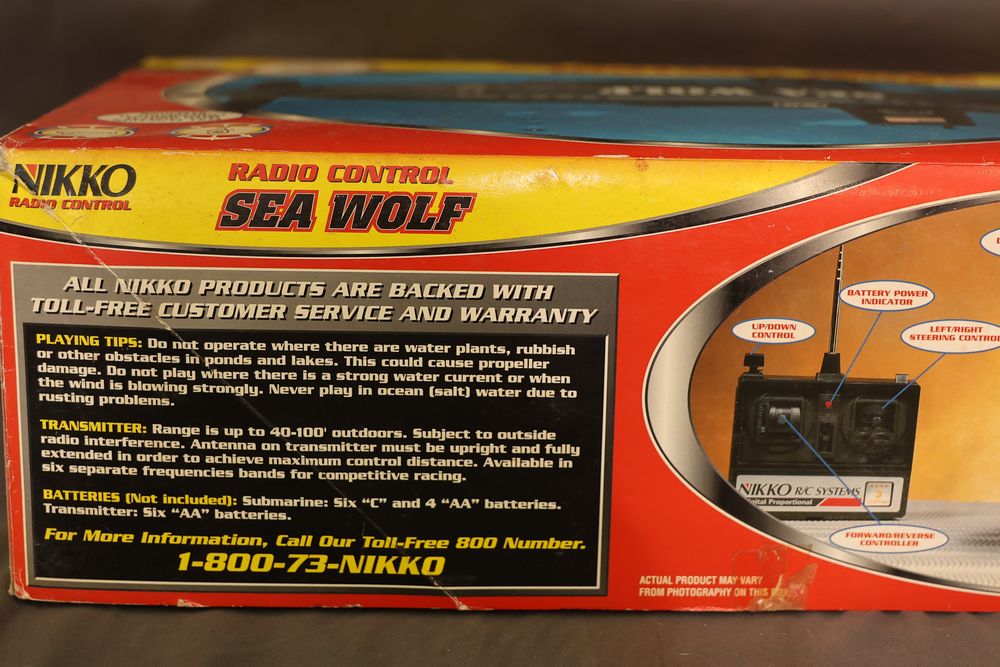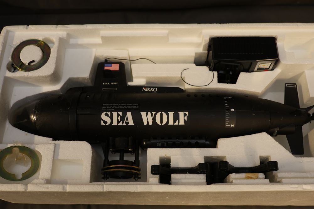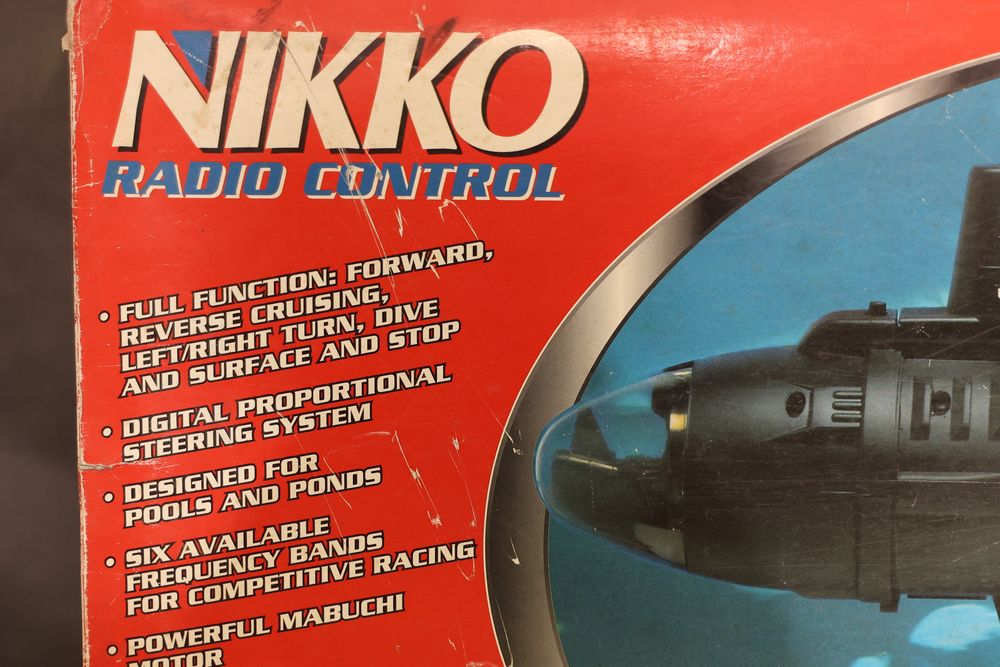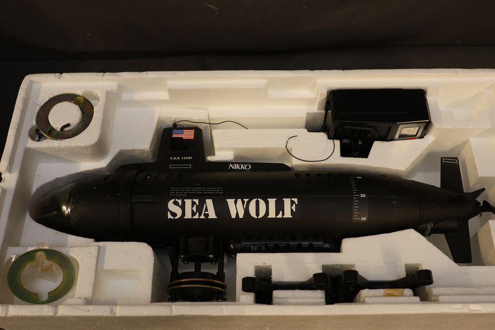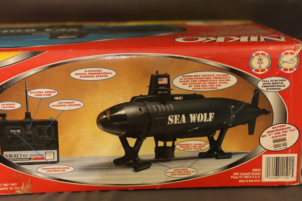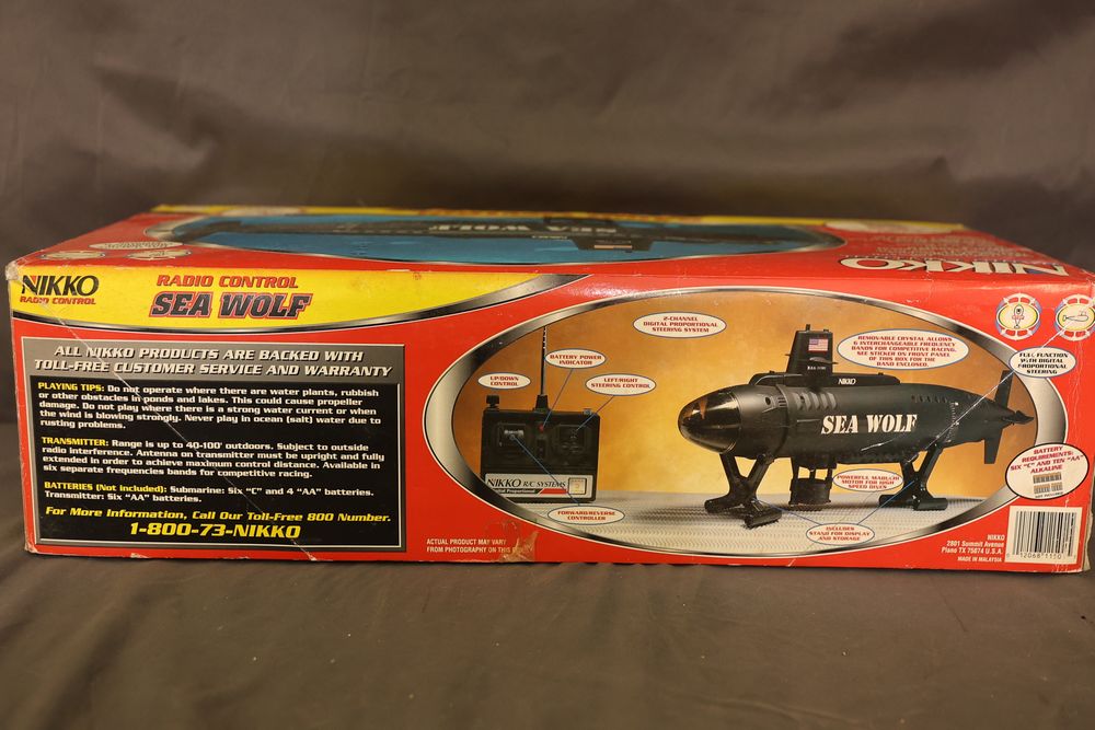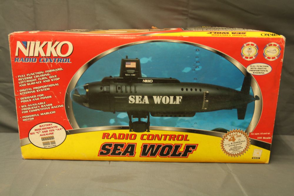 Nikko radio-controlled Sea Wolf submarine featuring forward, reverse, left/right turns, and dive/surface capabilities. Includes the original box, digital proportional steering system, transmitter, and components. Designed for pools and ponds. Operates with six selectable frequency bands for racing. Pickup only.