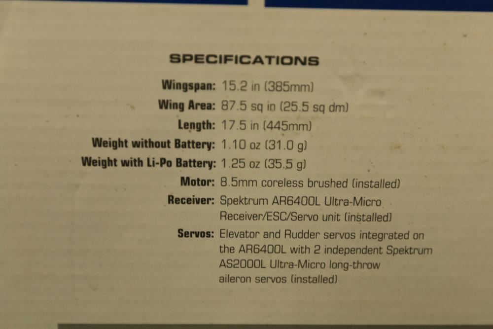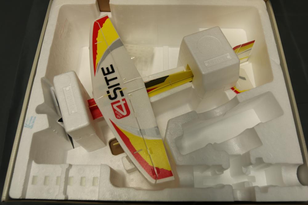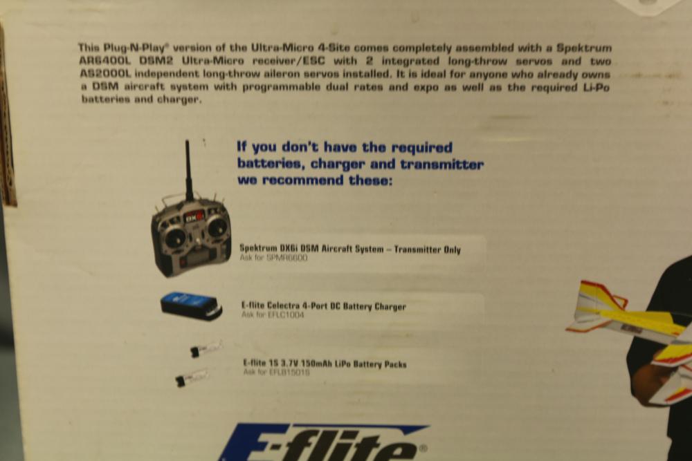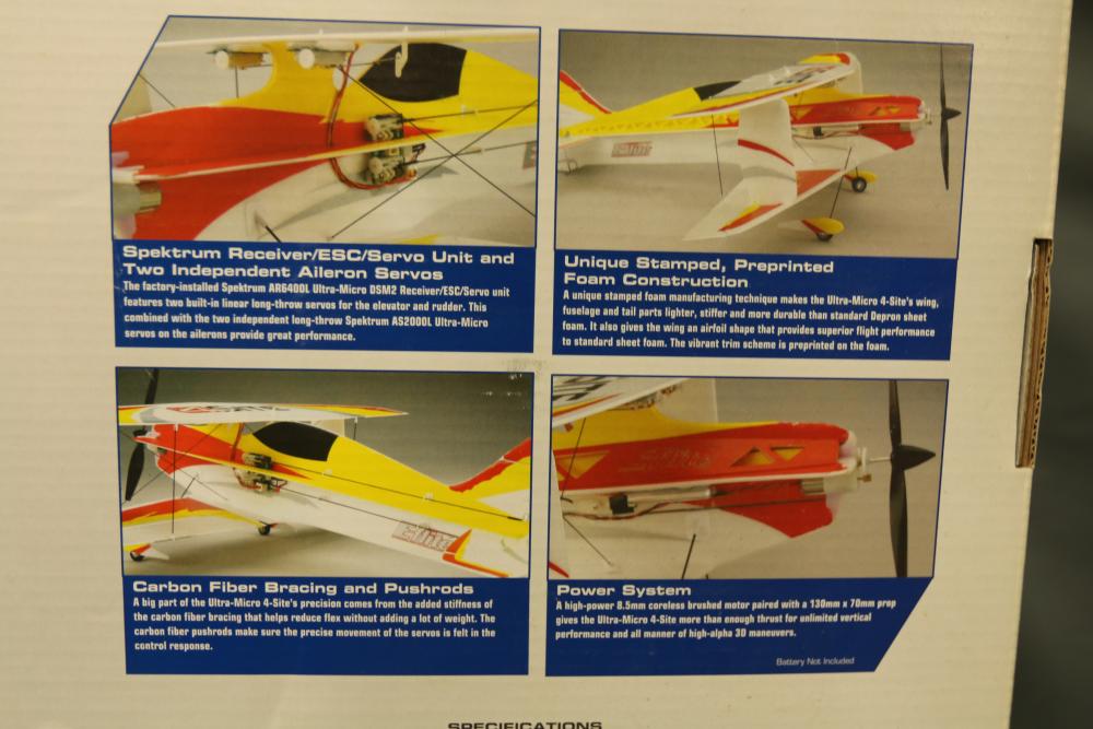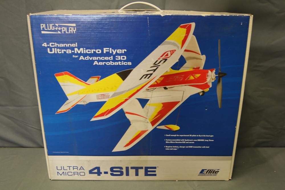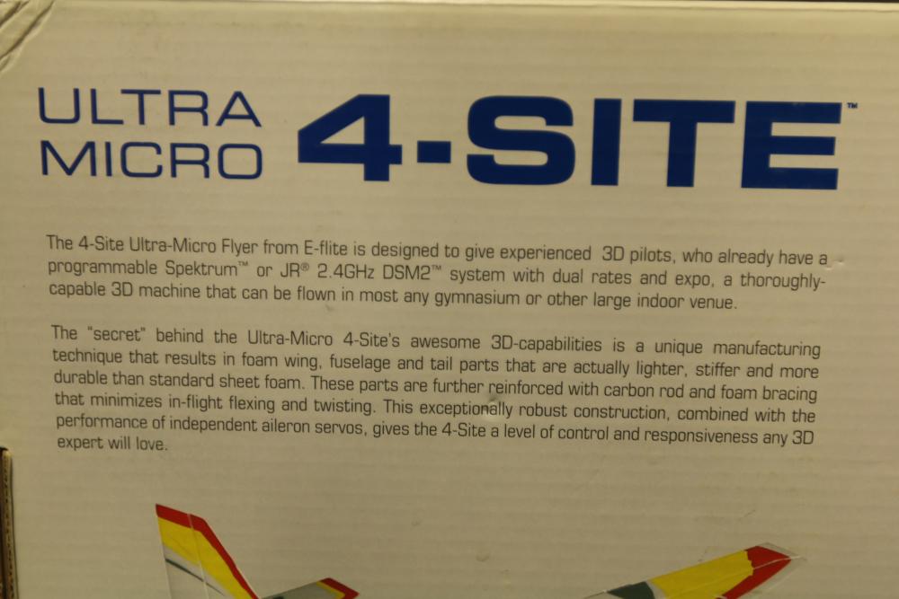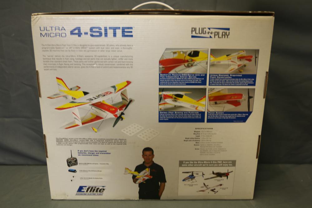 Radio Controlled (RC) E-flite Plug-N-Play Ultra-Micro 4-Site 4-channel flyer for advanced 3D aerobatics. Includes preinstalled components, such as an 8.5 mm coreless motor, Spektrum AR6400L Ultra-Micro receiver/ESC/servo unit, and carbon-fiber bracing. Specifications: wingspan 15.2 in, length 17.5 in, weight 1.25 oz with battery. Requires separate transmitter, batteries, and charger. Original packaging included.