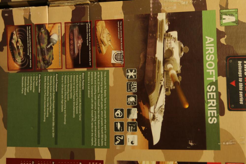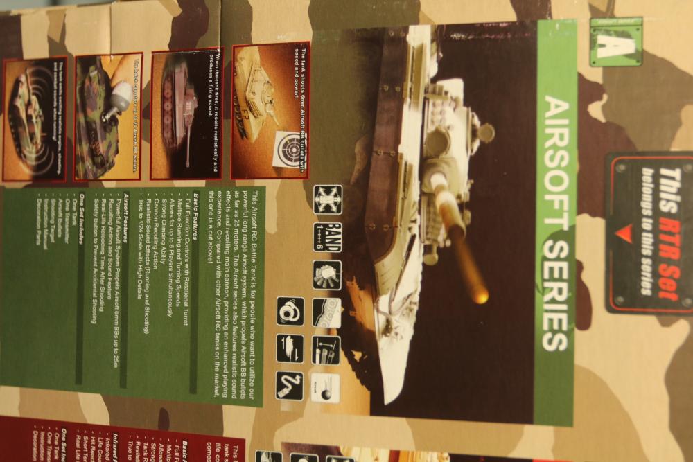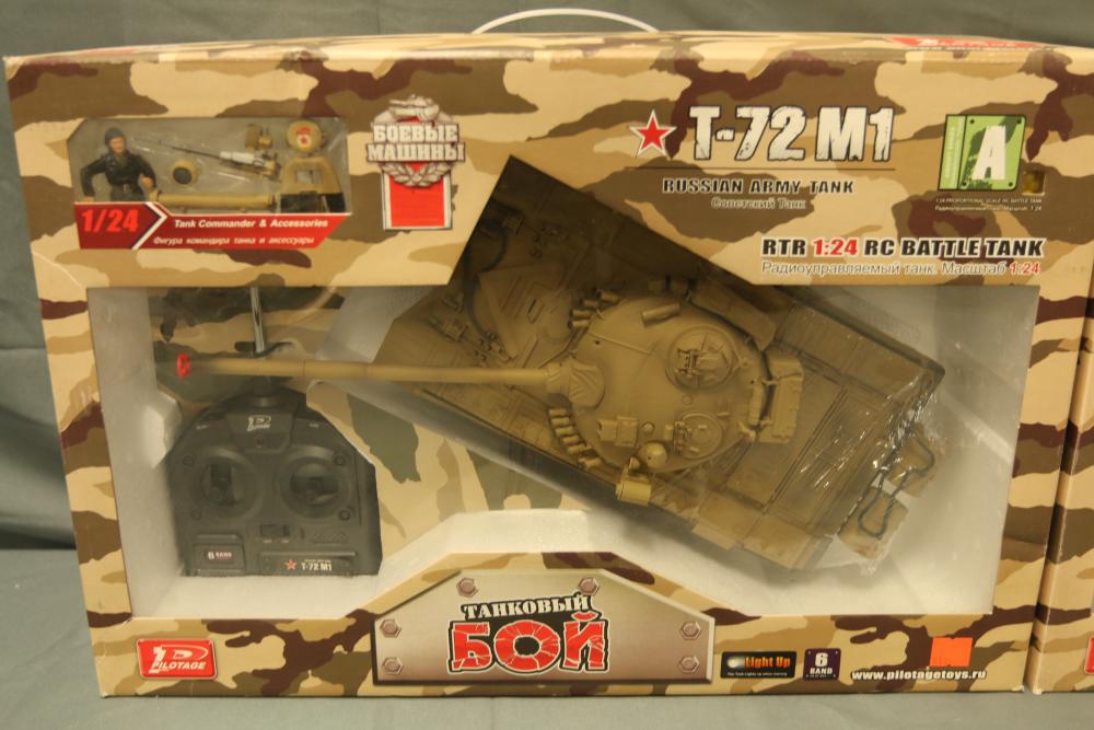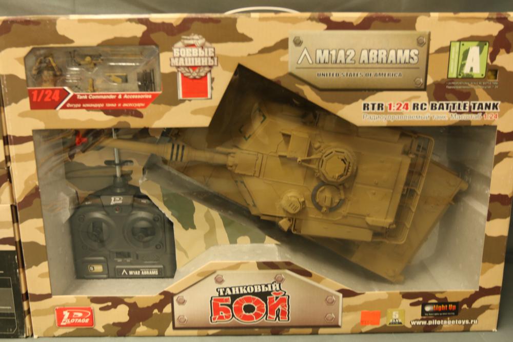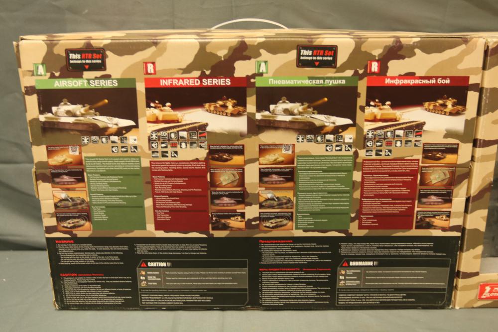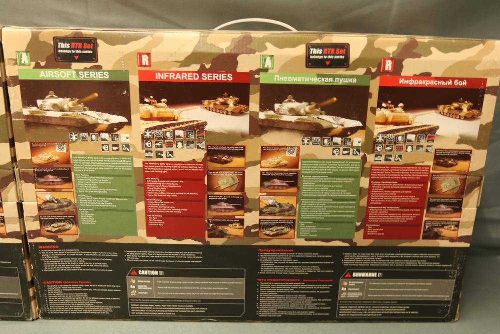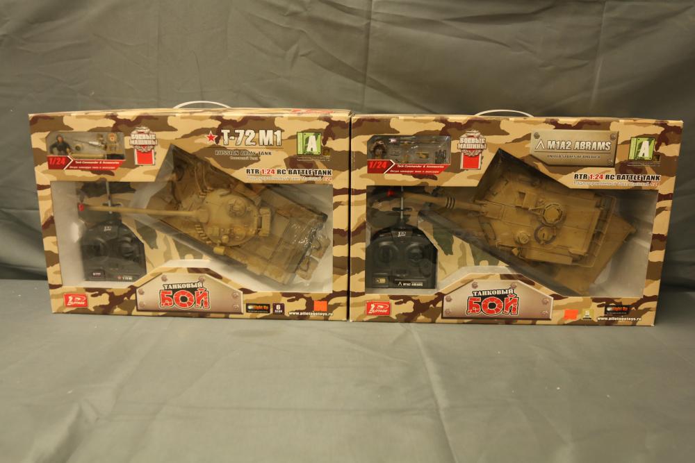 Includes two 1:24 scale radio-controlled battle tanks: T-72M1 and M1A2 Abrams. Both tanks are from the Airsoft Series and feature RTR functionality, infrared capabilities, and intricate detailing. Packaged with remote controllers and additional small accessories.