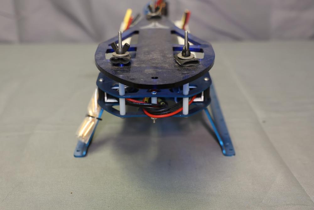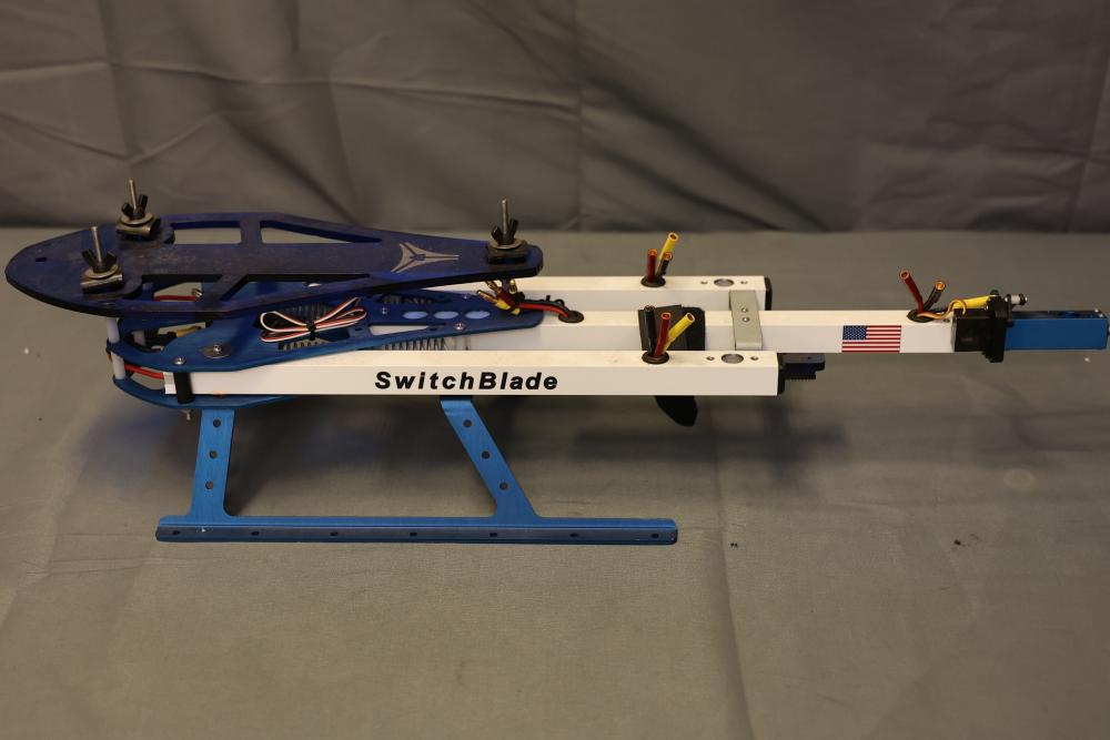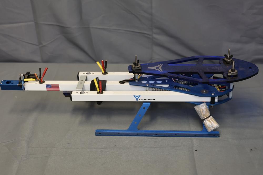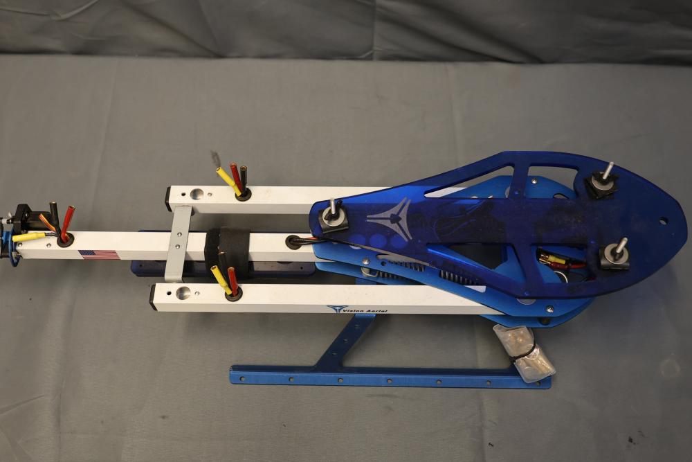 SwitchBlade RC helicopter frame featuring a durable blue and white metal construction. Includes various wiring and attached components suitable for remote control helicopter builds. The frame showcases mounting points and structural design tailored for RC use. Pickup only.