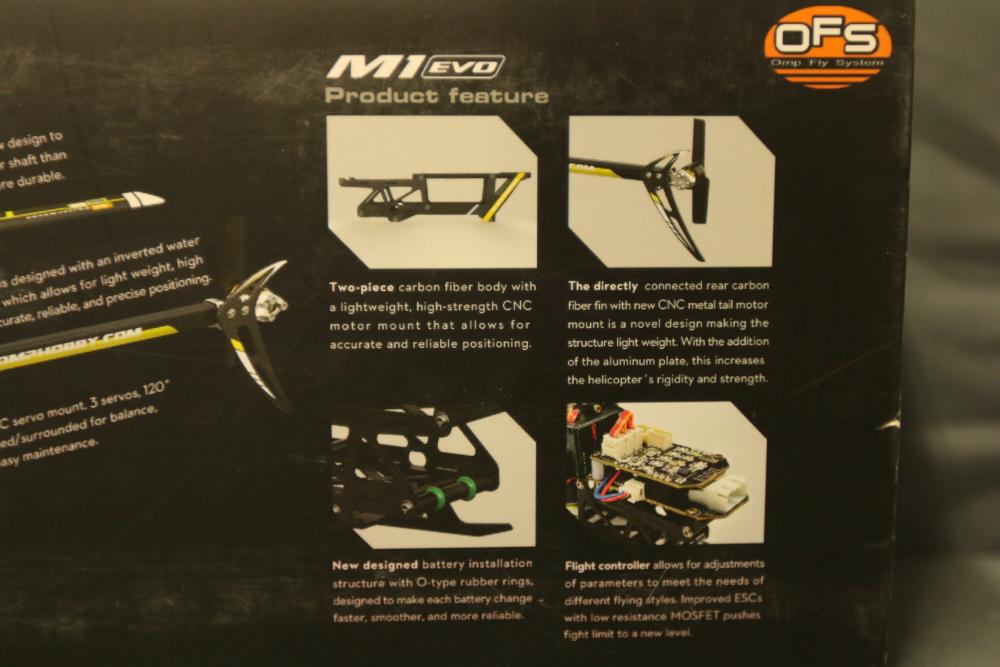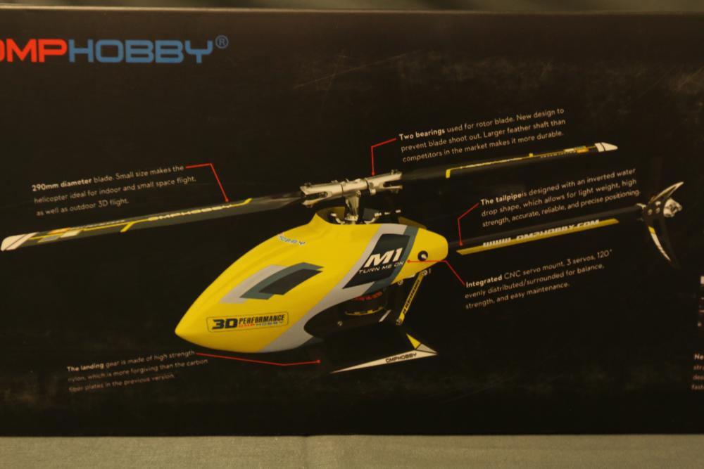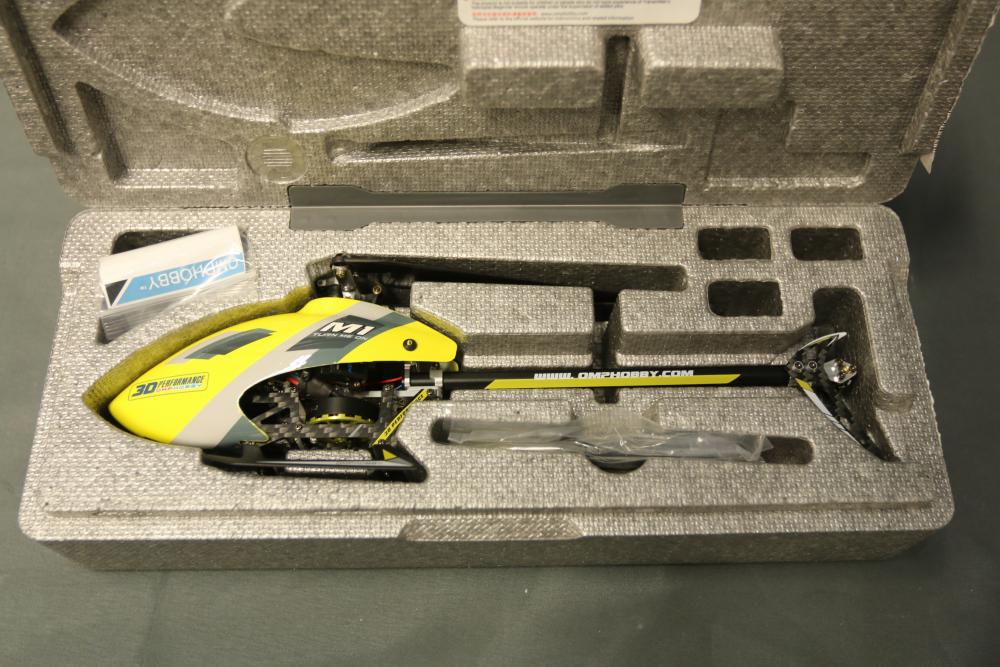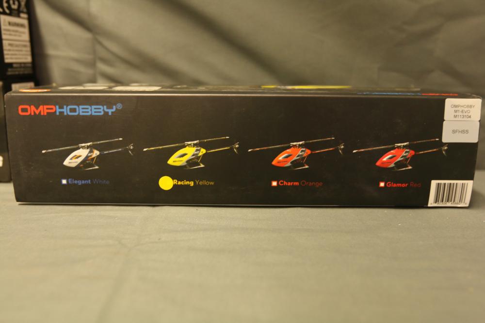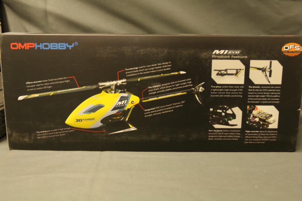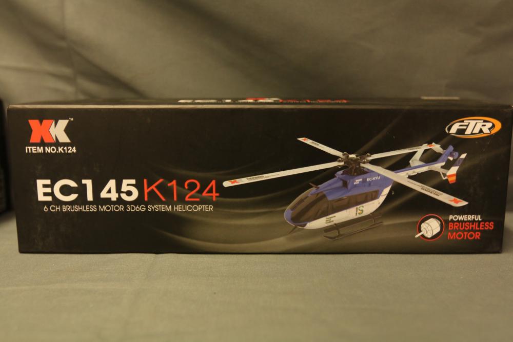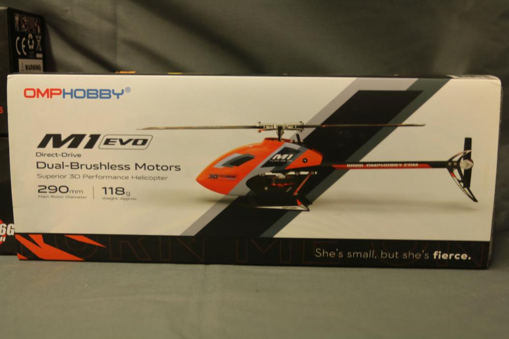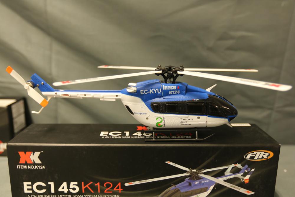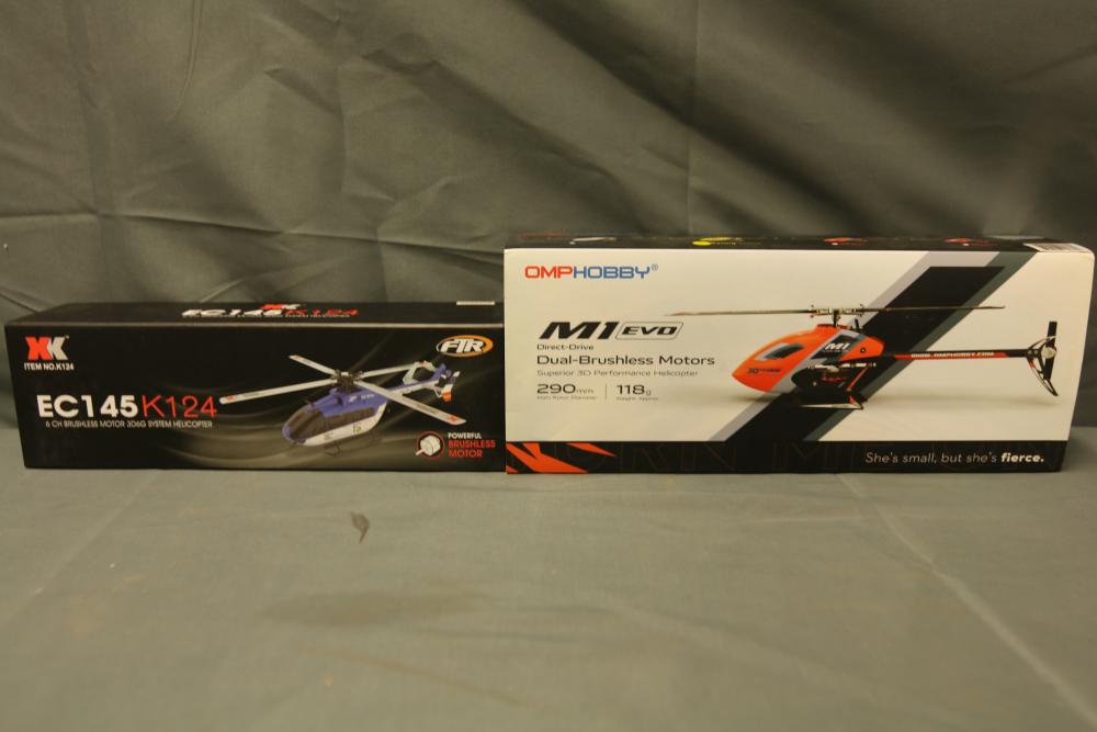 Two Radio Controlled (RC) helicopter models: XK EC145 K124 with a brushless motor and 3D6G system, and OMPHOBBY M1 EVO featuring a dual-brushless motor and direct-drive design. M1 EVO includes a carbon fiber frame and advanced flight control features. Both appear unused and are housed in their original packaging.