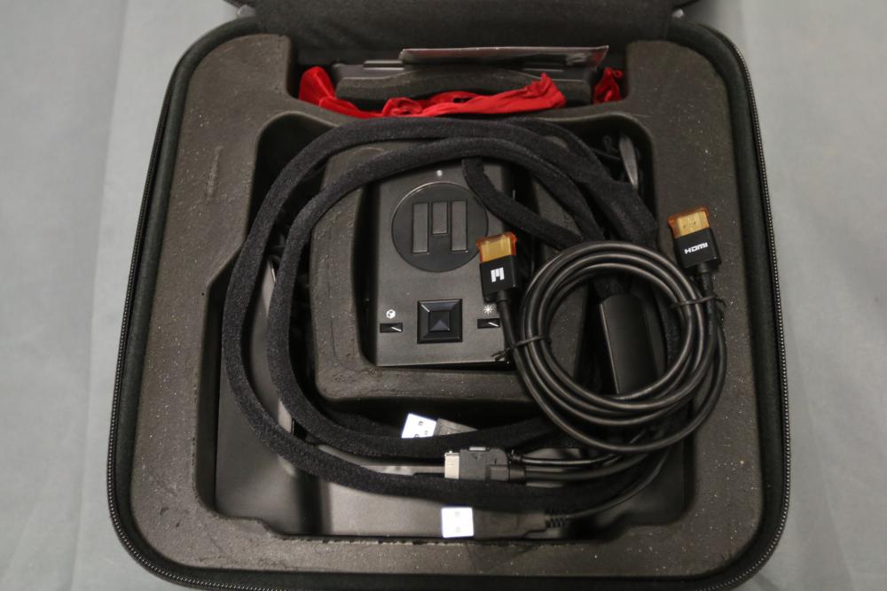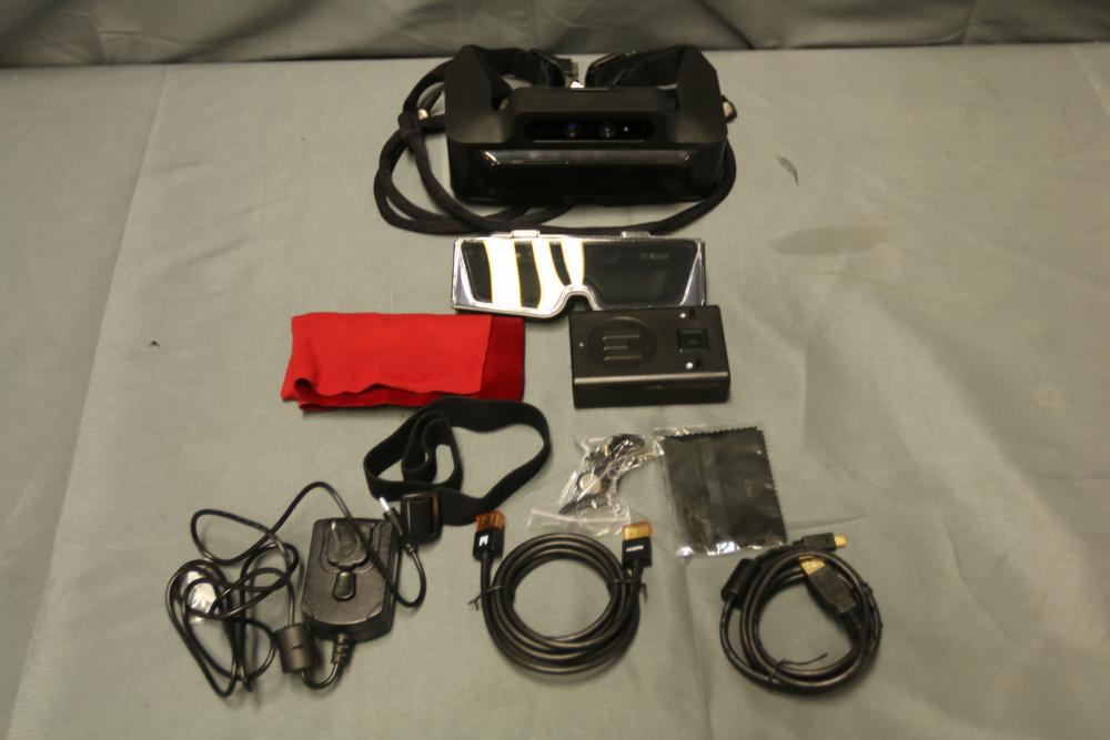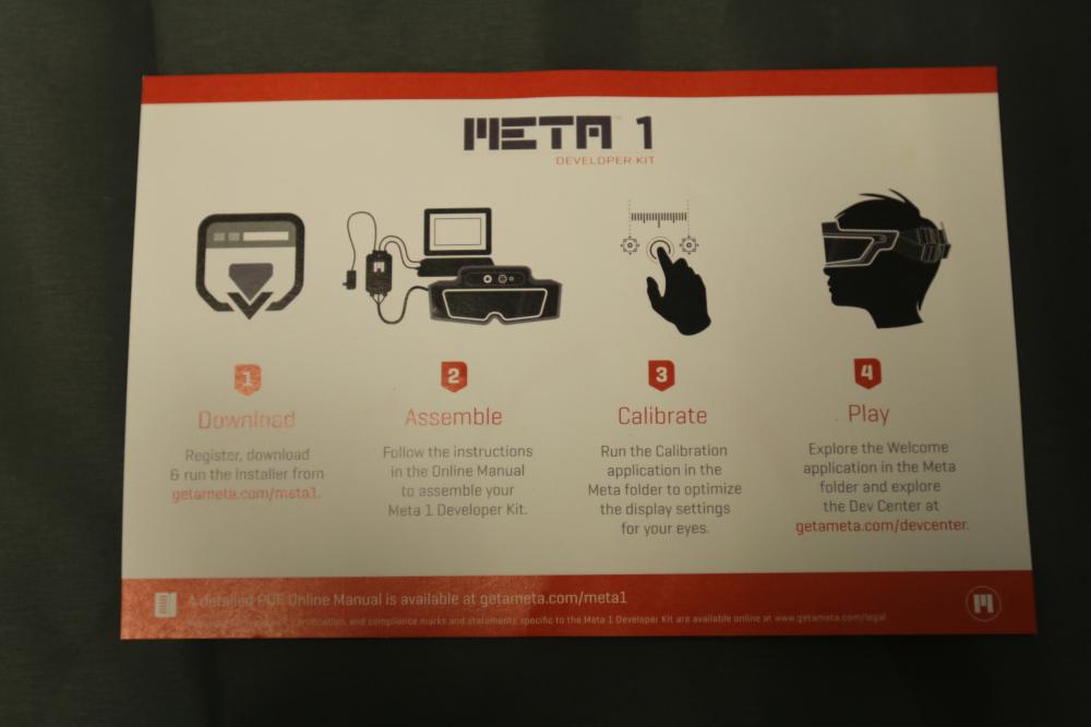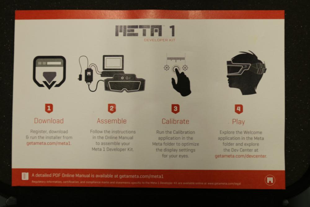 Meta 1 Developer Kit including headset, control box, USB, HDMI, and other cables, earphones, cloth, carrying case, and instructional booklet. Designed for augmented reality applications. Includes all listed components in a compact protective case.