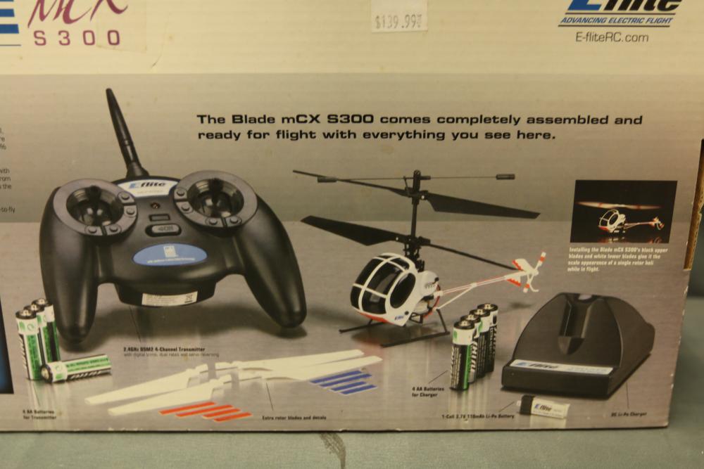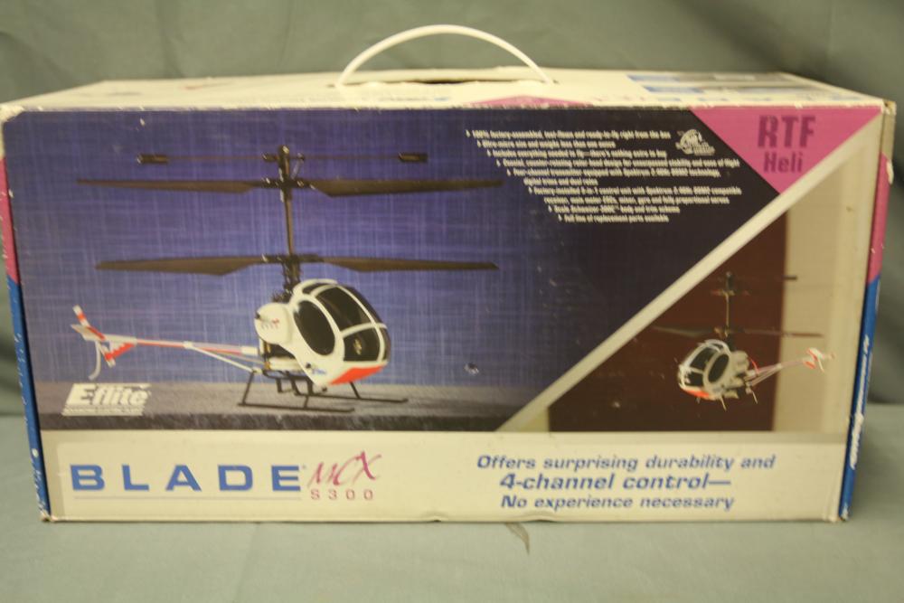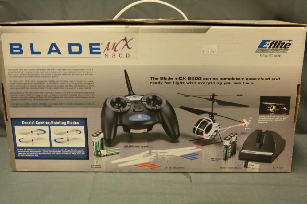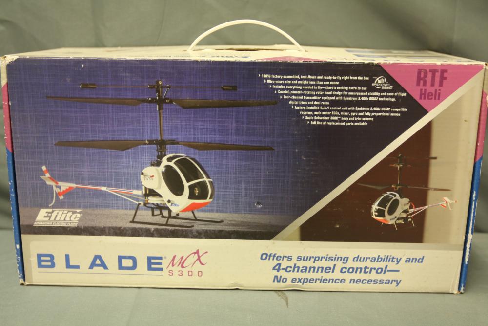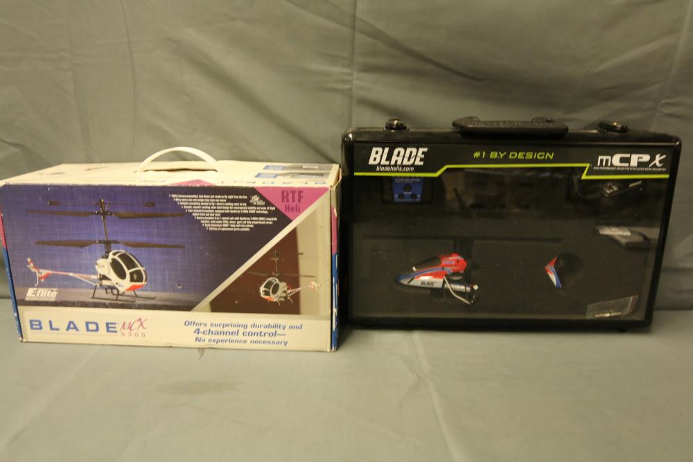 Blade mCX S300 and mCP X Radio Controlled (RC) remote-controlled helicopters, including original packaging, transmitters, batteries, manuals, chargers, and additional components. Both helicopters are ready-to-fly models and include foam-lined cases for storage or transport.