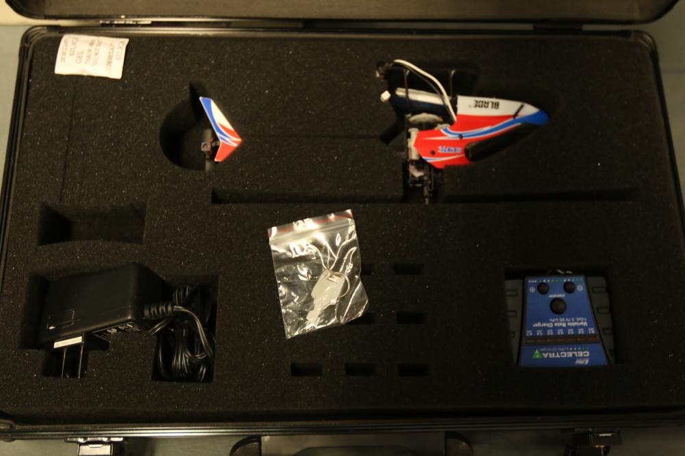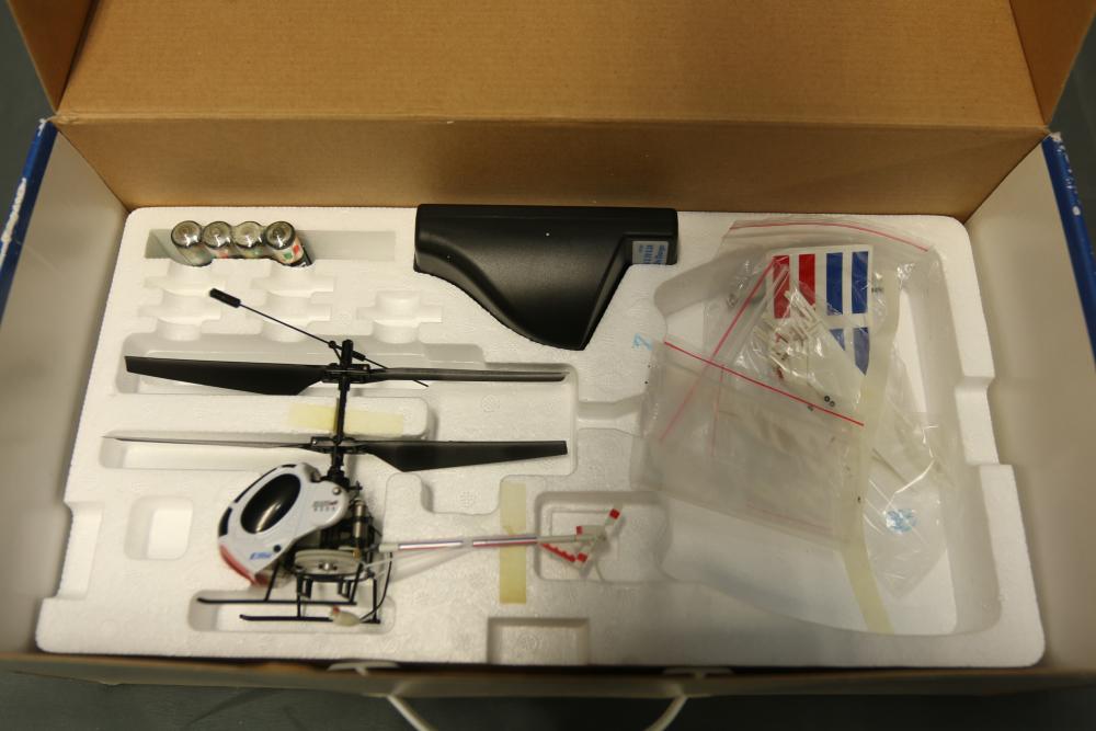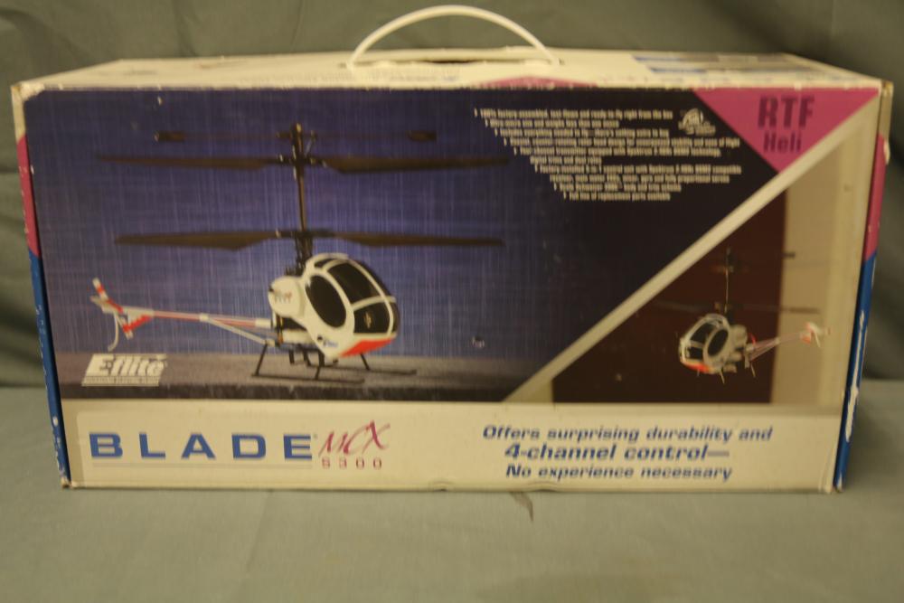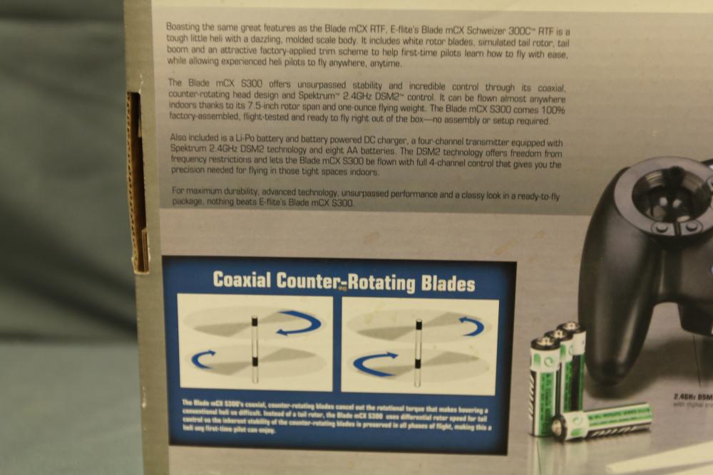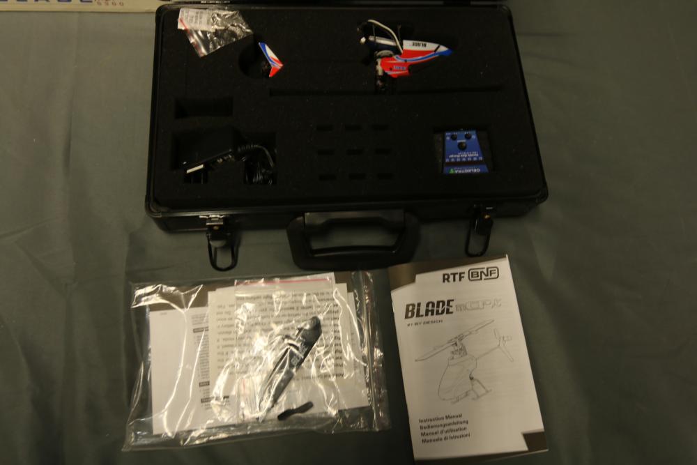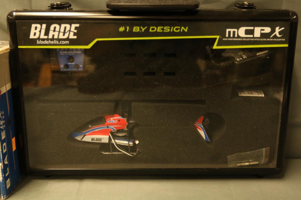 Blade mCX S300 and mCP X Radio Controlled (RC) remote-controlled helicopters, including original packaging, transmitters, batteries, manuals, chargers, and additional components. Both helicopters are ready-to-fly models and include foam-lined cases for storage or transport.
