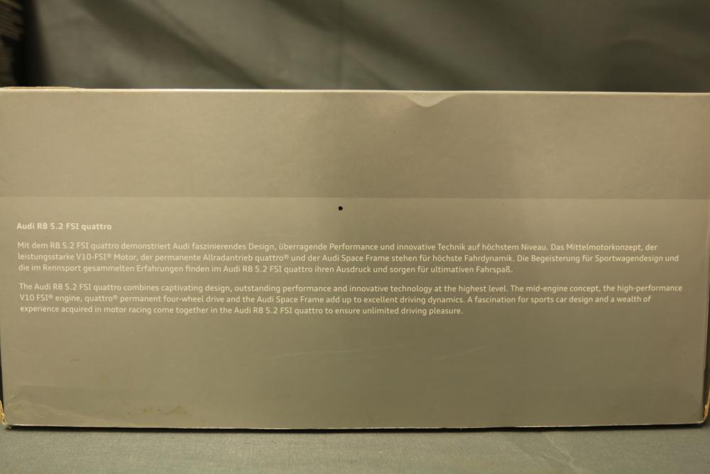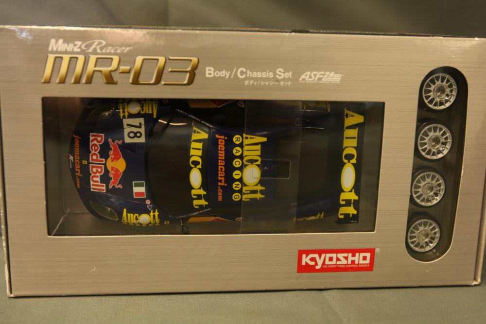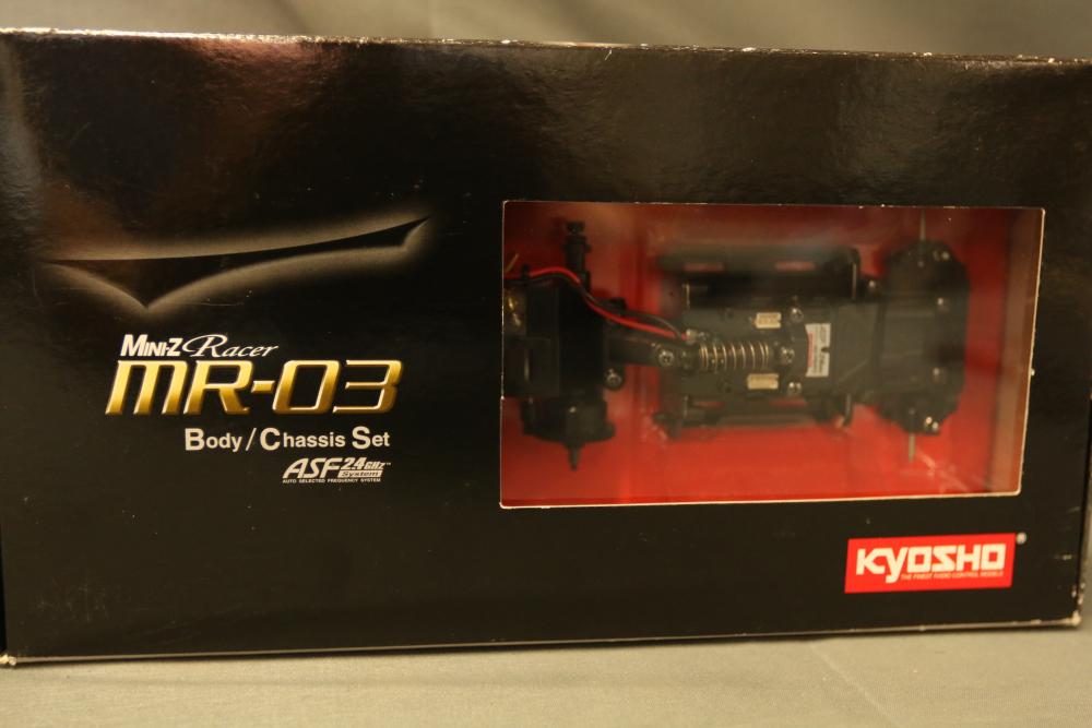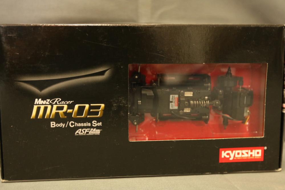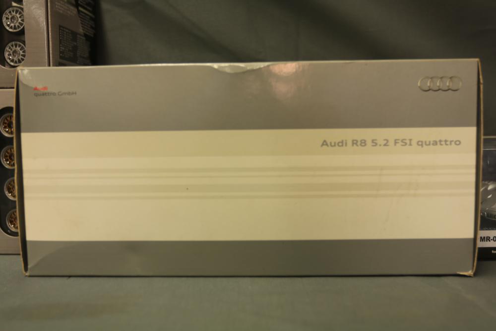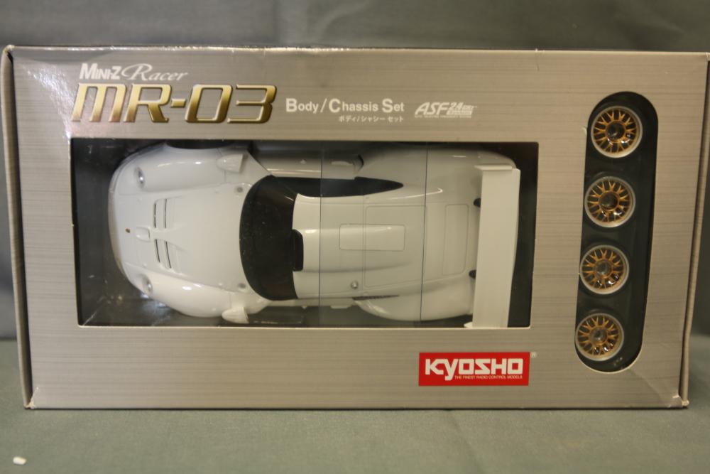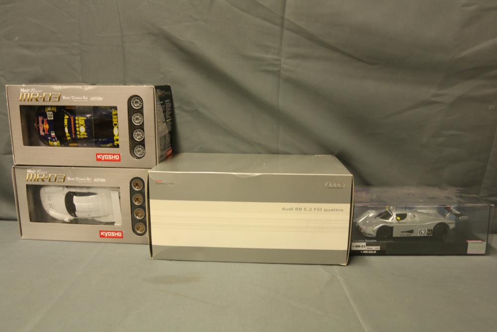 Includes Kyosho Mini-Z Racer MR-03 Body/Chassis Sets in original packaging, Ferrari F430 GT, and Porsche 911 GT1 car body styles. Also includes a 1:18 scale diecast model of the Audi R8 5.2 FSI Quattro with functional doors, hood, and trunk, as marked on the box. A Sauber Mercedes C9 body for MR-03 models is also enclosed, all in original packaging.