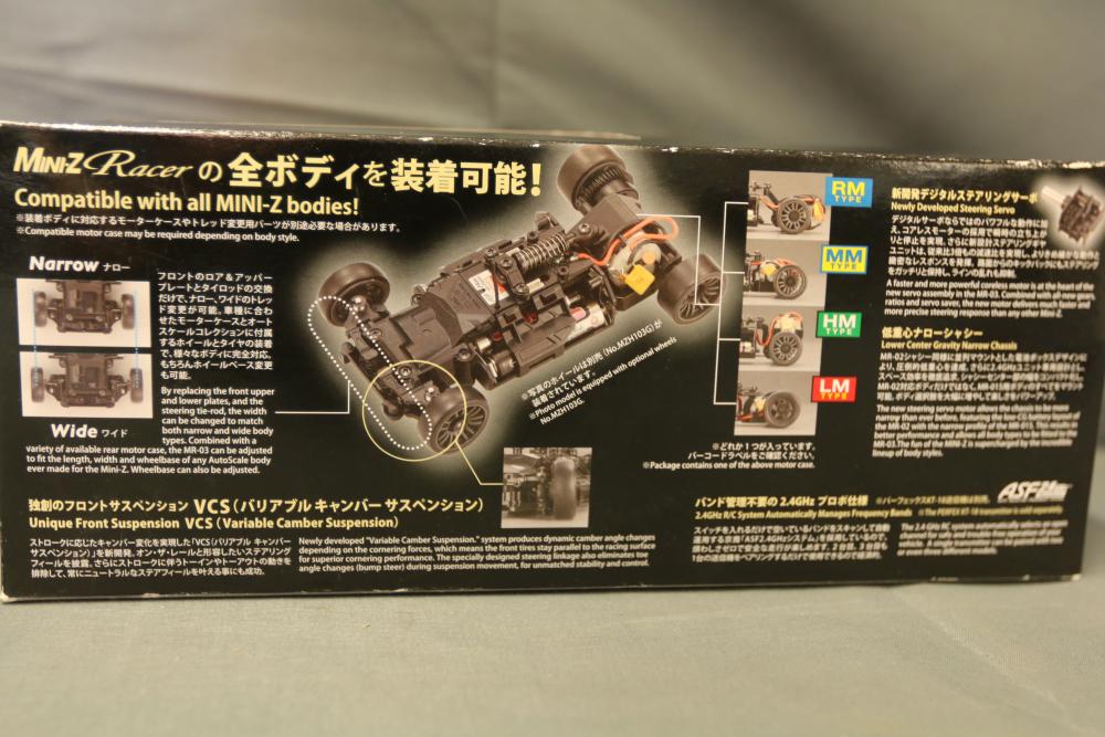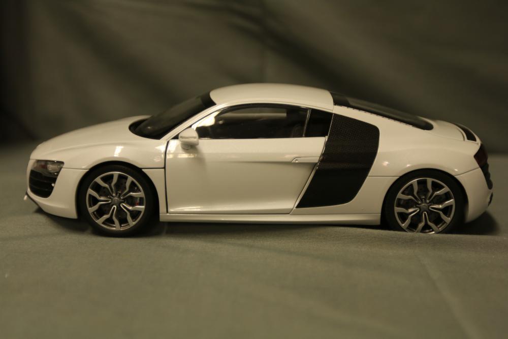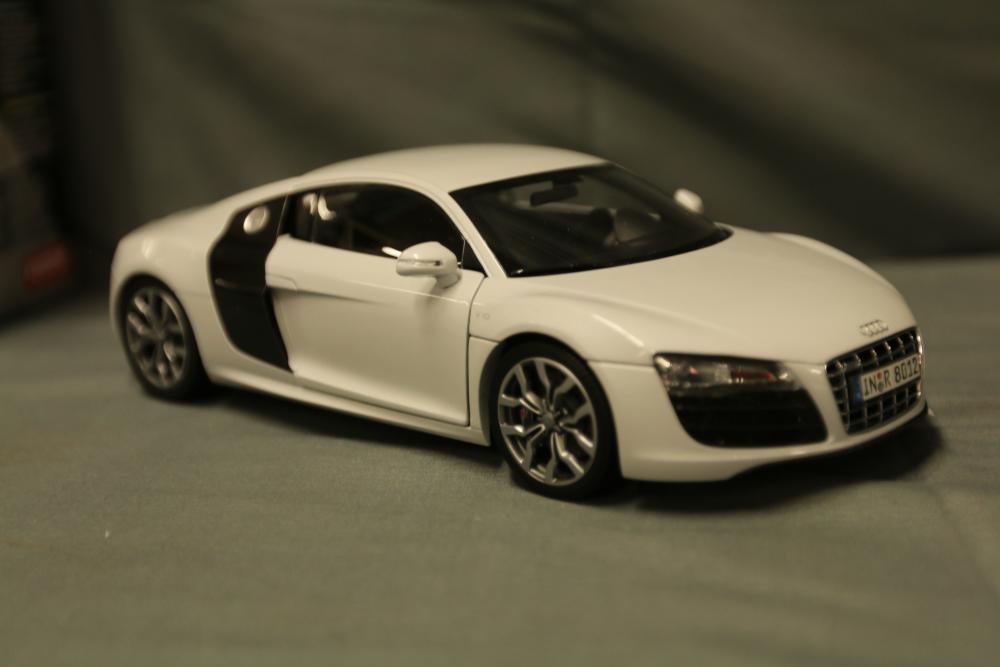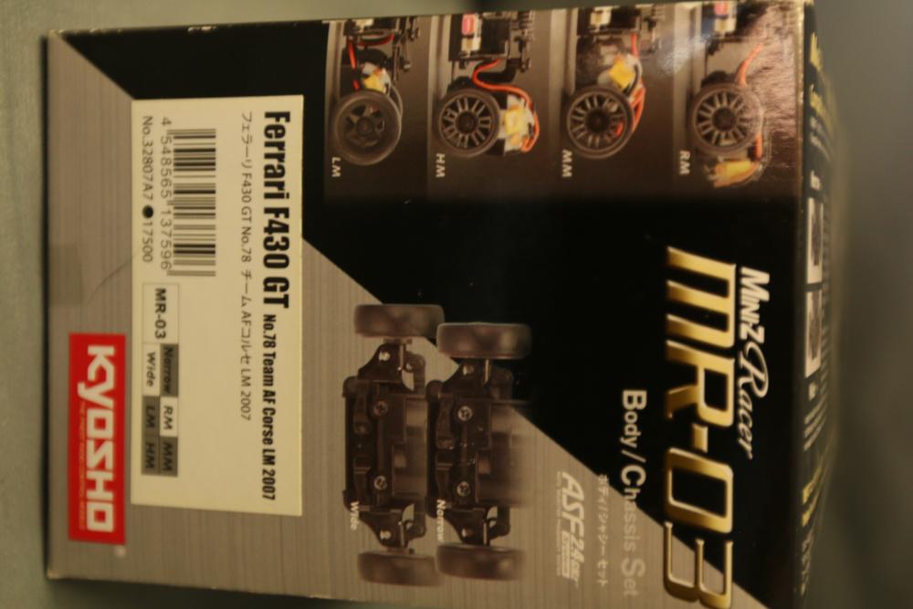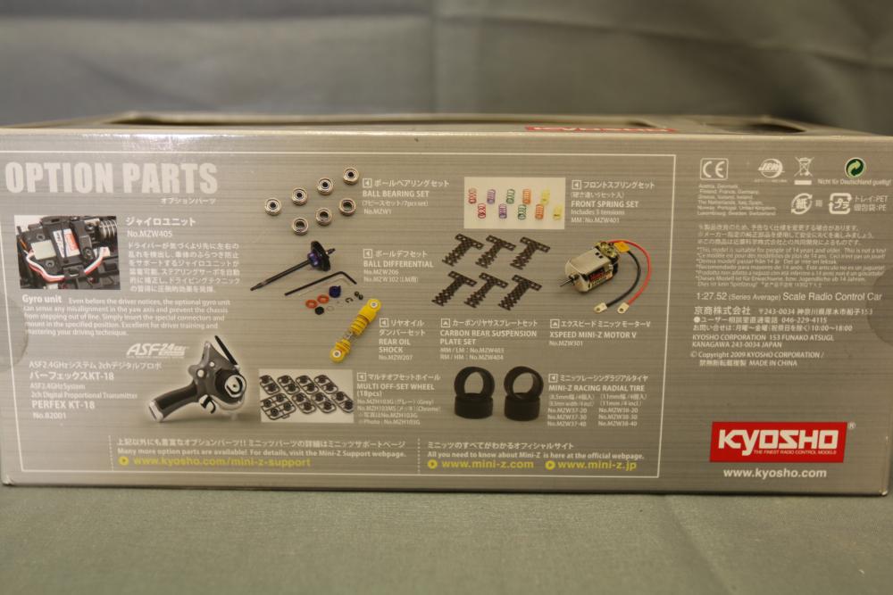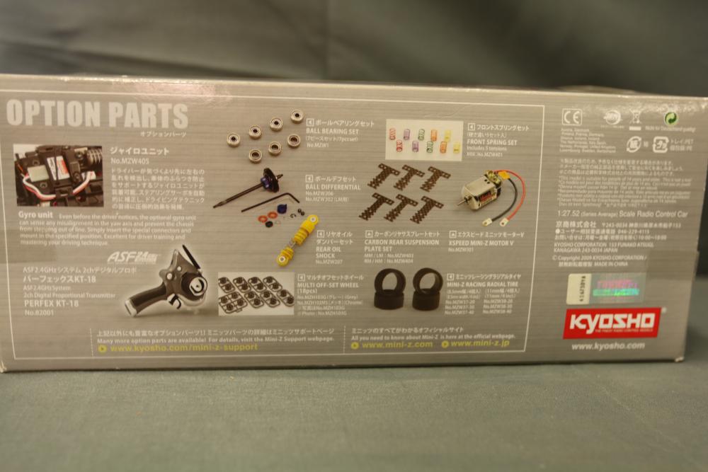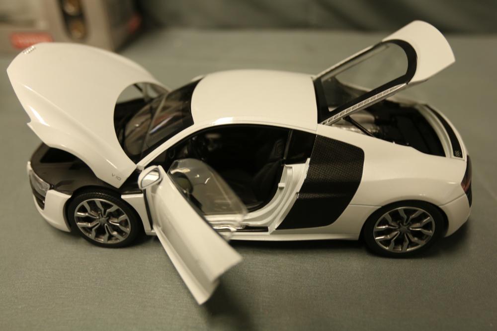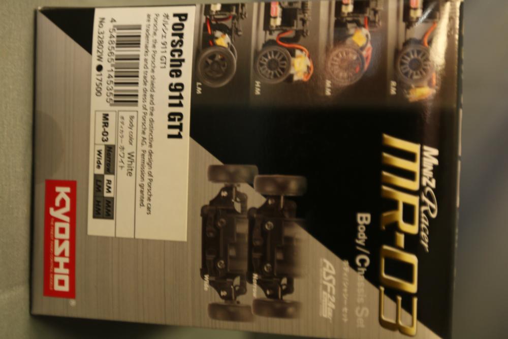 Includes Kyosho Mini-Z Racer MR-03 Body/Chassis Sets in original packaging, Ferrari F430 GT, and Porsche 911 GT1 car body styles. Also includes a 1:18 scale diecast model of the Audi R8 5.2 FSI Quattro with functional doors, hood, and trunk, as marked on the box. A Sauber Mercedes C9 body for MR-03 models is also enclosed, all in original packaging.