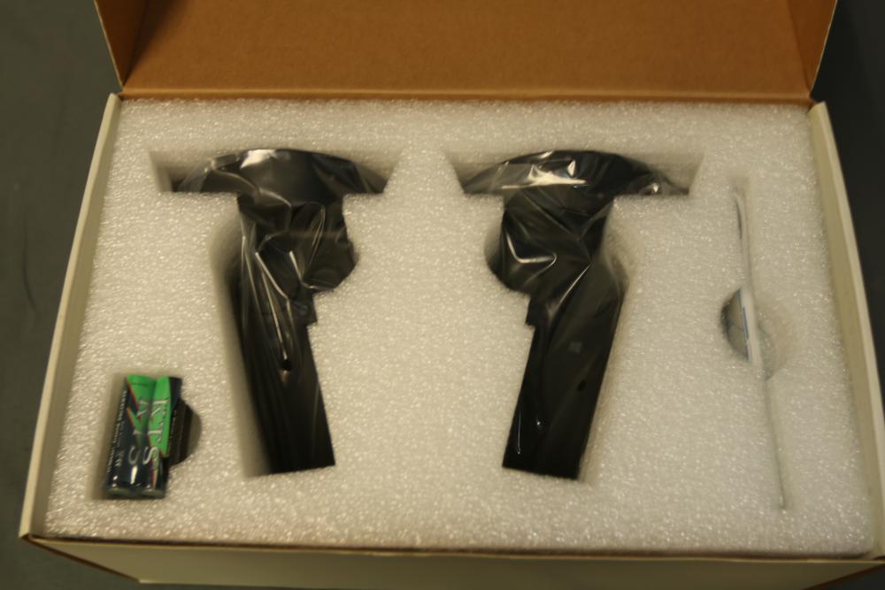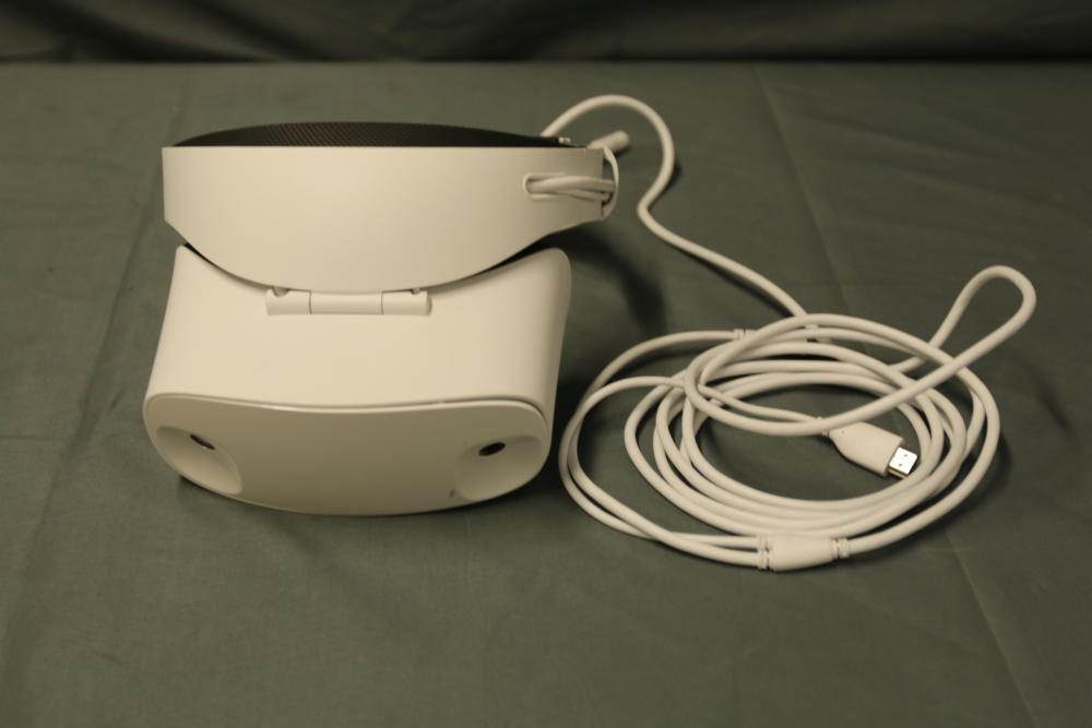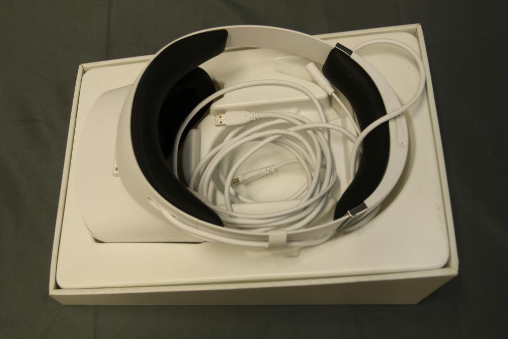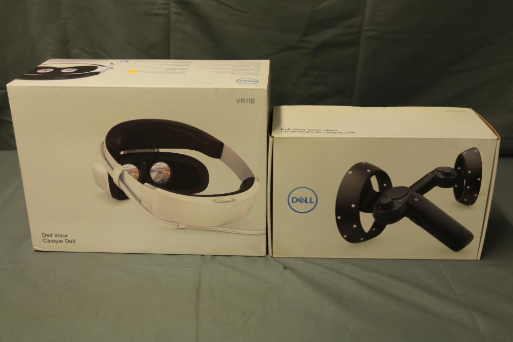 Dell Visor VR118 virtual reality headset with motion controllers and accessories. Includes a white headset with built-in USB and HDMI cables, black motion controllers in original packaging, and replacement batteries. Items are in their original boxes with foam inserts for protection.