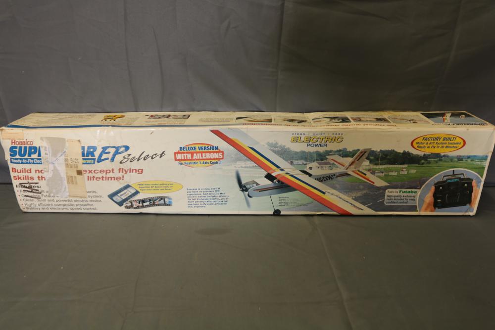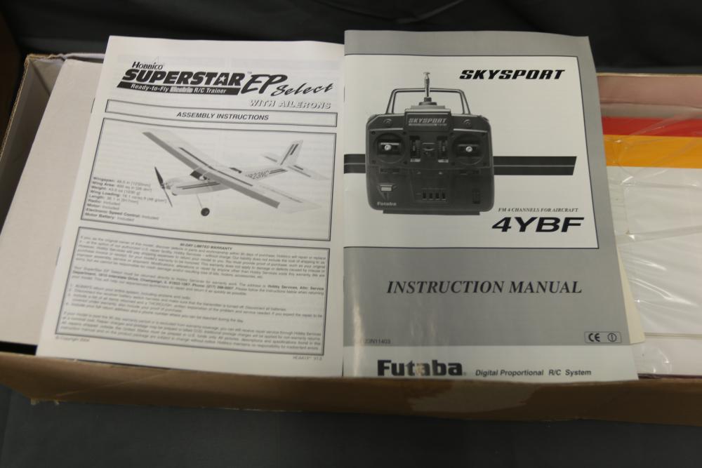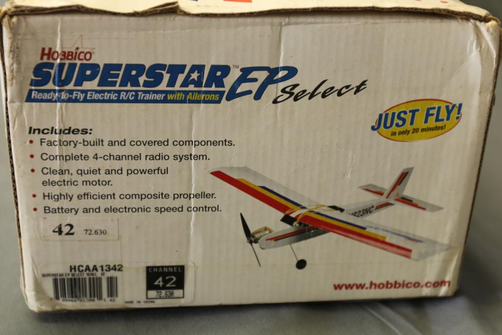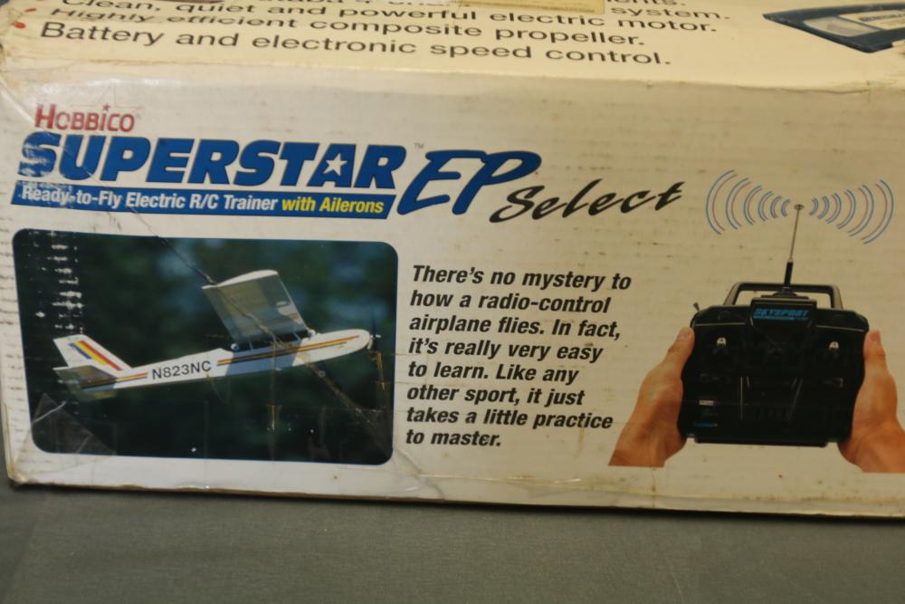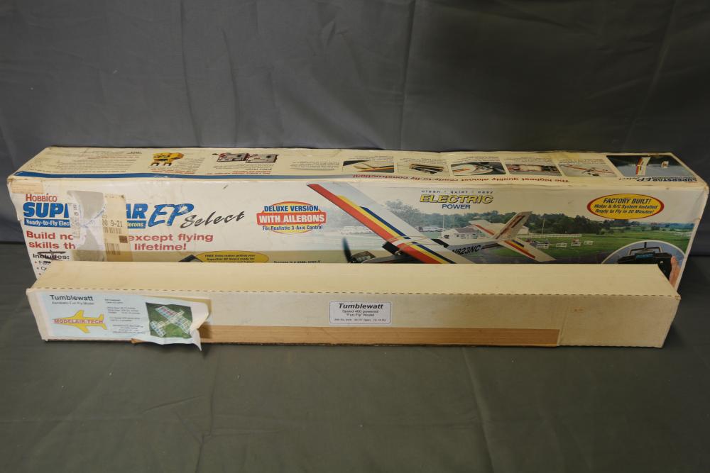 Hobbico Superstar EP Select ready-to-fly electric R/C trainer with factory-built components, electric motor, and Futaba 4-channel radio system. Includes manual and original packaging. Also includes Tumblewatt aerobatic fun fly model kit with a 26.75-inch wingspan, laser-cut parts, and packaging.