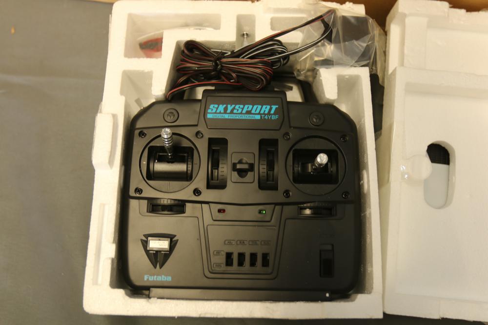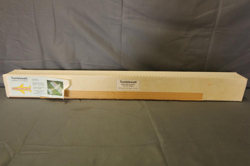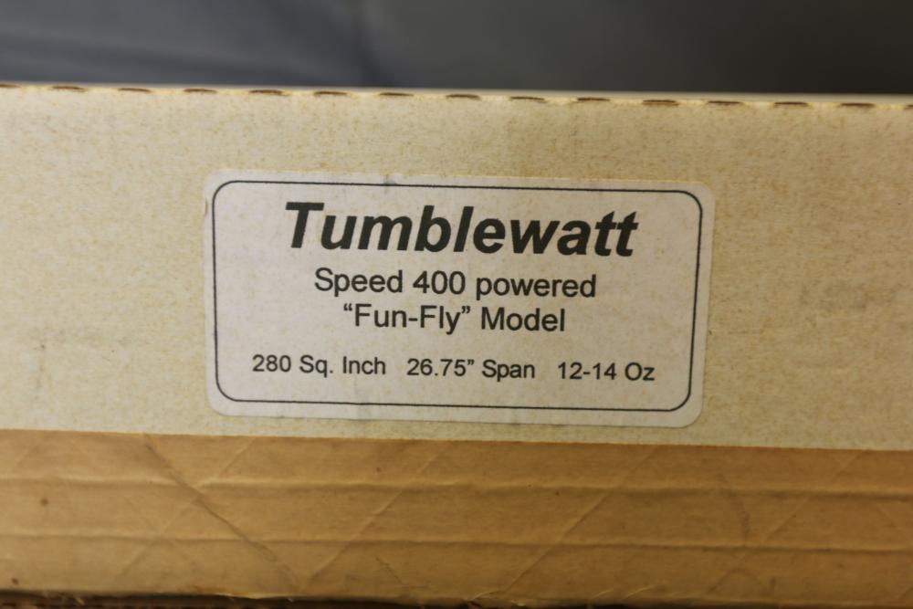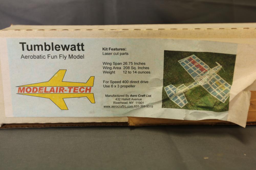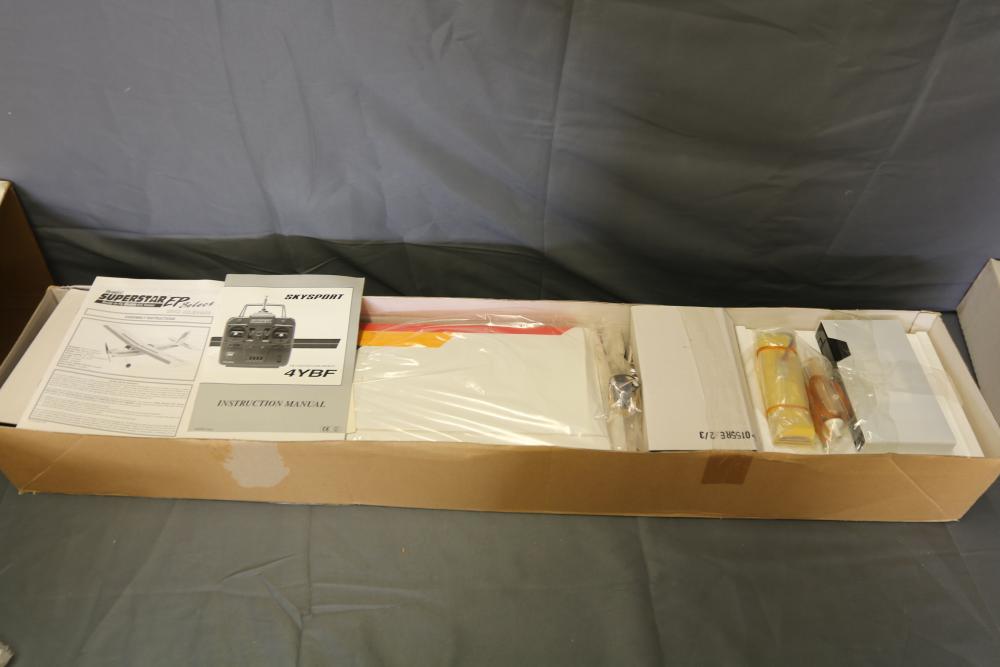 Hobbico Superstar EP Select ready-to-fly electric R/C trainer with factory-built components, electric motor, and Futaba 4-channel radio system. Includes manual and original packaging. Also includes Tumblewatt aerobatic fun fly model kit with a 26.75-inch wingspan, laser-cut parts, and packaging.