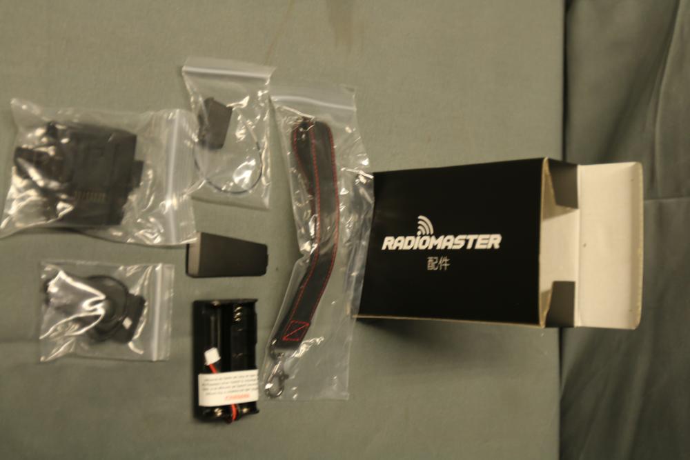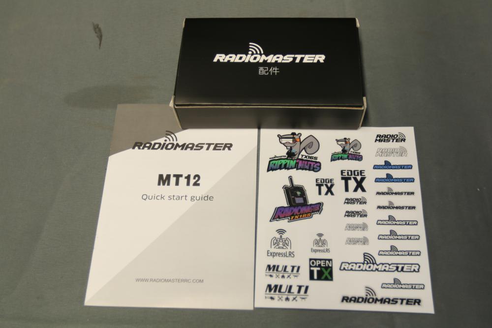 Radiomaster MT12 remote controller, complete with carrying case, USB cable, quick start guide, and various accessories, including a neck strap, replacement parts, and tools. Components are securely packaged and appear unused.