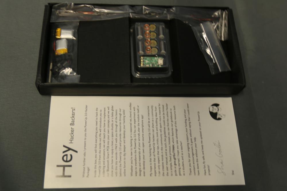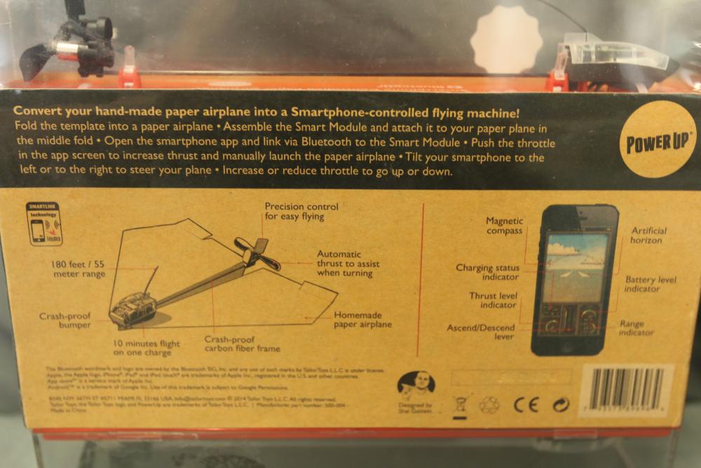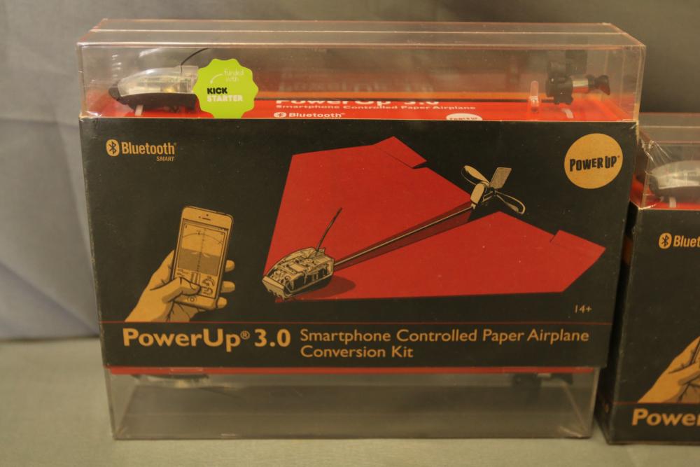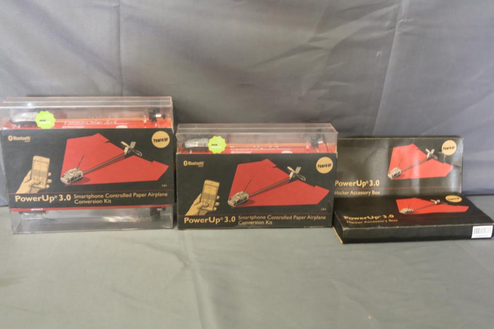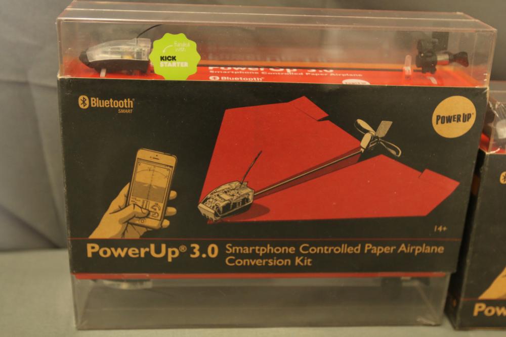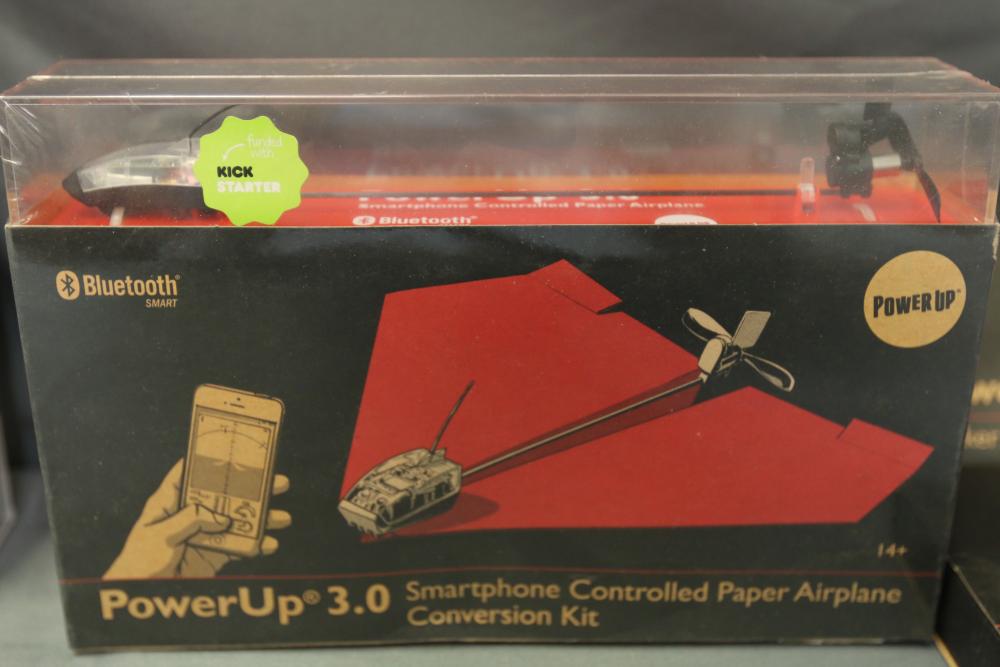 PowerUp 3.0 package includes multiple smartphone-controlled paper airplane conversion kits and a hacker accessory box. Kits feature Smart Modules, Bluetooth connectivity, and hardware for assembling paper airplanes with smartphone control capabilities. Includes batteries and instructional materials.