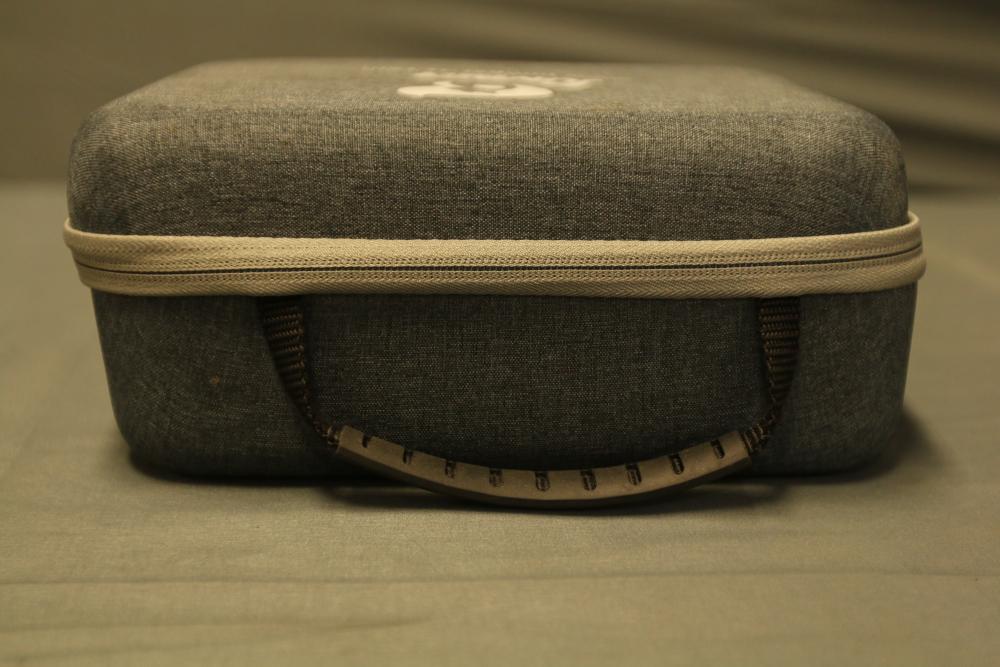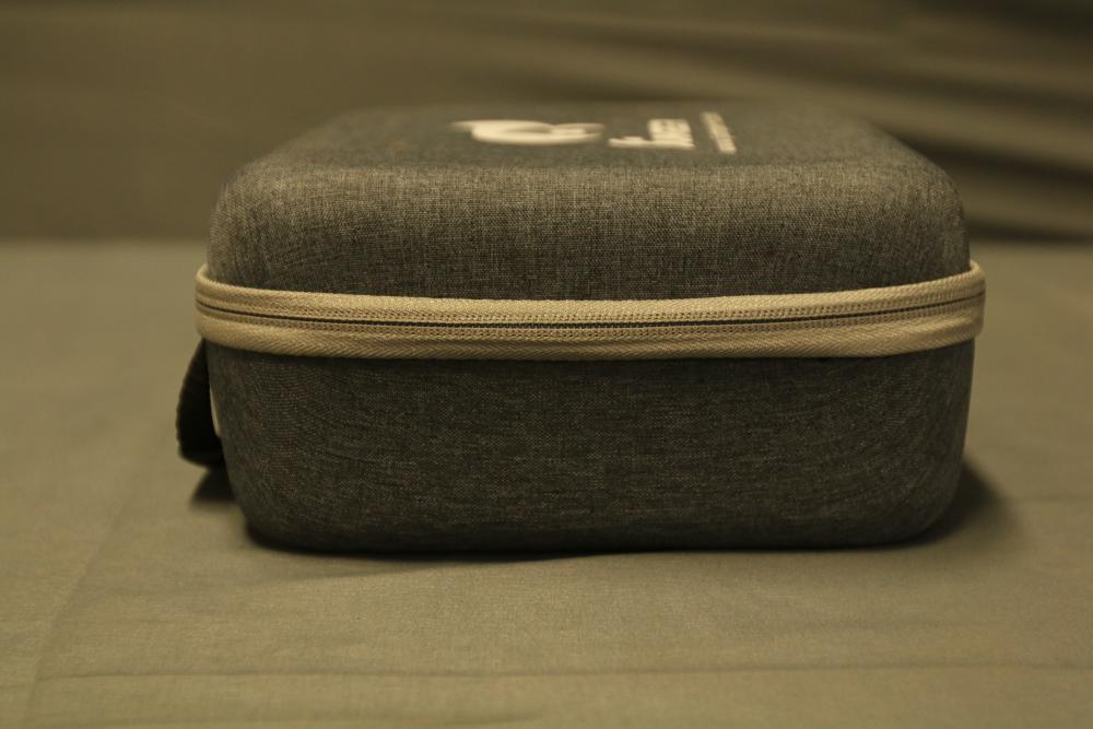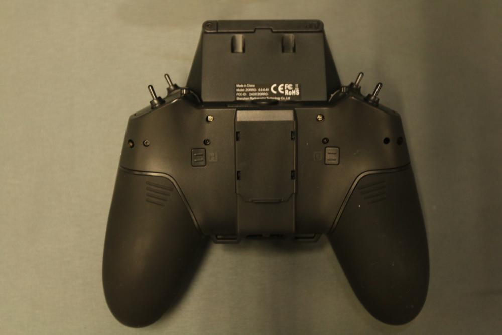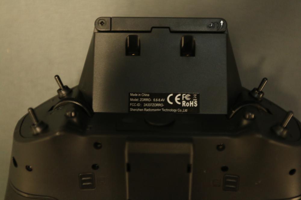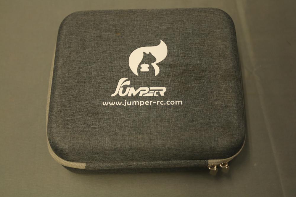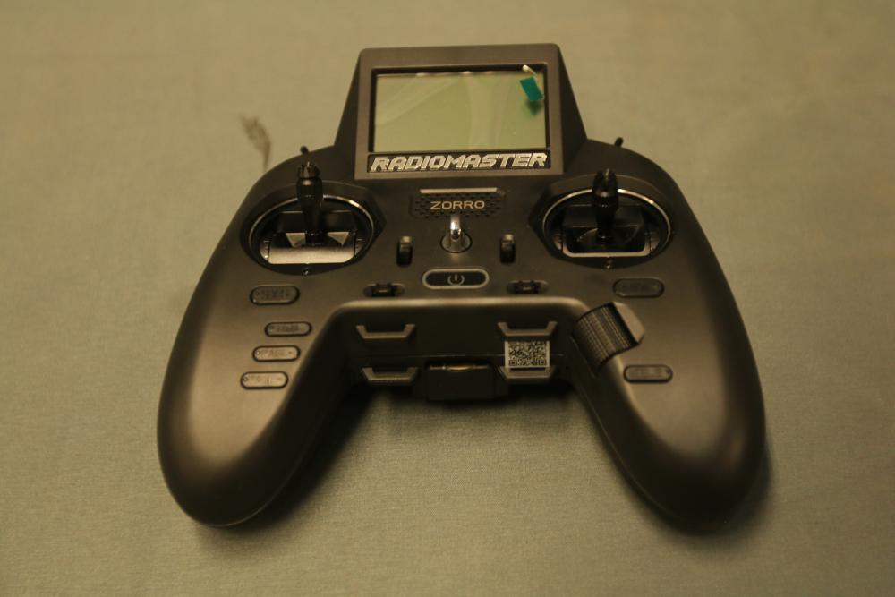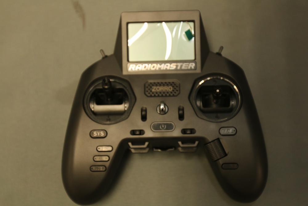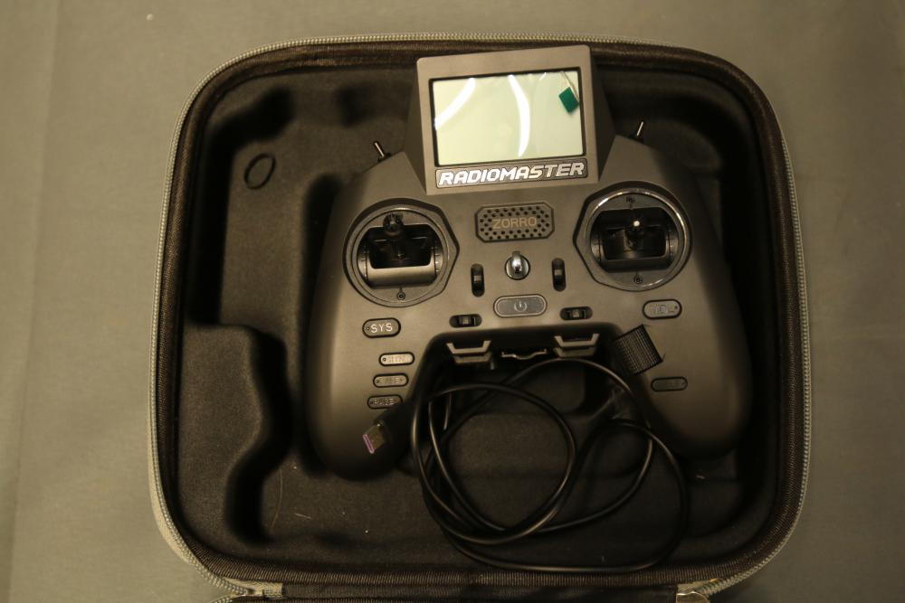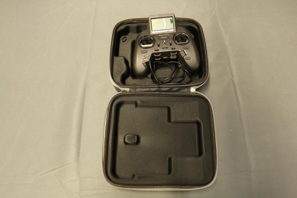 Radiomaster Zorro remote controller featuring a compact design and ergonomic grip. Includes a protective carrying case with zipper closure, foam interior for secure storage, and a USB cable. The controller is equipped with a display screen and various control buttons for operation.