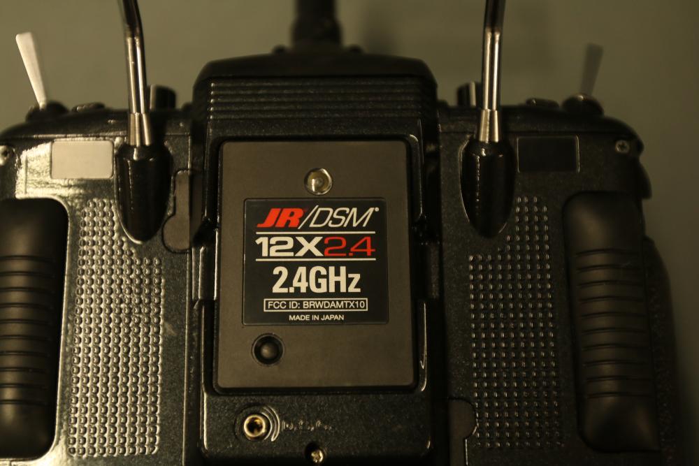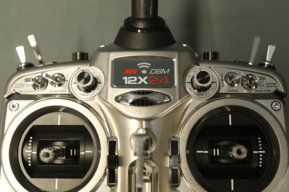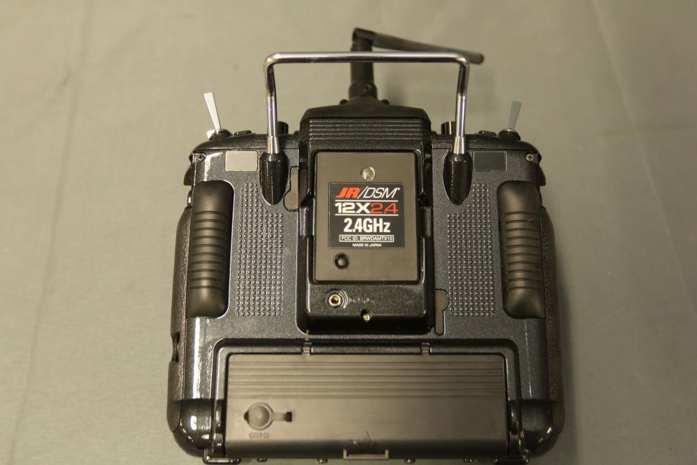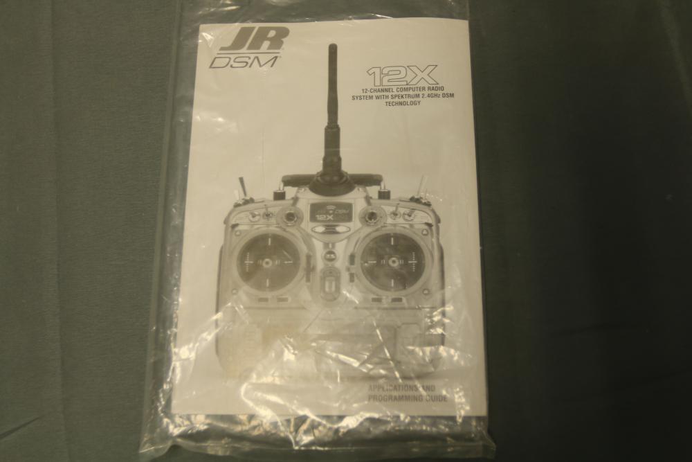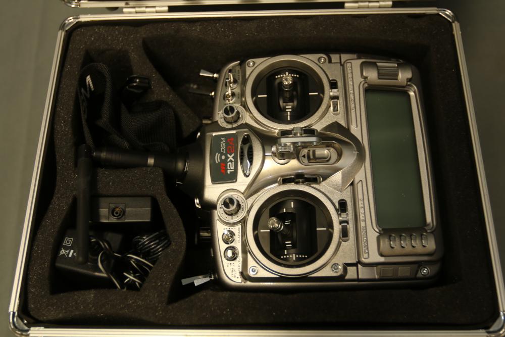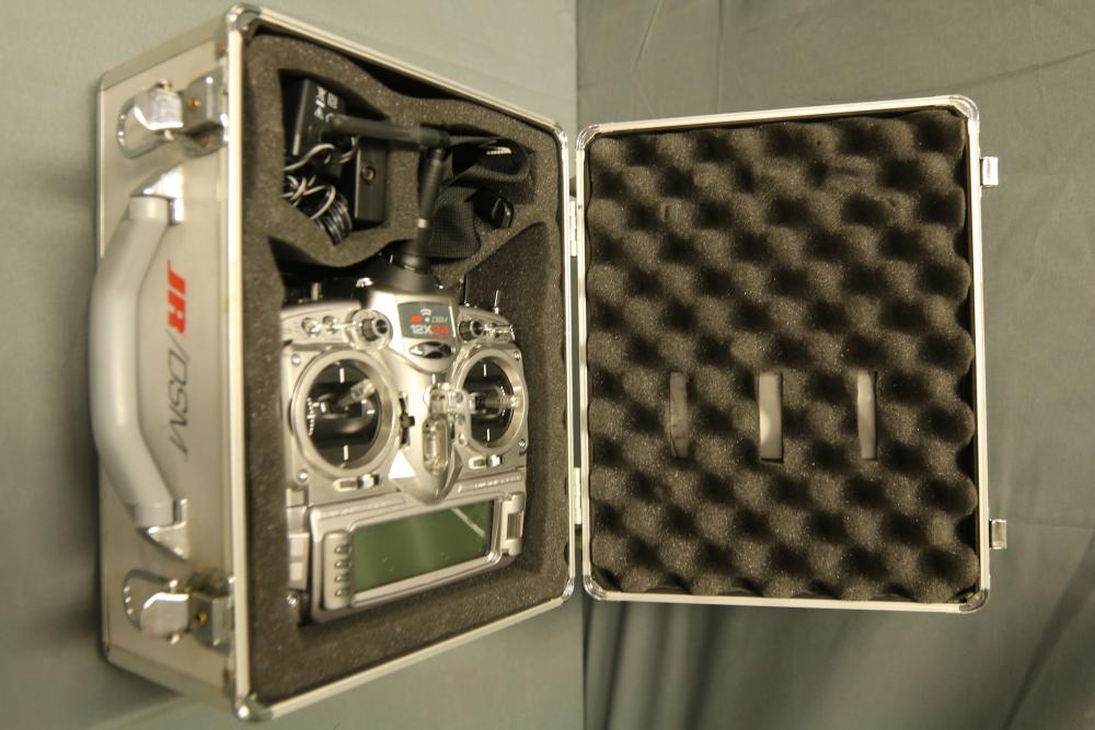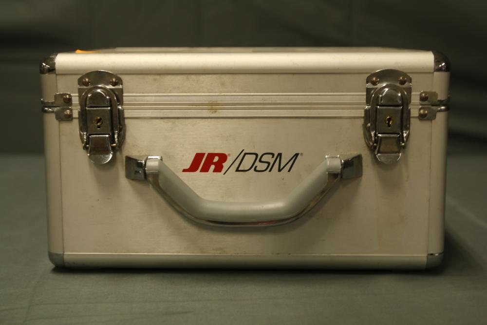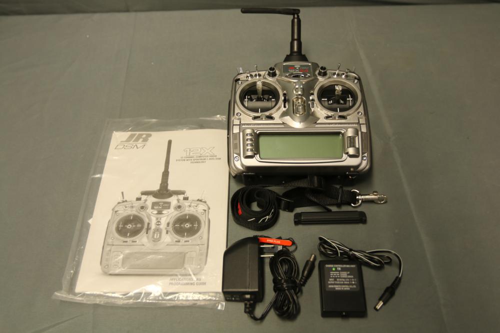 JR DSM 12X 2.4GHz transmitter with dual coaxial diversity system and backlit LCD screen. Includes metal carrying case with foam insert, charge controller, neck strap, bind plug, and user manual.