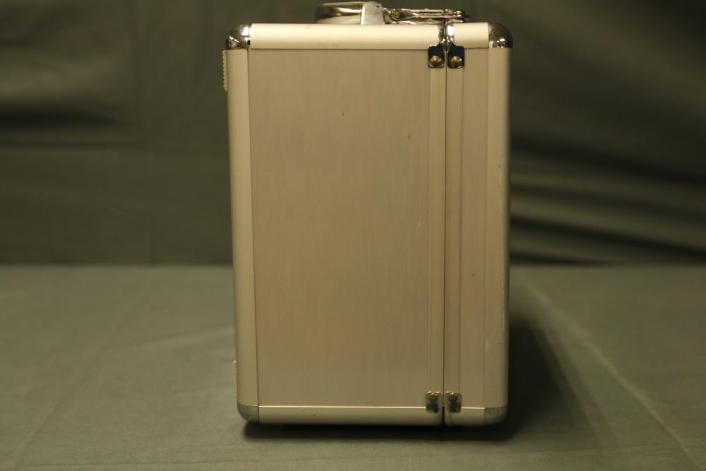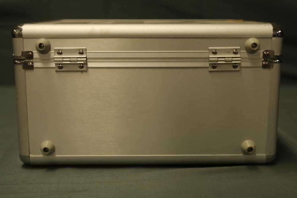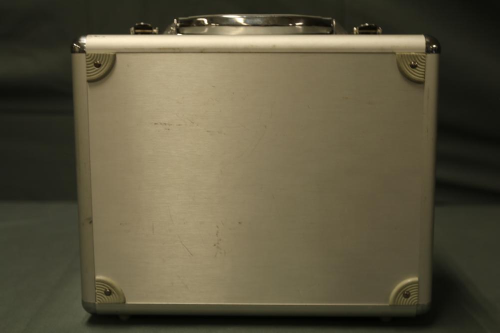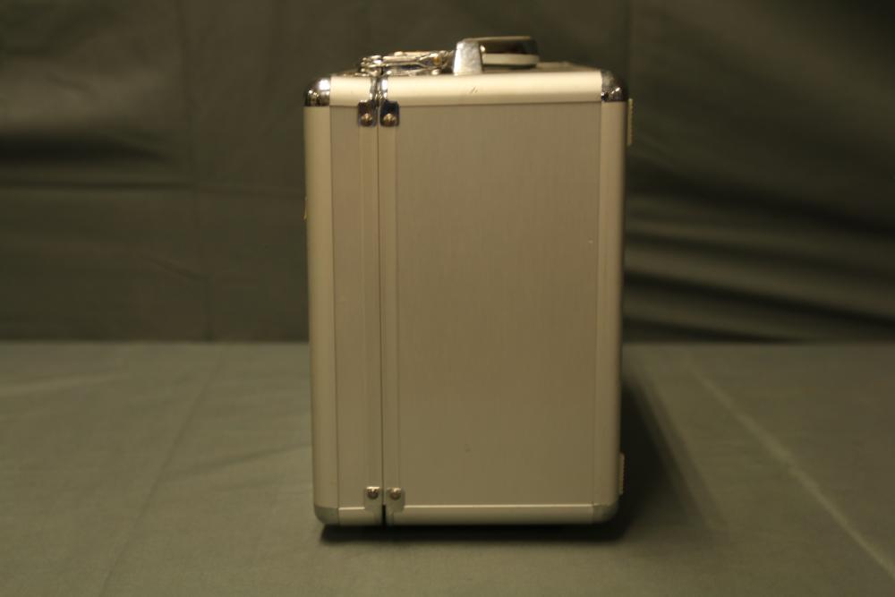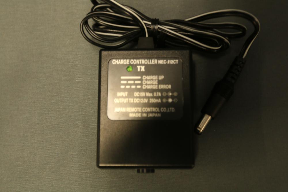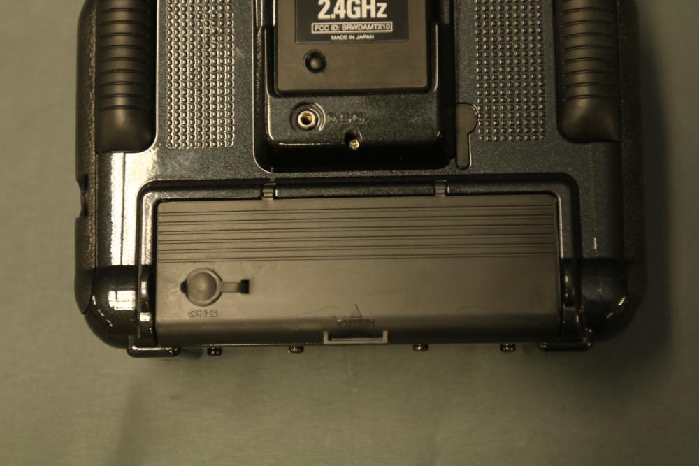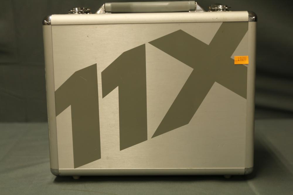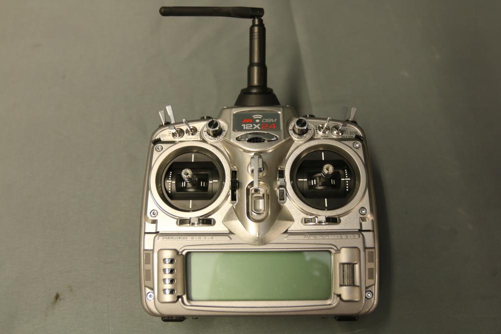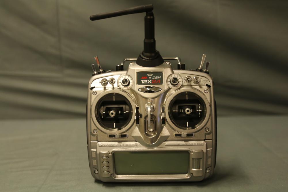 JR DSM 12X 2.4GHz transmitter with dual coaxial diversity system and backlit LCD screen. Includes metal carrying case with foam insert, charge controller, neck strap, bind plug, and user manual.