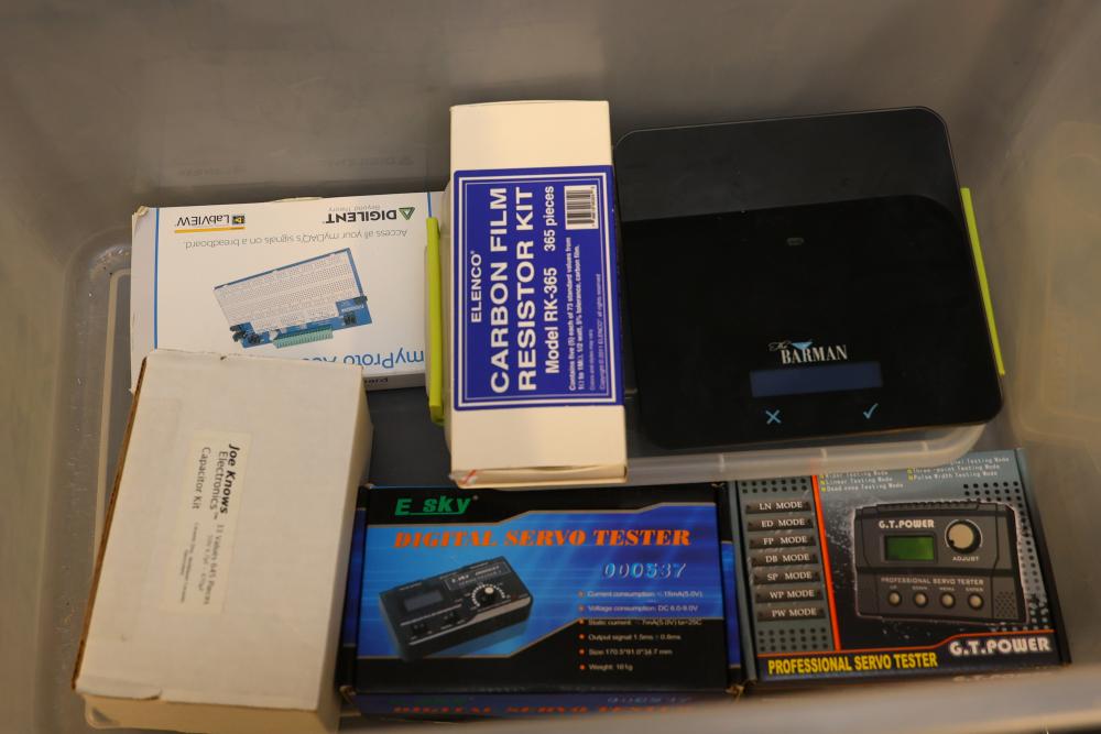 Includes a Peak magnifying tool set, stroboscope DS2239, calibration certificate, various testers such as digital servo testers, a capacitor kit with 645 pieces, a USB digital microscope, a breadboard accessory board, and a rechargeable battery pack. The lot also contains a headband magnifier and multiple boxed accessories for electronics use. Items appear to include manuals and packaging where applicable. Pickup only.