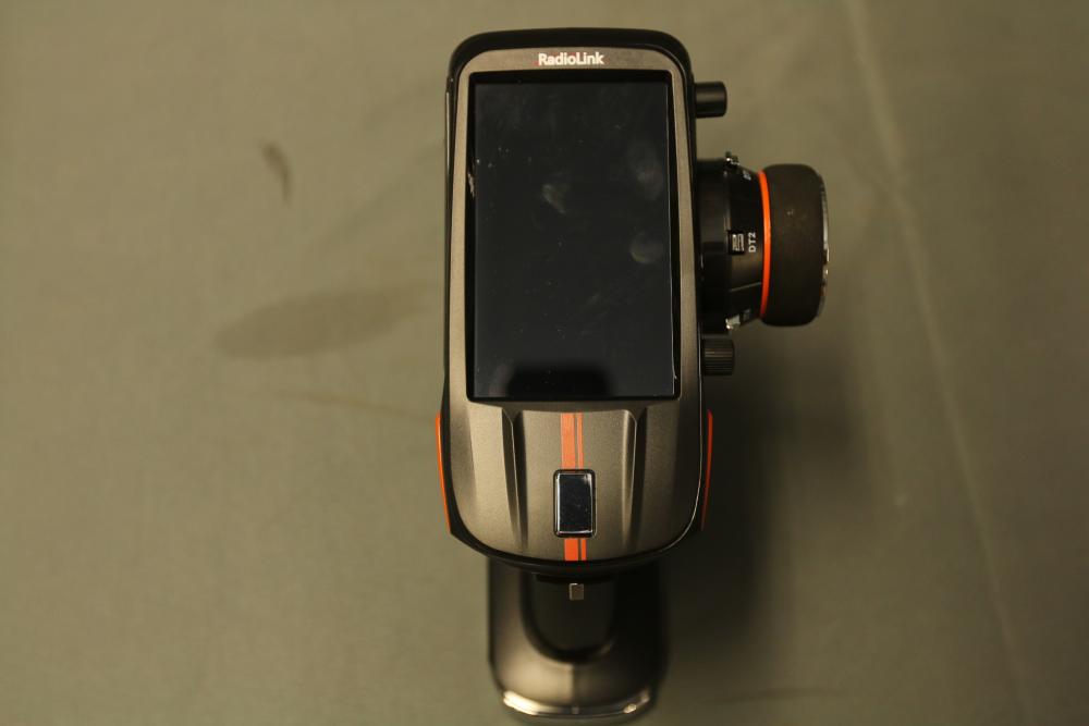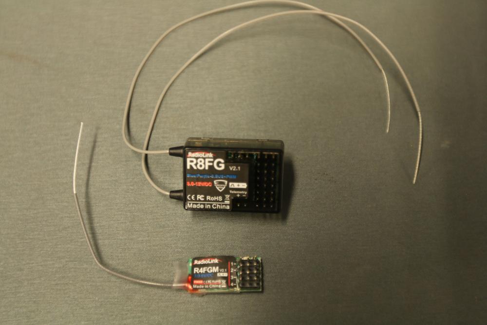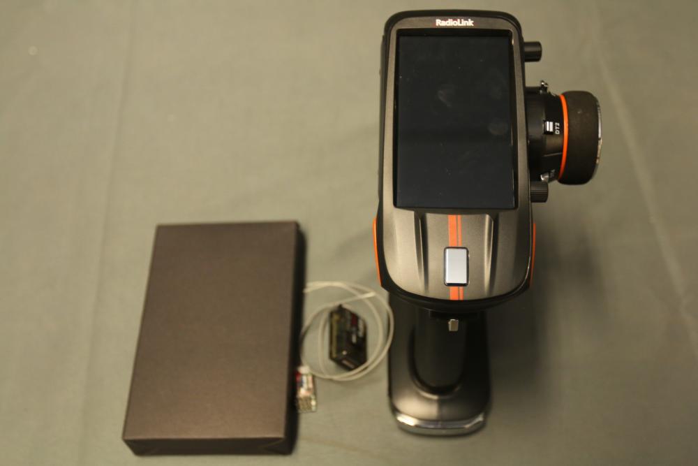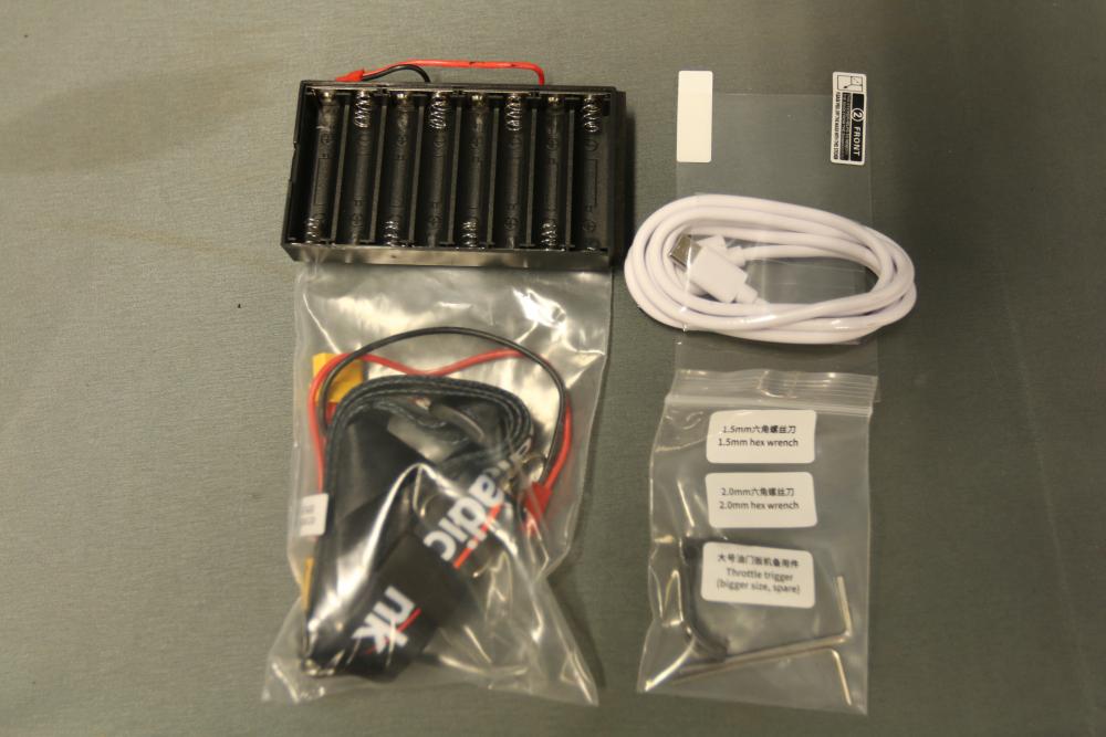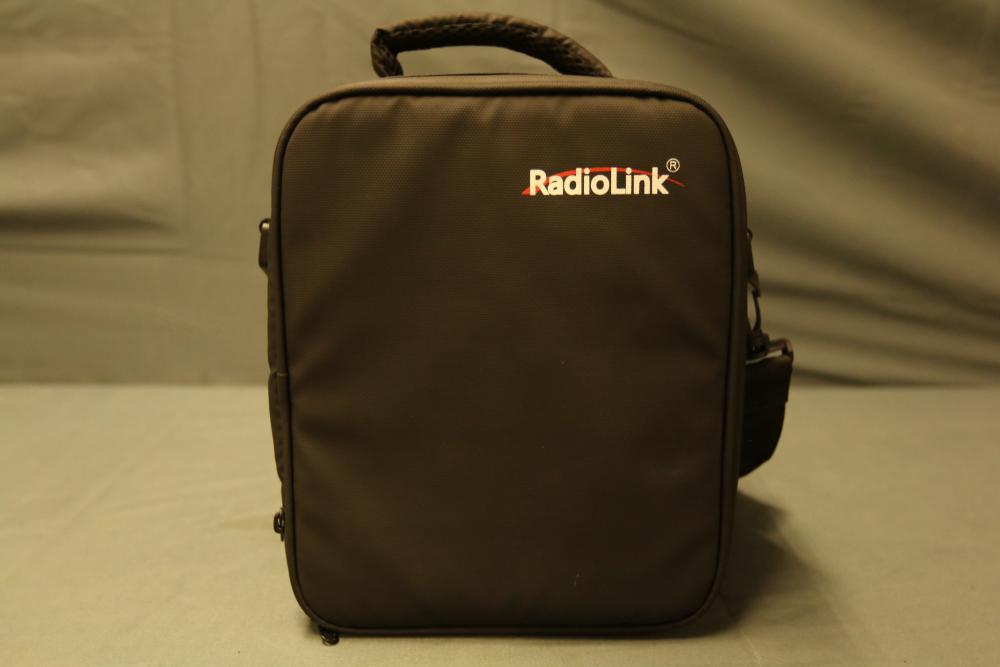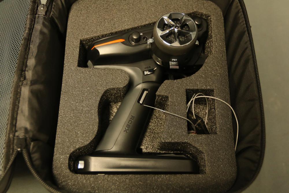 RadioLink transmitter with integrated screen, ergonomic design, and a detachable controller wheel. Includes an R8FG and R4FGM receiver, a battery holder, cables, and additional accessories. Packaged in a soft-sided carrying case with interior mesh compartments and foam cutouts for secure storage.