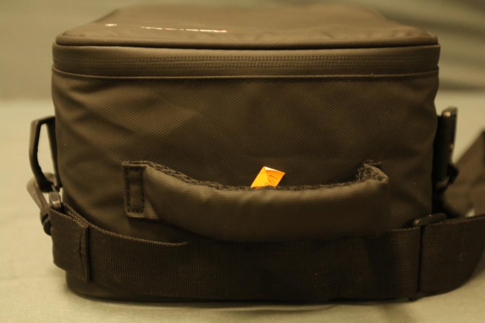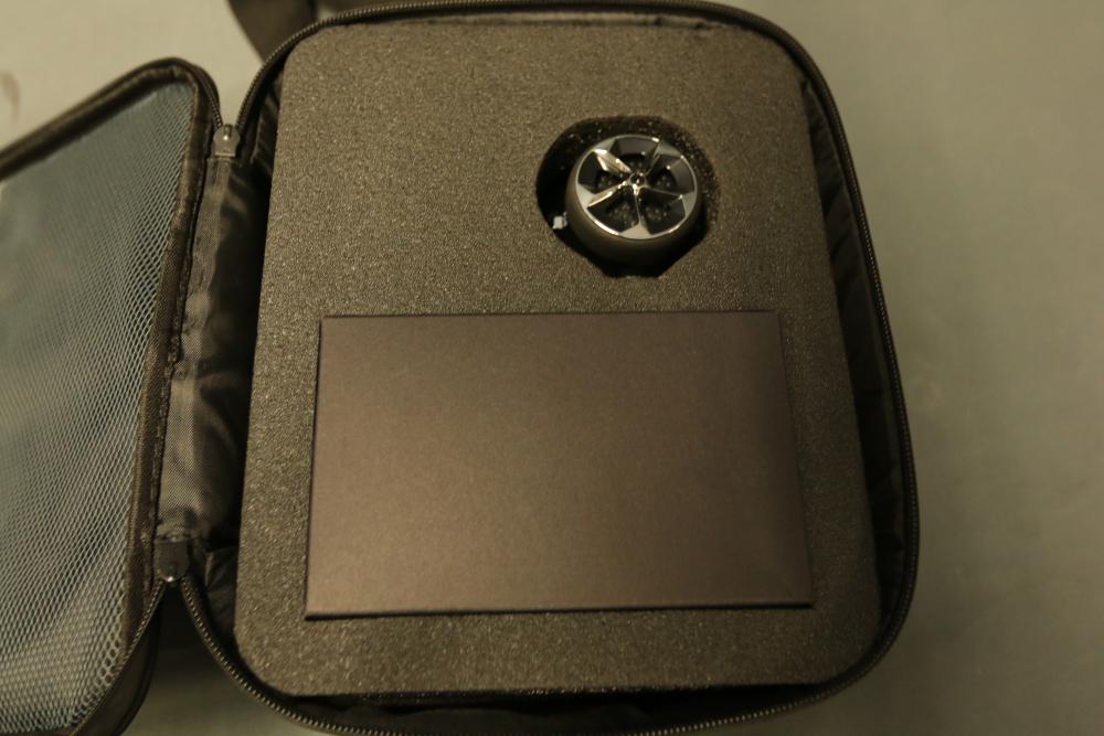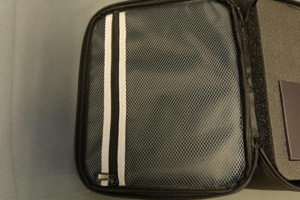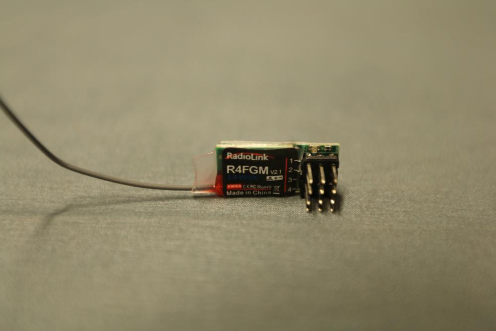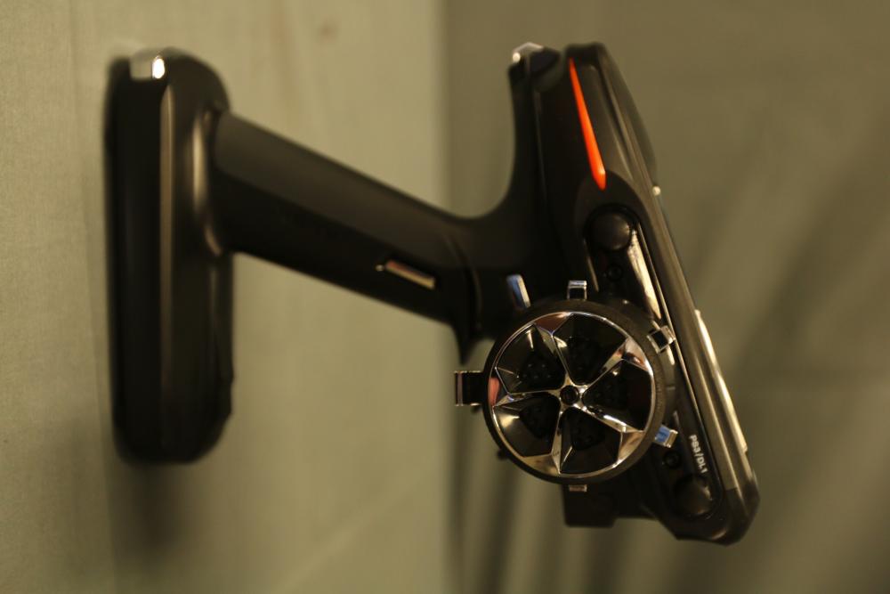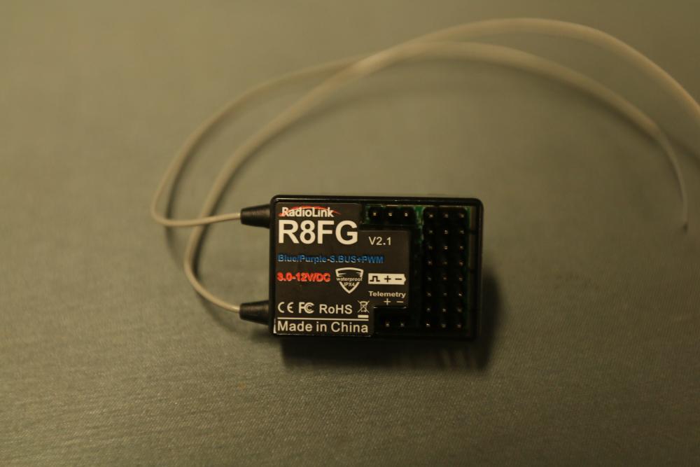 RadioLink transmitter with integrated screen, ergonomic design, and a detachable controller wheel. Includes an R8FG and R4FGM receiver, a battery holder, cables, and additional accessories. Packaged in a soft-sided carrying case with interior mesh compartments and foam cutouts for secure storage.