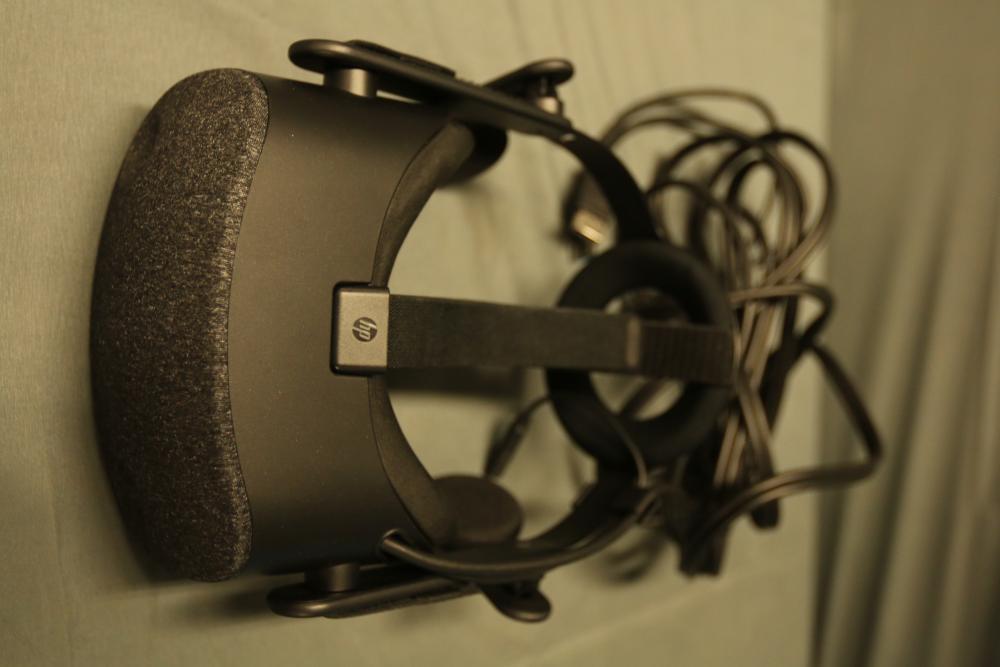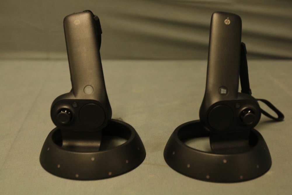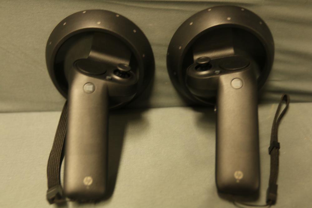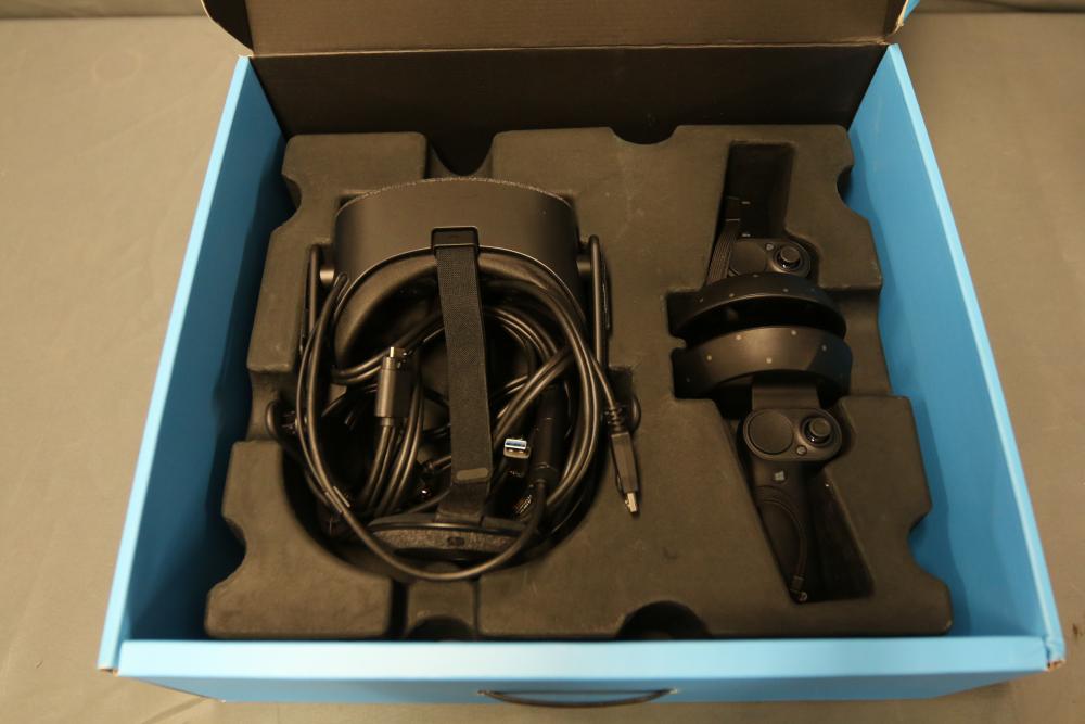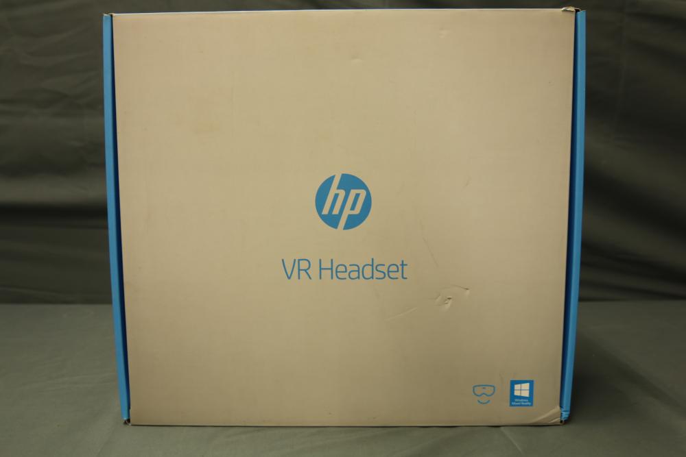 HP VR Headset includes a VR unit, two hand controllers, various connecting cables, and adapters, packaged in its original box.