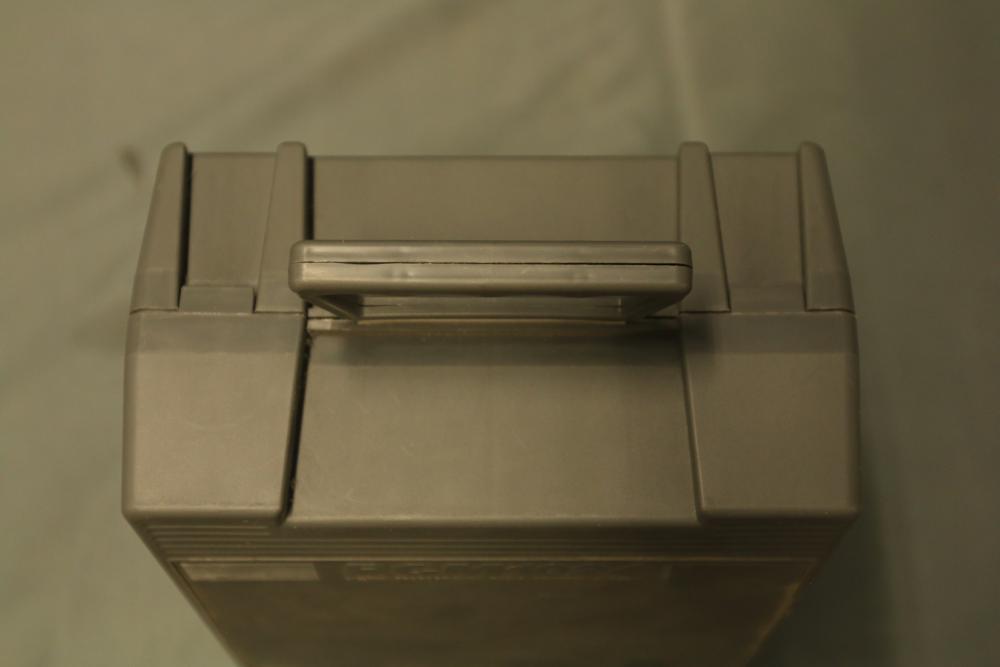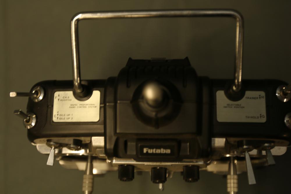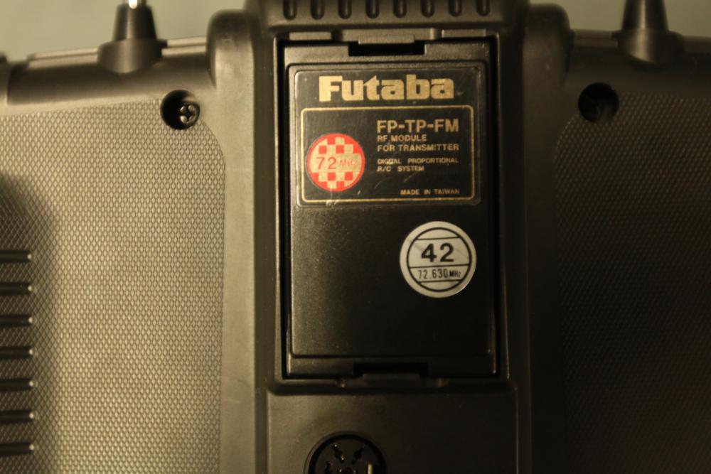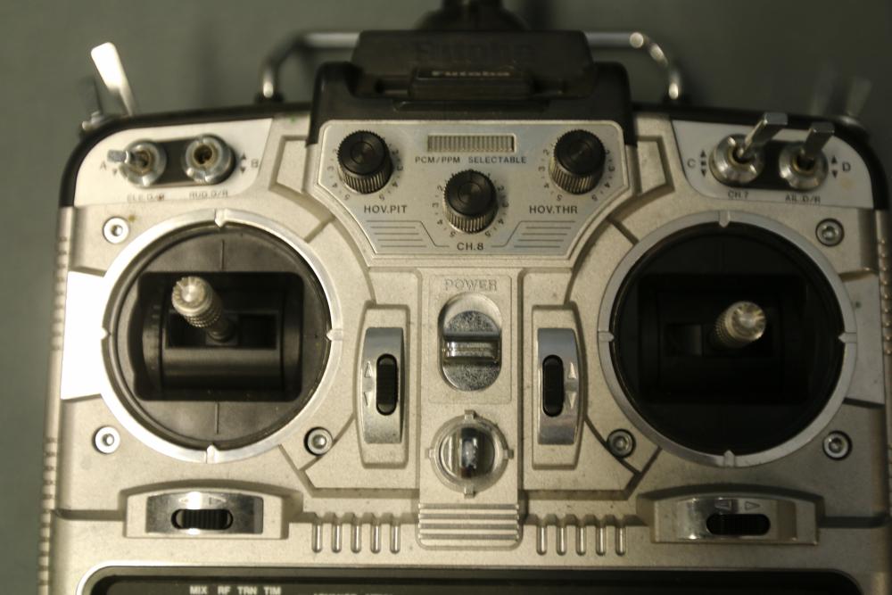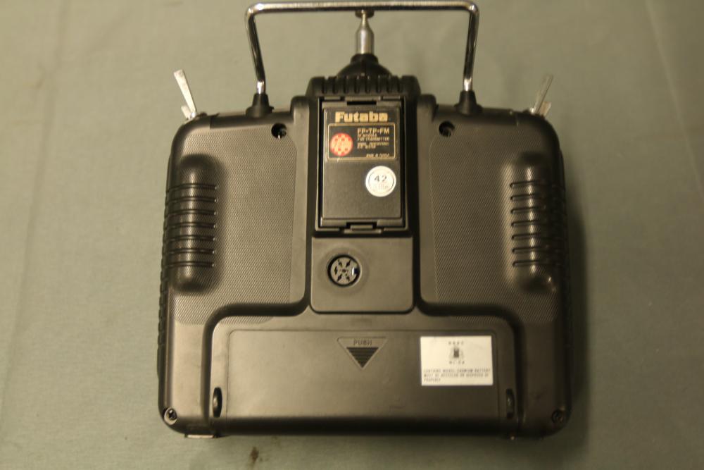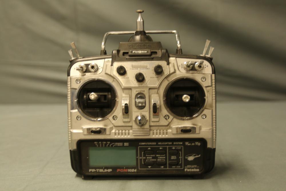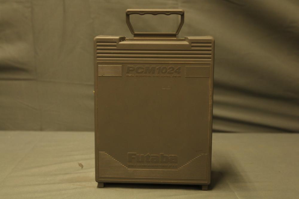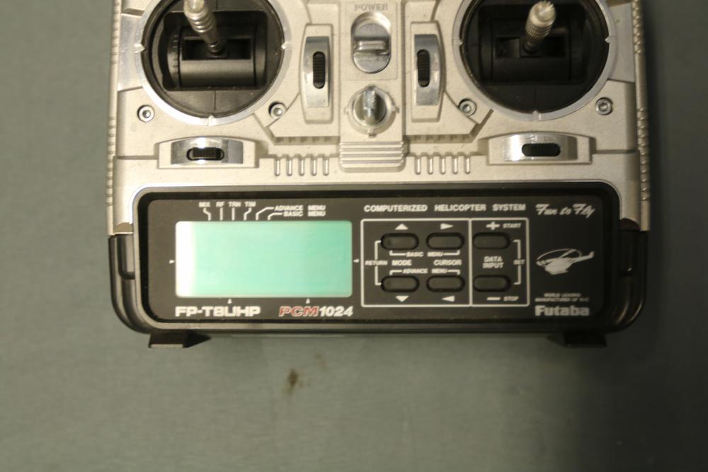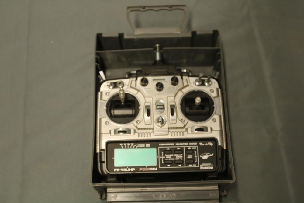 Futaba PCM1024 FP-T8UHP transmitter featuring a computerized helicopter system and FP-TP-FM RF module. Includes carrying case with built-in handle for portability. The transmitter is equipped with dual control sticks, multiple switches, and a digital interface. Overall condition and functionality are unverified. Normal signs of use are visible.
